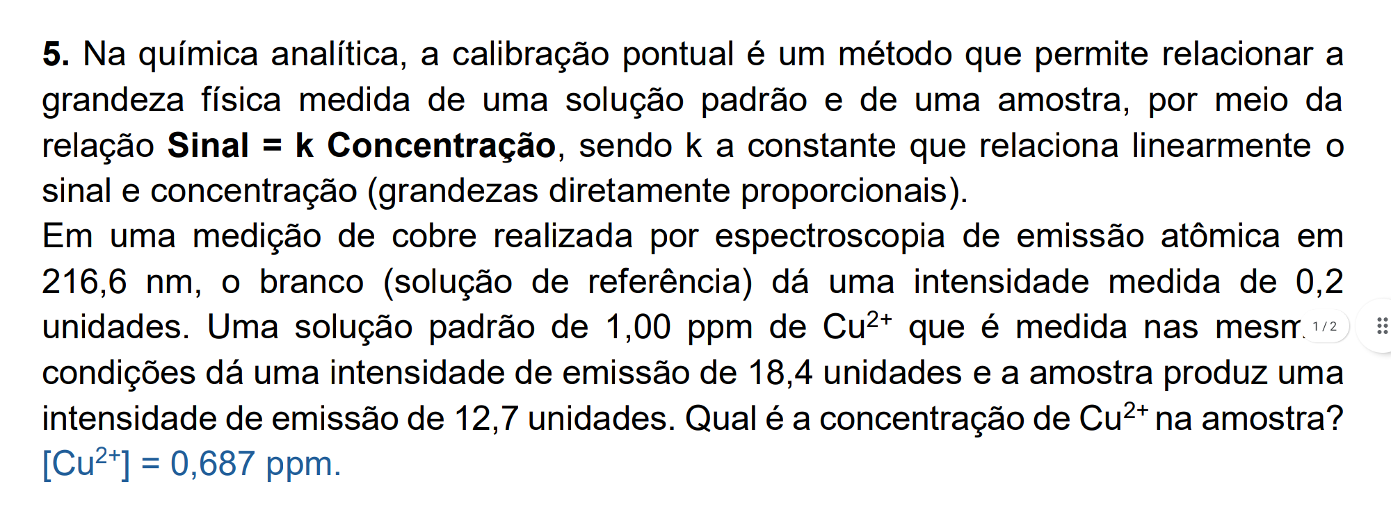 5. Na química analítica, a calibração pontual é um método que permite relacionar a grandeza física medida de uma solução padrão e de uma amostra, por meio da relação Sinal = k Concentração, sendo k a constante que relaciona linearmente o sinal e concentração (grandezas diretamente proporcionais). Em uma medição de cobre realizada por espectroscopia de emissão atômica em 216,6 nm, o branco (solução de referência) dá uma intensidade medida de 0,2 unidades. Uma solução padrão de 1,00 ppm de que é medida nas mesm. 1/2 condições dá uma intensidade de emissão de 18,4 unidades e a amostra produz uma intensidade de emissão de 12,7 unidades. Qual é a concentração de na amostra? = 0,687 ppm.