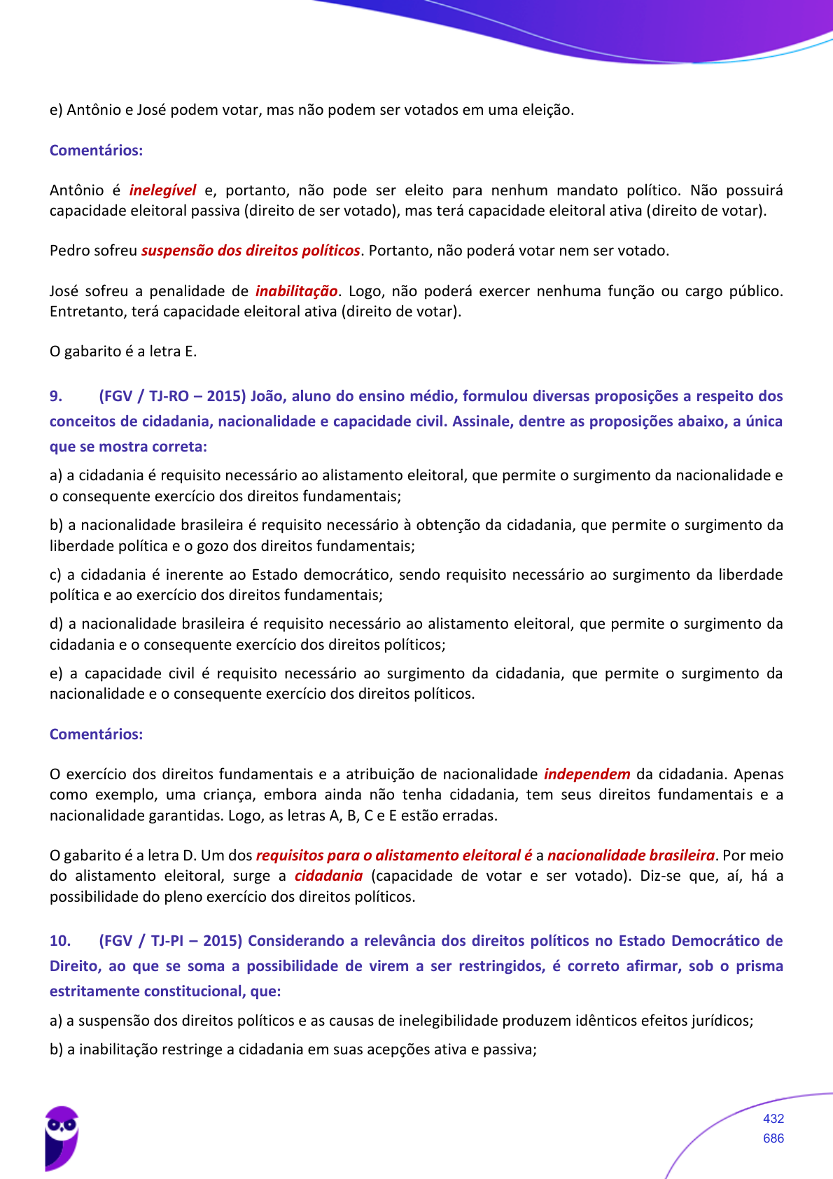 e) Antônio e José podem votar, mas não podem ser votados em uma eleição. Comentários: Antônio é inelegível e, portanto, não pode ser eleito para nenhum mandato político. Não possuirá capacidade eleitoral passiva (direito de ser votado), mas terá capacidade eleitoral ativa (direito de votar). Pedro sofreu suspensão dos direitos políticos. Portanto, não poderá votar nem ser votado. José sofreu a penalidade de inabilitação. Logo, não poderá exercer nenhuma função ou cargo público. Entretanto, terá capacidade eleitoral ativa (direito de votar). O gabarito é a letra E. 9. (FGV / TJ-RO – 2015) João, aluno do ensino médio, formulou diversas proposições a respeito dos conceitos de cidadania, nacionalidade e capacidade civil. Assinale, dentre as proposições abaixo, a única que se mostra correta: a) a cidadania é requisito necessário ao alistamento eleitoral, que permite o surgimento da nacionalidade e o consequente exercício dos direitos fundamentais; b) a nacionalidade brasileira é requisito necessário à obtenção da cidadania, que permite o surgimento da liberdade política e o gozo dos direitos fundamentais; c) a cidadania é inerente ao Estado democrático, sendo requisito necessário ao surgimento da liberdade política e ao exercício dos direitos fundamentais; d) a nacionalidade brasileira é requisito necessário ao alistamento eleitoral, que permite o surgimento da cidadania e o consequente exercício dos direitos políticos; e) a capacidade civil é requisito necessário ao surgimento da cidadania, que permite o surgimento da nacionalidade e o consequente exercício dos direitos políticos. Comentários: O exercício dos direitos fundamentais e a atribuição de nacionalidade independem da cidadania. Apenas como exemplo, uma criança, embora ainda não tenha cidadania, tem seus direitos fundamentais e a nacionalidade garantidas. Logo, as letras A, B, C e E estão erradas. O gabarito é a letra D. Um dos requisitos para o alistamento eleitoral é a nacionalidade brasileira. Por meio do alistamento eleitoral, surge a cidadania (capacidade de votar e ser votado). Diz-se que, aí, há a possibilidade do pleno exercício dos direitos políticos. 10. (FGV / TJ-PI – 2015) Considerando a relevância dos direitos políticos no Estado Democrático de Direito, ao que se soma a possibilidade de virem a ser restringidos, é correto afirmar, sob o prisma estritamente constitucional, que: a) a suspensão dos direitos políticos e as causas de inelegibilidade produzem idênticos efeitos jurídicos; b) a inabilitação restringe a cidadania em suas acepções ativa e passiva; Equipe Direito Constitucional Estratégia Concursos Aula 01 - Questões Comentadas Questões Comentadas de Direito Constitucional (FGV, FCC e CEBRASPE) Em PDF - Cartão 12x! www.estrategiaconcursos.com.br 432 686 ==6b6== Equipe Direito Constitucional Estratégia Concursos Aula 01 - Questões Comentadas Questões Comentadas de Direito Constitucional (FGV, FCC e CEBRASPE) Em PDF - Cartão 12x! www.estrategiaconcursos.com.br 02253235164 - Julia Gabryely c) a suspensão dos direitos políticos somente restringe a cidadania em sua acepção ativa; d) as causas de inelegibilidade produzem restrições mais amplas que a suspensão dos direitos políticos; e) a inabilitação produz efeitos mais amplos que as causas de inelegibilidade. Comentários: Letra A: errada. A suspensão dos direitos políticos obsta o exercício da capacidade eleitoral ativa (direito de votar) e da capacidade eleitoral passiva (direito de ser votado). Já a inelegibilidade, apenas impede o exercício da capacidade eleitoral passiva (direito de ser votado). Letra B: errada. A inabilitação impede o exercício de qualquer cargo ou função pública, mas não obsta o exercício do direito de voto (capacidade eleitoral ativa). Letra C: errada. A suspensão dos direitos políticos restringe as dimensões ativa e passiva da cidadania. Letra D: errada. A suspensão dos direitos políticos produz restrições mais amplas do que as causas de inelegibilidade. Isso porque a suspensão dos direitos políticos afeta as dimensões ativa e passiva da cidadania, ao passo que as causas de inelegibilidade afetam apenas a dimensão passiva. Letra E: correta. É isso mesmo. A inabilitação produz efeitos mais amplos que as causas de inelegibilidade. Aquele que sofre a penalidade de inabilitação não poderá exercer nenhum cargo ou função pública, o que engloba cargos efetivos, cargos em comissão e mandatos eletivos. Por outro lado, o inelegível somente não poderá ocupar mandato eletivo. O gabarito é a letra E. Equipe Direito Constitucional Estratégia Concursos Aula 01 - Questões Comentadas Questões Comentadas de Direito Constitucional (FGV, FCC e CEBRASPE) Em PDF - Cartão 12x! www.estrategiaconcursos.com.br 433 686 Equipe Direito Constitucional Estratégia Concursos Aula 01 - Questões Comentadas Questões Comentadas de Direito Constitucional (FGV, FCC e CEBRASPE) Em PDF - Cartão 12x! www.estrategiaconcursos.com.br 02253235164 - Julia Gabryely QUESTÕES COMENTADAS Partidos Políticos 1. (CESPE / TCE-MG – 2018 - ADAPTADA) De acordo com a Constituição Federal de 1988, é assegurada a todos os partidos políticos: a) a aquisição de personalidade jurídica na forma da lei civil. b) a vinculação entre candidaturas em âmbito nacional, estadual, distrital ou municipal. c) a utilização de organização paramilitar. d) a recepção de recursos financeiros de entidade estrangeira, desde que declarados. Comentários: Letra A: correta. A Carta Magna assegura que “os partidos políticos, após adquirirem personalidade jurídica, na forma da lei civil, registrarão seus estatutos no Tribunal Superior Eleitoral” (art. 17, § 2º, CF). Letra B: errada. Não há obrigatoriedade de vinculação entre as candidaturas em âmbito nacional, estadual, distrital ou municipal. Letra C: errada. É vedada a utilização pelos partido