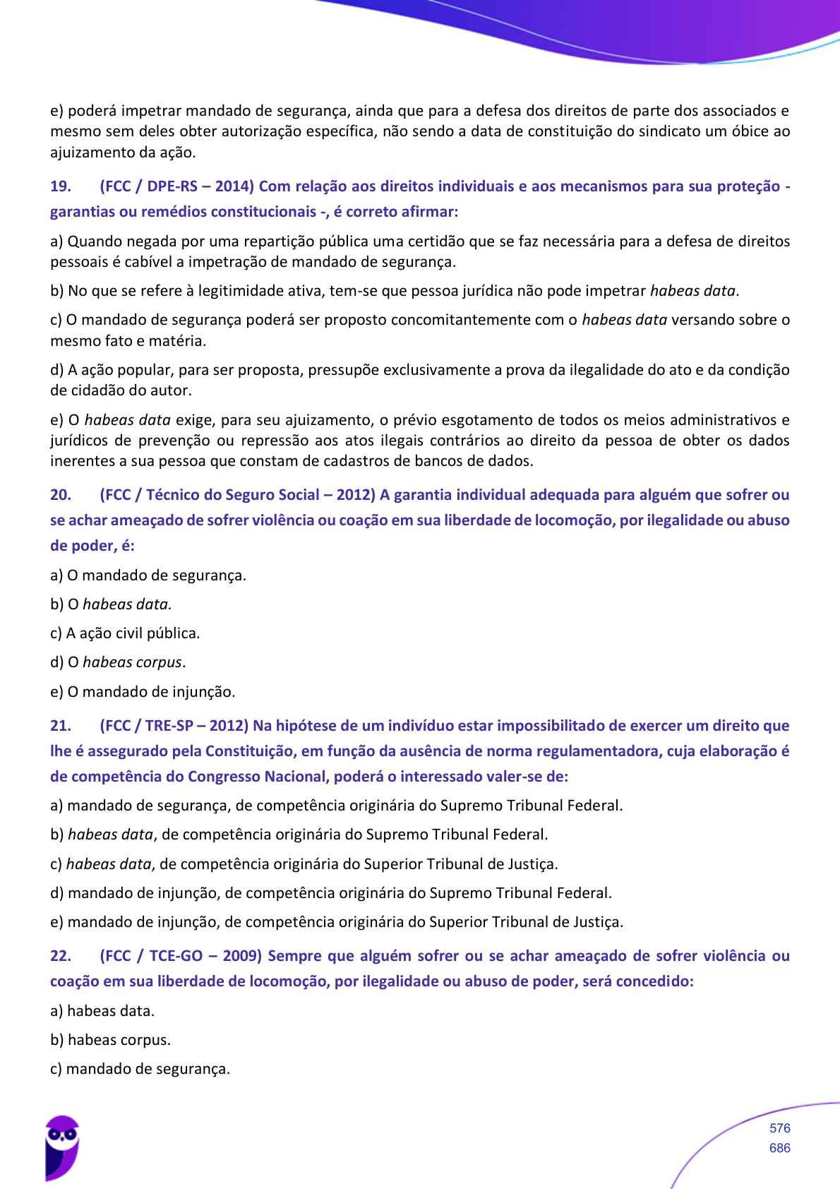 e) poderá impetrar mandado de segurança, ainda que para a defesa dos direitos de parte dos associados e mesmo sem deles obter autorização específica, não sendo a data de constituição do sindicato um óbice ao ajuizamento da ação. 19. (FCC / DPE-RS – 2014) Com relação aos direitos individuais e aos mecanismos para sua proteção - garantias ou remédios constitucionais -, é correto afirmar: a) Quando negada por uma repartição pública uma certidão que se faz necessária para a defesa de direitos pessoais é cabível a impetração de mandado de segurança. b) No que se refere à legitimidade ativa, tem-se que pessoa jurídica não pode impetrar habeas data. c) O mandado de segurança poderá ser proposto concomitantemente com o habeas data versando sobre o mesmo fato e matéria. d) A ação popular, para ser proposta, pressupõe exclusivamente a prova da ilegalidade do ato e da condição de cidadão do autor. e) O habeas data exige, para seu ajuizamento, o prévio esgotamento de todos os meios administrativos e jurídicos de prevenção ou repressão aos atos ilegais contrários ao direito da pessoa de obter os dados inerentes a sua pessoa que constam de cadastros de bancos de dados. 20. (FCC / Técnico do Seguro Social – 2012) A garantia individual adequada para alguém que sofrer ou se achar ameaçado de sofrer violência ou coação em sua liberdade de locomoção, por ilegalidade ou abuso de poder, é: a) O mandado de segurança. b) O habeas data. c) A ação civil pública. d) O habeas corpus. e) O mandado de injunção. 21. (FCC / TRE-SP – 2012) Na hipótese de um indivíduo estar impossibilitado de exercer um direito que lhe é assegurado pela Constituição, em função da ausência de norma regulamentadora, cuja elaboração é de competência do Congresso Nacional, poderá o interessado valer-se de: a) mandado de segurança, de competência originária do Supremo Tribunal Federal. b) habeas data, de competência originária do Supremo Tribunal Federal. c) habeas data, de competência originária do Superior Tribunal de Justiça. d) mandado de injunção, de competência originária do Supremo Tribunal Federal. e) mandado de injunção, de competência originária do Superior Tribunal de Justiça. 22. (FCC / TCE-GO – 2009) Sempre que alguém sofrer ou se achar ameaçado de sofrer violência ou coação em sua liberdade de locomoção, por ilegalidade ou abuso de poder, será concedido: a) habeas data. b) habeas corpus. c) mandado de segurança. Equipe Direito Constitucional Estratégia Concursos Aula 01 - Questões Comentadas Questões Comentadas de Direito Constitucional (FGV, FCC e CEBRASPE) Em PDF - Cartão 12x! www.estrategiaconcursos.com.br 576 686 Equipe Direito Constitucional Estratégia Concursos Aula 01 - Questões Comentadas Questões Comentadas de Direito Constitucional (FGV, FCC e CEBRASPE) Em PDF - Cartão 12x! www.estrategiaconcursos.com.br 02253235164 - Julia Gabryely d) pedido liminar em ação popular. e) mandado de injunção 23. (FCC / TRF 5ª Região – 2008) É direito e garantia fundamental do cidadão que está sofrendo violência em sua liberdade de locomoção, por ilegalidade ou abuso de poder, se valer do: a) habeas corpus. b) mandado de segurança. c) mandado de injunção. d) habeas data. e) juízo ou tribunal de exceção. 24. (FCC / TCE-AM – 2007) Ameaça ou ato lesivo à liberdade de locomoção podem ser combatidos judicialmente por: a) mandado de segurança. b) mandado de injunção. c) habeas corpus. d) habeas data. e) ação popular. 25. (FCC / DPE-SP – 2010) Dentre os requisitos constitucionalmente estabelecidos para o cabimento do mandado de segurança inclui-se: a) Ameaça à liberdade de locomoção. b) Ausência de norma regulamentadora de direitos e liberdades constitucionais. c) Recusa de fornecimento de informações constantes de bancos de dados do governo relativas ao lesado. d) Ato lesivo, desde que, ao meio ambiente e ao patrimônio histórico e cultural. e) Ofensa a direito líquido e certo do lesado, não amparado por habeas corpus ou habeas data. 26. (FCC / TRE-MG – 2005) No mandado de segurança preventivo: a) inexiste a aplicação do prazo decadencial de cento e vinte dias. b) o prazo para a impetração é de cento e vinte dias e de natureza prescricional. c) o impetrante terá cento e oitenta dias para a impetração e o prazo é decadencial. d) o prazo para a impetração é de cento e vinte dias, podendo ocorrer sua suspensão ou interrupção. e) também incide o prazo prescricional de cento e vinte dias. 27. (FCC / TRT 2ª Região – 2004) Eu e mais três pessoas fomos aprovados nos quatro primeiros lugares em concurso público para provimento de cargo inicial de carreira no serviço público. Tomamos conhecimento pelo Diário Oficial de que o quinto classificado foi nomeado hoje. Fomos avisados pela Administração que seremos nomeados nos próximos dias. Nesse caso, se não nos conformarmos com a situação, poderemos impetrar um: Equipe Direito Constitucional Estratégia Concursos Aula 01 - Questões Comentadas Questões Comentadas de Direito Constitucional (FGV, FCC e CEBRASPE) Em PDF - Cartão 12x! www.estrategiaconcursos.com.br 577 686 Equipe Direito Constitucional Estratégia Concursos Aula 01 - Questões Comentadas Questões Comentadas de Direito Constitucional (FGV, FCC e CEBRASPE) Em PDF - Cartão 12x! www.estrategiaconcursos.com.br 02253235164 - Julia Gabryely a) mandado de segurança coletivo. b) mandado de injunção. c) habeas corpus. d) mandado de segurança. e) habeas data. 28. (FCC / TRE-AP – 2011) Segundo a Constituição Federal, o mandado de segurança coletivo pode ser impetrado por partido político com representação: a) no mínimo em dez Municípios localizados num único Estado. b) na Câmara de Vereadores do Município onde está localizada sua sede. c) na Assembleia Legislativa do Estado onde está localizada sua sede. d) no mínimo com três Assembleias Legi