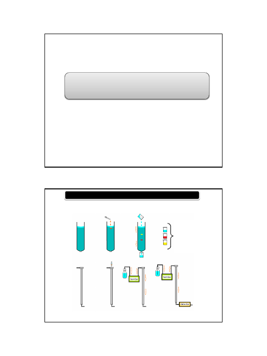 15/05/2012 1 Cromatografia Líquida de Alta Eficiência CLAE Prof. Cleiton Nunes DCA/UFLA Comparação CLC x CLAE coluna: ø 10cm x 0,5-1,0 m ø partícula 60-200μm reuso FE dificultado coluna: ø 4-10mm x 10-30 cm ø partícula 3-20 μm reuso FE facilitado injeção: conta-gotas injeção: seringa (3-10μl) eluição: gravidade demorada eluição: alta pressão rápida detecção: coleta manual outras técnicas detecção: automática detectores on-line gravimetria análise química análise espectral etc. 15/05/2012 2 Técnicas de separação em CLAE Adsorção (líquido-sólido) Principio de separação: competição de adsorção AN-FE por sítios na FE (polar) FE: sólido adsorvente Alumina – Al2O3 sílica – SiO2 FM: Hexano Metil-tercbutil-eter CHCl3 CH2Cl2 S L F.E F.M. Troca iônica Princípio de separação: atração entre íons do NA por sítios catiônicos/aniônicos na FE FE: matriz de polímero ou sílica com grupos catiônicos/aniônicos ligados FE troca catiônica: SO3 -, COO- FE troca aniônica: NR3 + FM: soluções tampão Técnicas de separação em CLAE F.E F.M. 15/05/2012 3 Técnicas de separação em CLAE poros F.E F.M. Exclusão molecular Princípio de separação: diferença de tamanho das moléculas de AN. Maiores eluem 1º FE: polímeros porosos. (PVA, poliacrilamida, S-DVB) FM: solvente orgânico - permeação em gel aquosa - filtração em gel F.E F.M. L L Partição (líquido-líquido) Princípio de separação: diferença de solubilidade AN entre FM/FE FE: FE líquida ligada à superfície do suporte (SiO2) FE polar FE apolar FM: MTBE, CHCl3, CH2Cl2, hexano FM: acetonitrila, MeOH, tetrahidrofurano, H2O Técnicas de separação em CLAE Mais usado 15/05/2012 4 Princípios de separação em CLAE FASE NORMAL FE – polar FM – apolar apolar polar FM mais usadas: Metil-tercbutil-eter Clorofórmio Diclorometano Hexano Princípios de separação em CLAE FASE REVERSA FE – apolar FM – polar polar apolar FM mais usadas: Acetonitrila Metanol Tetrahidrofurano Água 15/05/2012 5 Processo de eluição em CLAE Eluição isocrática Composição FM constante Eluição por gradiente Composição FM variada Polaridade FM varia com o tempo Melhora separação Diminui tempo de corrida Isocrática Gradiente 40% de CH3CN 30% de CH3CN 45% de CH3CN 80% de CH3CN Esquema para escolha de técnica CLAE 15/05/2012 6 Equipamento para CLAE Desgaseificação Elimina gases na FM Gases podem formar bolhas no sistema O2 pode oxidar a FM Fase Móvel Alto grau de pureza Dissolver a amostra sem a decompor Não dissolver ou decompor a fase estacionária Fase Móvel e Reservatório 15/05/2012 7 FUNÇÃO: proporcionar fluxo constante de FM pelo sistema Alta pressão Constante Reprodutível Controle do gradiente de FM CONDIÇÕES DE FUNCIONAMENTO: Pressões acima de 6000 PSI Fluxos de 0,1 a 10 mL/min Bombas BOMBAS RECÍPROCAS (MAIS USADAS) Consistem de um pequeno cilindro no qual o solvente é impelido pelo movimento de vai-vem de um pistão acionado por um motor. Duas válvulas se abrem e se fecham alternadamente controlando o fluxo do solvente para dentro e para fora do cilindro. Vantagem: Altas pressões de saída Desvantagem: Produzem fluxo pulsado Uso de pistões duplos reduz a pulsação Bombas 15/05/2012 8 BOMBAS DE SERINGA Consistem de uma câmara equipada com um êmbolo que é deslocado continuamente por um motor. O líquido contido na câmara é comprimido e flui para o sistema através de uma abertura. Vantagem: Fluxo livre de pulsações Desvantagem: Capacidade limitada de volume de solvente (~250mL) Bombas BOMBAS PNEUMÁTICAS Consistem de uma câmara equipada com um êmbolo ou não (gás inerte comprimido). O líquido contido na câmara é comprimido mediante pressão exercida por um êmbolo ou gás inerte e flui para o sistema através de uma abertura. Vantagem: Fluxo livre de pulsações Desvantagem: Capacidade limitada de volume de solvente e de pressão Bombas 15/05/2012 9 Sistema de injeção Volumes de injeção: 1 – 100 μL Reprodutibilidade alcançada pelo uso de alça de amostragem (loop) A introdução da amostra é realizada por um sistema de válvulas. Operam em duas posições: Carga do loop com a amostra Introdução da amostra na coluna Sistema de injeção 15/05/2012 10 Colunas Contém a Fase Estacionária 5 a 30 cm de comprimento 4 a 10 mm de diâmetro interno Pré-coluna (coluna-guarda) • ~2cm de comprimento • Composição semelhante à da fase estacionária • Instalada entre o injetor e a coluna • Remove partículas • Remove substância que teriam forte interação com a coluna • São substituídas regularmente Colunas Mantém a temperatura da coluna estável Temperatura ambiente ou ligeiramente acima Maiores temperaturas causam maior degradação da coluna Para a quantificação a termostatização é essencial (± 0,1 C) Forno para coluna 15/05/2012 11 Cromatografia em fase normal FE polar FM apolar Cromatografia em fase reversa FE apolar FM polar Partículas com diâmetro uniforme (ø partícula 3-20 μm) CLAE de partição líquido-líquido é mais usada Sílica microporosa serve como suporte Fases estacionárias Fases polares comuns Fases apolares comuns R = (CH2)3NH2 amino R = (CH2)17CH3 octadecil R = (CH2)3C≡N ciano R = (CH2)7CH3 octil R = (CH2)2OCH2CH(OH)CH2OH diol R = (CH2)3C6H5 fenil Si O Si CH3 CH3 R Partícula de sílica Detectores Função Monitora continuamente a saída da coluna Mede alguma propriedade física dos componentes eluídos O sinal detectado é transformado em um pico no cromatograma Requisitos Alta sensibilidade Baixo nível de ruído Alta estabilidade Boa reprodutibilidade 15/05/2012 12 Aplicação Detecta a absorbância de radiação UV-Vis do analito compostos que apresentam grupos cromóforos FM deve absorver pouco ou não absorver no l utilizado Tipos monocromático policromático Detectores UV-Vis Monocromático Monitora um único λ durante a detecção Permite mudar λ durante a análise (190-600 nm) Detectore