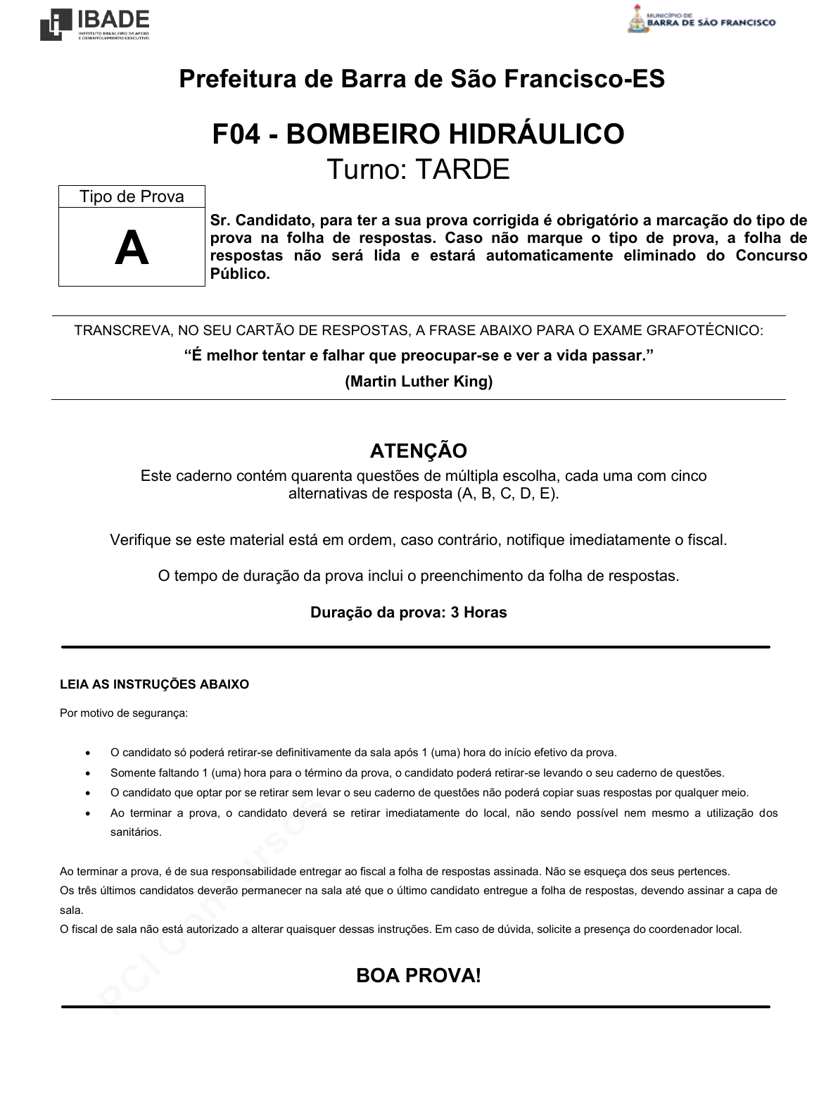 pcimarkpci MjgwNDowMTRkOjQ0ODg6MGI5ZjoyNjI5OmQ2N2Q6OGJjODpiNDEy:U2F0LCAyNiBPY3QgMjAyNCAxMToyODo1OCAtMDMwMA== www.pciconcursos.com.br Prefeitura de Barra de São Francisco-ES F04 - BOMBEIRO HIDRÁULICO Turno: TARDE Tipo de Prova A Sr. Candidato, para ter a sua prova corrigida é obrigatório a marcação do tipo de prova na folha de respostas. Caso não marque o tipo de prova, a folha de respostas não será lida e estará automaticamente eliminado do Concurso Público. TRANSCREVA, NO SEU CARTÃO DE RESPOSTAS, A FRASE ABAIXO PARA O EXAME GRAFOTÉCNICO: “É melhor tentar e falhar que preocupar-se e ver a vida passar.” (Martin Luther King) ATENÇÃO Este caderno contém quarenta questões de múltipla escolha, cada uma com cinco alternativas de resposta (A, B, C, D, E). Verifique se este material está em ordem, caso contrário, notifique imediatamente o fiscal. O tempo de duração da prova inclui o preenchimento da folha de respostas. Duração da prova: 3 Horas LEIA AS INSTRUÇÕES ABAIXO Por motivo de segurança: O candidato só poderá retirar-se definitivamente da sala após 1 (uma) hora do início efetivo da prova. Somente faltando 1 (uma) hora para o término da prova, o candidato poderá retirar-se levando o seu caderno de questões. O candidato que optar por se retirar sem levar o seu caderno de questões não poderá copiar suas respostas por qualquer meio. Ao terminar a prova, o candidato deverá se retirar imediatamente do local, não sendo possível nem mesmo a utilização dos sanitários. Ao terminar a prova, é de sua responsabilidade entregar ao fiscal a folha de respostas assinada. Não se esqueça dos seus pertences. Os três últimos candidatos deverão permanecer na sala até que o último candidato entregue a folha de respostas, devendo assinar a capa de sala. O fiscal de sala não está autorizado a alterar quaisquer dessas instruções. Em caso de dúvida, solicite a presença do coordenador local. BOA PROVA! pcimarkpci MjgwNDowMTRkOjQ0ODg6MGI5ZjoyNjI5OmQ2N2Q6OGJjODpiNDEy:U2F0LCAyNiBPY3QgMjAyNCAxMToyODo1OCAtMDMwMA== www.pciconcursos.com.br Prefeitura de Barra de São Francisco-ES IBADE BOMBEIRO HIDRÁULICO Tipo A – Página 2 Língua Portuguesa Questão 1 Leia o texto a seguir para responder às questões de 1 a 8. TEXTO Pau-brasil Árvore-símbolo do Brasil. Durante o período colonial, sua madeira era uma das principais fontes de renda do País. Atualmente o pau-brasil tem sido mais utilizado em projetos paisagísticos, devido à sua beleza plástica. Essa árvore floresce de setembro a outubro, período em que as cores da bandeira do Brasil ficam mais evidentes na sua estampa. As flores amarelas, levemente perfumadas, fazem um belo contraste com o verde das folhas. É uma planta típica do interior de florestas primárias densas e prefere os terrenos secos. Tanto que é inexistente em cordilheiras marítimas. O pau-brasil é uma árvore leguminosa não comestível, que dá vagens recobertas por uma casca grossa e espinhosa, de cor verde-amarronzada. A madeira, que já foi muito utilizada na construção civil e naval, hoje é basicamente empregada na construção de arcos de violino. Do lenho também é possível extrair a “brasileína”, um tipo de corante, usado na tintura de roupas. Também conhecida como ibirapitanga, orabutã, pau-rosado ou pau-de-pernambuco, essa árvore que pode chegar até os 12 metros de altura, tem o desenvolvimento moderado no campo e não ultrapassa os dois metros de altura aos dois anos de idade. https://g1.globo.com O objetivo principal do texto lido é: (A) contar uma história. (B) recomendar algo. (C) apresentar uma informação. (D) questionar um assunto. (E) fazer uma crítica. Questão 2 É incorreto afirmar que o texto apresentou: (A) diálogos. (B) título principal. (C) quatro parágrafos. (D) nome próprio. (E) fonte de referência do texto. Questão 3 “Durante o período colonial, sua madeira era uma das principais fontes de renda do País.” 1º parágrafo A expressão sublinhada na frase acima indica ideia de: (A) lugar. (B) modo. (C) intensidade. (D) negação. (E) tempo. Questão 4 “É uma planta típica do interior de florestas primárias densas e prefere os terrenos secos.” 2º parágrafo É sinônimo da palavra destacada nessa frase: (A) resistente. (B) característica. (C) complexa. (D) lenhosa. (E) leguminosa. Questão 5 “As flores amarelas, levemente perfumadas, fazem um belo contraste com o verde das folhas.” 2º parágrafo Na frase acima, as palavras sublinhadas: (A) nomeiam um ser. (B) substituem um nome. (C) quantificam algo. (D) indicam uma qualidade. (E) indicam uma ação. Questão 6 Observe o seguinte grupo de palavras extraídas do texto. árvore – plástica – marítimas – símbolo - típica Essas palavras receberam o acento gráfico por serem (A) oxítonas. (B) paroxítonas. (C) proparoxítonas. (D) hiatos. (E) ditongos. pcimarkpci MjgwNDowMTRkOjQ0ODg6MGI5ZjoyNjI5OmQ2N2Q6OGJjODpiNDEy:U2F0LCAyNiBPY3QgMjAyNCAxMToyODo1OCAtMDMwMA== www.pciconcursos.com.br Prefeitura de Barra de São Francisco-ES IBADE BOMBEIRO HIDRÁULICO Tipo A – Página 3 Questão 7 “Essa árvore floresce de setembro a outubro, período em que as cores da bandeira do Brasil ficam mais evidentes na sua estampa.” 2º parágrafo Assinale a alternativa que identifica corretamente a voz e o tempo dos verbos sublinhados no período acima. (A) voz ativa – tempo presente. (B) voz passiva – tempo presente. (C) voz reflexiva – tempo presente. (D) voz ativa – tempo passado. (E) voz passiva – tempo passado. Questão 8 “Atualmente o pau-brasil tem sido mais utilizado em projetos paisagísticos, devido à sua beleza plástica.” 1º parágrafo O pronome destacado nessa frase é classificado como (A) demonstrativo. (B) possessivo. (C) relativo. (D) interrogativo. (E) pessoal de tratamento. Questão 9 Leia a frase a seguir e assinale a alternativa que completa corretamente a lacuna. Ontem, os trabalhadores rur