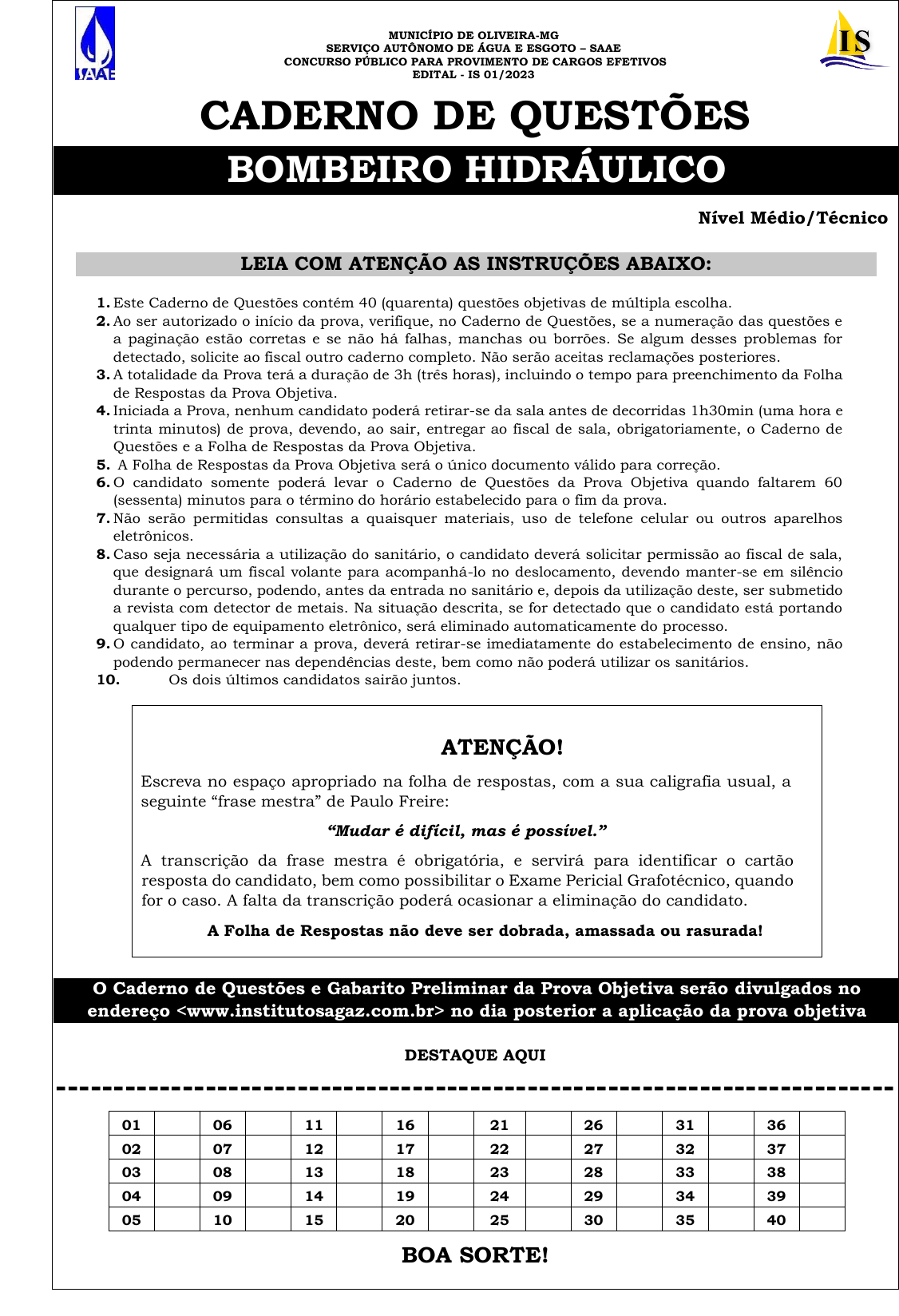 detectado, solicite ao fiscal outro caderno completo. Não serão aceitas reclamações posteriores.