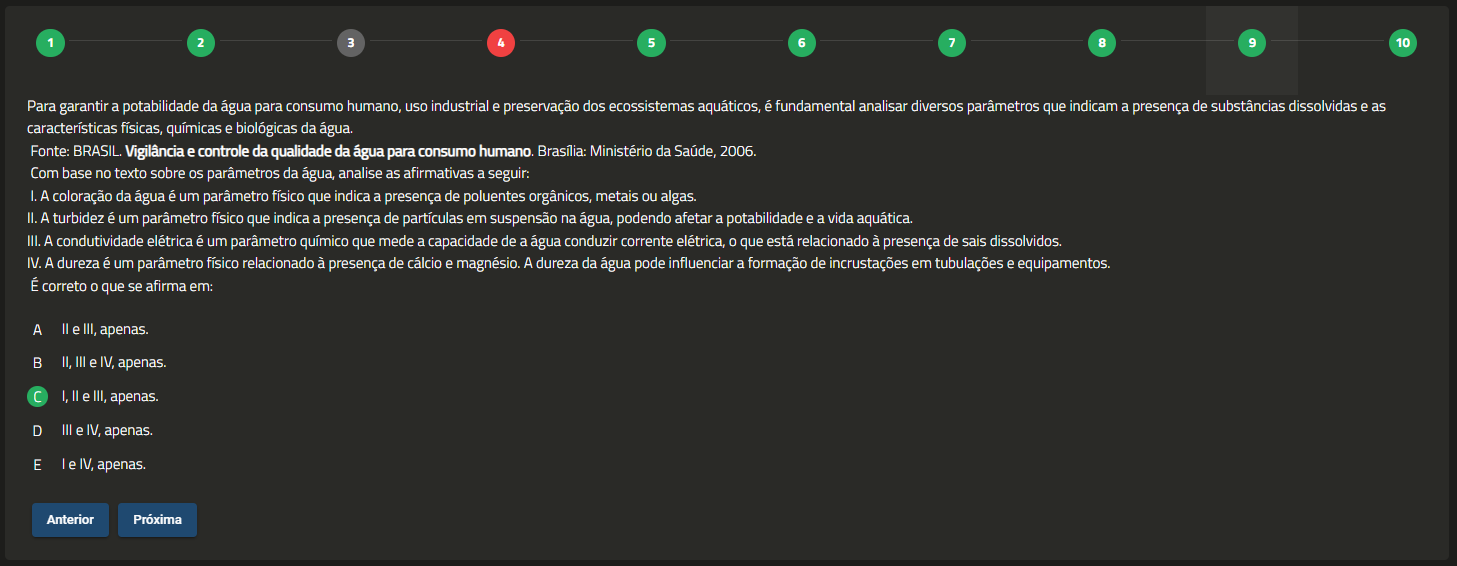 1 2 3 4 5 6 7 8 9 10 Para garantir a potabilidade da água para consumo humano, industrial e preservação dos ecossistemas é fundamental analisar diversos parâmetros que indicam a presença de substâncias dissolvidas e as características físicas, químicas e biológicas da água. Fonte: BRASIL. Vigilância e controle da qualidade da água para consumo Brasília: Ministério da Saúde, 2006. Com base no texto sobre os parâmetros da água, analise as afirmativas a seguir: I. A coloração da água é um parâmetro físico que indica a presença de poluentes orgânicos, metais ou algas. II. A turbidez é um parâmetro físico que indica a presença de em suspensão na água, podendo afetar a potabilidade e a vida aquática. III. A condutividade elétrica é um parâmetro químico que mede a capacidade de a água conduzir corrente elétrica, que está relacionado à presença de sais dissolvidos. IV. A dureza é um parâmetro físico relacionado à presença de cálcio e magnésio. A dureza da água pode influenciar a formação de incrustações em tubulações e equipamentos. É correto que se afirma em: A II e III, apenas. B II, III e IV, apenas. I, II e III, apenas. D III e IV, apenas. E I e Anterior Próxima