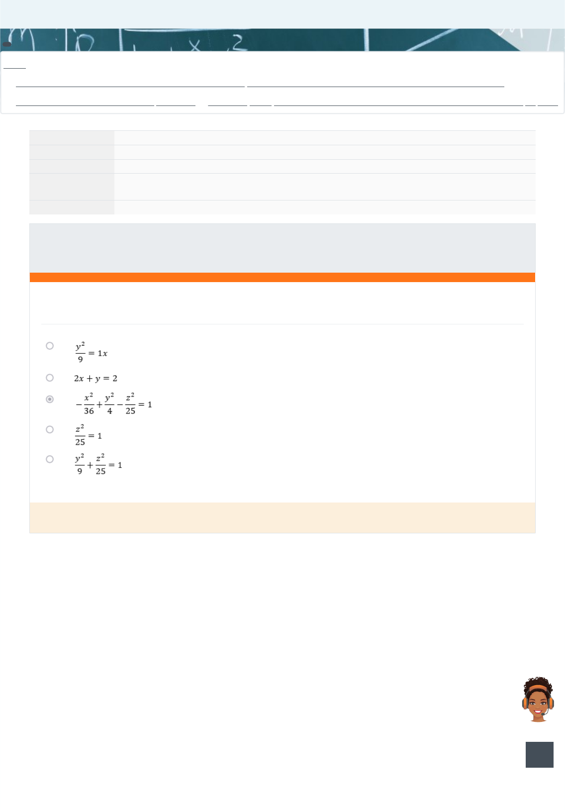 Iniciado em sexta, 25 out 2024, 07:56 Estado Finalizada Concluída em sexta, 25 out 2024, 08:02 Tempo empregado 6 minutos 31 segundos Avaliar 0,45 de um máximo de 0,50(90%) Questão 1 Completo Atingiu 0,05 de 0,05 Qual das equações abaixo representa um hiperboloide de duas folhas? a. b. c. d. e. Sua resposta está correta. Painel / Minhas Disciplinas / BACHARELADO EM ENGENHARIA DE CONTROLE E AUTOMAÇÃO-disc. 36- GEOMETRIA ANALÍTICA E ÁLGEBRA LINEAR E VETORIAL / ATIVIDADE DE ESTUDO 02 - VALOR 0,5 PONTOS / AB2 - CLIQUE AQUI PARA REALIZAR A ATIVIDADE DE ESTUDO 02 - PRAZO FINAL: 10/11/2024 https://www.eadunifatecie.com.br/mod/quiz/review.php?attempt=12541782&cmid=1605552# https://www.eadunifatecie.com.br/course/view.php?id=49429 https://www.eadunifatecie.com.br/course/view.php?id=49429 https://www.eadunifatecie.com.br/course/view.php?id=49429 https://www.eadunifatecie.com.br/my/ https://www.eadunifatecie.com.br/my/ https://www.eadunifatecie.com.br/course/view.php?id=49429 https://www.eadunifatecie.com.br/course/view.php?id=49429 https://www.eadunifatecie.com.br/course/view.php?id=49429#section-7 https://www.eadunifatecie.com.br/course/view.php?id=49429#section-7 https://www.eadunifatecie.com.br/mod/quiz/view.php?id=1605552 https://www.eadunifatecie.com.br/mod/quiz/view.php?id=1605552 https://www.eadunifatecie.com.br/mod/quiz/review.php?attempt=12541782&cmid=1605552# https://www.eadunifatecie.com.br/mod/quiz/review.php?attempt=12541782&cmid=1605552# https://www.eadunifatecie.com.br/mod/quiz/review.php?attempt=12541782&cmid=1605552# Questão 2 Completo Atingiu 0,05 de 0,05 Questão 3 Completo Atingiu 0,05 de 0,05 Dada a equação do elipsoide determine a equação da elipse no plano XZ. a. b. c. d. e. Sua resposta está correta. Considerando a matriz quadrada , determine os elementos da diagonal principal. a. -1, 3 e 0. b. -1, 6 e 1. c. -5, 6 e 0. d. -1, 6 e 0. e. -1, 6 e 2. Sua resposta está correta. https://www.eadunifatecie.com.br/mod/quiz/review.php?attempt=12541782&cmid=1605552# https://www.eadunifatecie.com.br/mod/quiz/review.php?attempt=12541782&cmid=1605552# https://www.eadunifatecie.com.br/mod/quiz/review.php?attempt=12541782&cmid=1605552# https://www.eadunifatecie.com.br/mod/quiz/review.php?attempt=12541782&cmid=1605552# Questão 4 Completo Atingiu 0,05 de 0,05 Questão 5 Completo Atingiu 0,05 de 0,05 Qual dos elementos abaixo configura uma quádrica? a. Triângulo. b. Reta. c. Elipsoide. d. Quadrado. e. Círculo. Sua resposta está correta. Qual das equações abaixo representa um elipsoide? a. b. c. d. e. Sua resposta está correta. https://www.eadunifatecie.com.br/mod/quiz/review.php?attempt=12541782&cmid=1605552# https://www.eadunifatecie.com.br/mod/quiz/review.php?attempt=12541782&cmid=1605552# https://www.eadunifatecie.com.br/mod/quiz/review.php?attempt=12541782&cmid=1605552# https://www.eadunifatecie.com.br/mod/quiz/review.php?attempt=12541782&cmid=1605552# Questão 6 Completo Atingiu 0,05 de 0,05 Questão 7 Completo Atingiu 0,05 de 0,05 Determinar os valores de k para que o sistema de equações seja impossível: a. 3 e -3. b. 2 e -3. c. 2 e 1. d. 2 e 3. e. 1 e -3. Sua resposta está correta. Determine o valor do determinante da matriz a. b. c. d. e. Sua resposta está correta. https://www.eadunifatecie.com.br/mod/quiz/review.php?attempt=12541782&cmid=1605552# https://www.eadunifatecie.com.br/mod/quiz/review.php?attempt=12541782&cmid=1605552# https://www.eadunifatecie.com.br/mod/quiz/review.php?attempt=12541782&cmid=1605552# https://www.eadunifatecie.com.br/mod/quiz/review.php?attempt=12541782&cmid=1605552# Questão 8 Completo Atingiu 0,05 de 0,05 Questão 9 Completo Atingiu 0,05 de 0,05 Qual das equações abaixo representa um hiperboloide de uma folha? a. b. c. d. e. Sua resposta está correta. Qual das matrizes abaixo caracteriza uma matriz quadrada? a. b. c. d. e. Sua resposta está correta. https://www.eadunifatecie.com.br/mod/quiz/review.php?attempt=12541782&cmid=1605552# https://www.eadunifatecie.com.br/mod/quiz/review.php?attempt=12541782&cmid=1605552# https://www.eadunifatecie.com.br/mod/quiz/review.php?attempt=12541782&cmid=1605552# https://www.eadunifatecie.com.br/mod/quiz/review.php?attempt=12541782&cmid=1605552# Questão 10 Completo Atingiu 0,00 de 0,05 Determinar , de modo que o sistema tenha uma única solução. a. b. c. d. e. Sua resposta está incorreta. ◄ ÁUDIO AULA 08 Seguir para... CLIQUE AQUI PARA REALIZAR O FÓRUM DA DISCIPLINA ► https://www.eadunifatecie.com.br/mod/quiz/review.php?attempt=12541782&cmid=1605552# https://www.eadunifatecie.com.br/mod/url/view.php?id=1605551&forceview=1 https://www.eadunifatecie.com.br/mod/url/view.php?id=1605551&forceview=1 https://www.eadunifatecie.com.br/mod/forum/view.php?id=1605553&forceview=1 https://www.eadunifatecie.com.br/mod/forum/view.php?id=1605553&forceview=1 https://www.eadunifatecie.com.br/mod/quiz/review.php?attempt=12541782&cmid=1605552# https://www.eadunifatecie.com.br/mod/quiz/review.php?attempt=12541782&cmid=1605552# https://www.eadunifatecie.com.br/mod/quiz/review.php?attempt=12541782&cmid=1605552# correta Iniciado em sexta, 25 out 2024, 07:42 Estado Finalizada Concluída em sexta, 25 out 2024, 07:55 Tempo empregado 12 minutos 50 segundos Avaliar 0,40 de um máximo de 0,50(80%) Questão 1 Completo Atingiu 0,05 de 0,05 Calcular o determinante da matriz considerando que a mesma é de Vandermonde. a. b. c. d. e. Sua resposta está correta. Painel / Minhas Disciplinas / BACHARELADO EM ENGENHARIA DE CONTROLE E AUTOMAÇÃO-disc. 36- GEOMETRIA ANALÍTICA E ÁLGEBRA LINEAR E VETORIAL / ATIVIDADE DE ESTUDO 02 - VALOR 0,5 PONTOS / AB2 - CLIQUE AQUI PARA REALIZAR A ATIVIDADE DE ESTUDO 02 - PRAZO FINAL: 10/11/2024 https://www.eadunifatecie.com.br/mod/quiz/review.php?attempt=12541700&cmid=1605552# https://www.eadunifatecie.com.br/course/view.php?id=49429 https://www.eadunifatecie.com.br/course/view.php?id=49429 https://www.eadunifatecie.com.br/course/view.php?id=49429 https://www.eadunifatecie.com.br/my