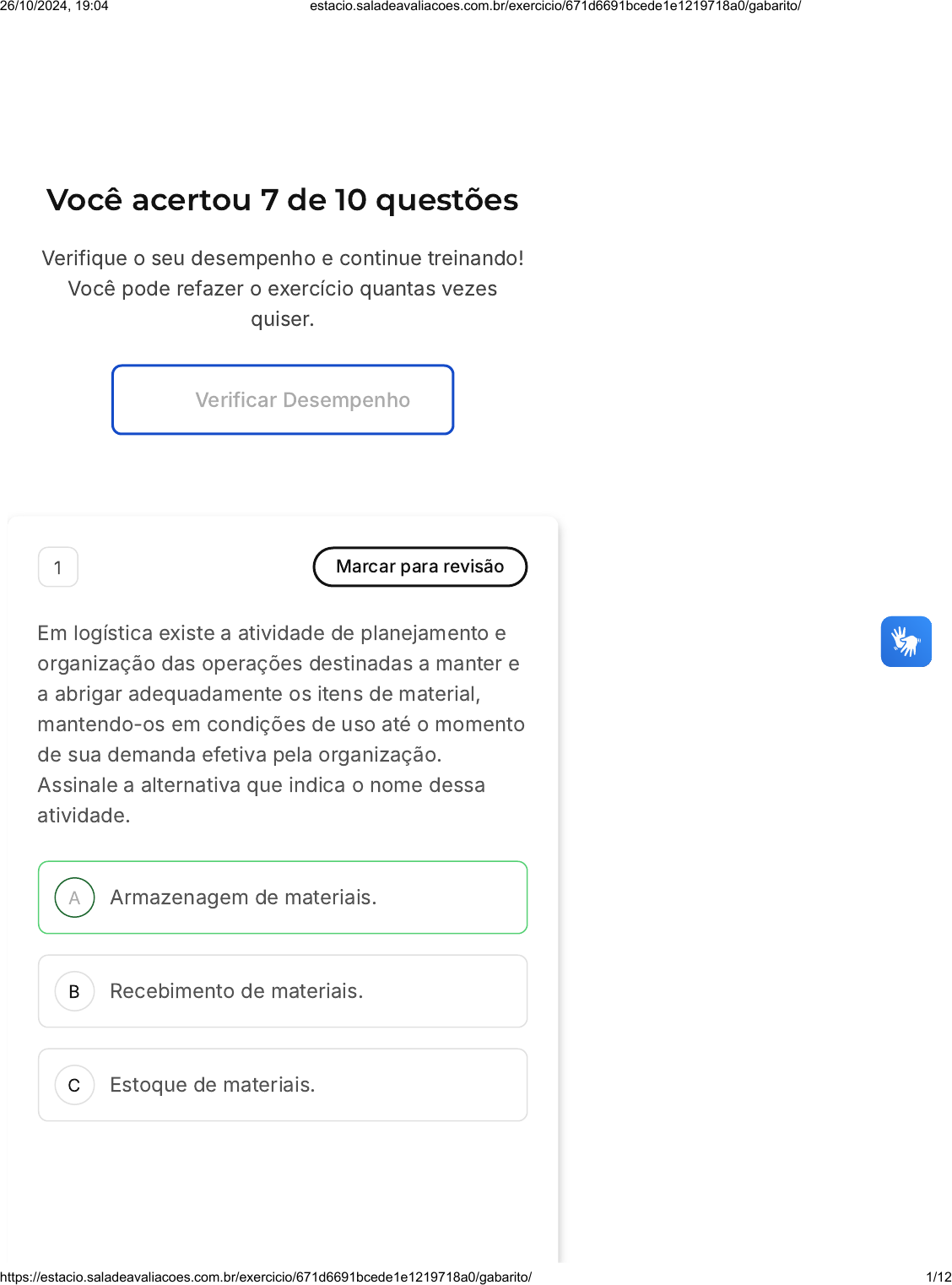 Você acertou 7 de 10 questões Verifique o seu desempenho e continue treinando! Você pode refazer o exercício quantas vezes quiser. Verificar Desempenho A B C 1 Marcar para revisão Em logística existe a atividade de planejamento e organização das operações destinadas a manter e a abrigar adequadamente os itens de material, mantendo-os em condições de uso até o momento de sua demanda efetiva pela organização. Assinale a alternativa que indica o nome dessa atividade. Armazenagem de materiais. Recebimento de materiais. Estoque de materiais. 26/10/2024, 19:04 estacio.saladeavaliacoes.com.br/exercicio/671d6691bcede1e1219718a0/gabarito/ https://estacio.saladeavaliacoes.com.br/exercicio/671d6691bcede1e1219718a0/gabarito/ 1/12 D E A B Expedição de materiais. Separação de materiais. Resposta correta Parabéns, você selecionou a alternativa correta. Confira o gabarito comentado! Gabarito Comentado A atividade de armazenagem de materiais é responsável por manter adequadamente e abrigar os itens de modo que eles possam ser posteriormente entregues com a qualidade desejada pelos clientes. 2 Marcar para revisão Sabe-se que grande parte do tempo das operações logísticas nos centros de distribuição é consumido pelas atividades de picking. Diversos são os processos que compõem esta atividade, sendo que a atividade de movimentação das mercadorias consome cerca de 10% do tempo do operador. 20% do tempo do operador. 26/10/2024, 19:04 estacio.saladeavaliacoes.com.br/exercicio/671d6691bcede1e1219718a0/gabarito/ https://estacio.saladeavaliacoes.com.br/exercicio/671d6691bcede1e1219718a0/gabarito/ 2/12 C D E 30% do tempo do operador. 40% do tempo do operador. 60% do tempo do operador. Resposta incorreta Opa! A alternativa correta é a letra E. Confira o gabarito comentado! Gabarito Comentado De fato, as atividades de picking consomem grande parte do tempo das operações logísticas, sendo que a movimentação é uma das etapas do picking que mais consome este tempo, podendo chegar a consumir 60% do tempo do operador. 3 Marcar para revisão A identificação dos produtos com alta rotatividade, comercializados pela empresa é importante para que ela defina quais são as prioridades logísticas relacionadas a estes produtos. Deverá ser estabelecido um método para essa identificação, sendo que um dos mais conhecidos é 26/10/2024, 19:04 estacio.saladeavaliacoes.com.br/exercicio/671d6691bcede1e1219718a0/gabarito/ https://estacio.saladeavaliacoes.com.br/exercicio/671d6691bcede1e1219718a0/gabarito/ 3/12 A B C D E sincronização de carregamentos. armazenagem eficaz. separação discreta. curva ABC. voice picking. Resposta correta Parabéns, você selecionou a alternativa correta. Confira o gabarito comentado! Gabarito Comentado A utilização da curva ABC poderá auxiliar na identificação dos produtos que possuem maior rotatividade e, portanto, deverão ter maior prioridade nas operações logísticas, uma vez que possivelmente contribuem com a maior parcela de faturamento da organização. 4 Marcar para revisão Os processos relacionados ao controle da expedição em lojas virtuais deverão passar por um processo de eliminação do uso excessivo de papel, de modo a se evitar desperdícios e tornar 26/10/2024, 19:04 estacio.saladeavaliacoes.com.br/exercicio/671d6691bcede1e1219718a0/gabarito/ https://estacio.saladeavaliacoes.com.br/exercicio/671d6691bcede1e1219718a0/gabarito/ 4/12 A B C D E os processos mais enxutos. Para a eliminação da necessidade de papéis pode se usar o sistema MRP. CAD. ERP. SIG. WMS. Resposta correta Parabéns, você selecionou a alternativa correta. Confira o gabarito comentado! Gabarito Comentado A utilização do sistema WMS permite que as operações da empresa sejam controladas por meio de leitura de código de barras para identificação dos produtos, bem como sua localização, fazendo com que a empresa não necessite da utilização excessiva de papéis para relatórios ou criação de listas de produtos. 26/10/2024, 19:04 estacio.saladeavaliacoes.com.br/exercicio/671d6691bcede1e1219718a0/gabarito/ https://estacio.saladeavaliacoes.com.br/exercicio/671d6691bcede1e1219718a0/gabarito/ 5/12 A B C D E 5 Marcar para revisão O processo de distribuição de pedidos está ligado a uma das etapas fundamentais para as operações logísticas. Esta etapa é conhecida como armazenagem de materiais. Separação de materiais. recebimento de materiais. estoque de materiais. expedição de materiais. Resposta correta Parabéns, você selecionou a alternativa correta. Confira o gabarito comentado! Gabarito Comentado A distribuição dos pedidos ao mercado consumidor está ligada ao processo de expedição, que por sua vez é responsável por preparar todas as atividades e detalhes inerentes à entrega do produto ao cliente. 26/10/2024, 19:04 estacio.saladeavaliacoes.com.br/exercicio/671d6691bcede1e1219718a0/gabarito/ https://estacio.saladeavaliacoes.com.br/exercicio/671d6691bcede1e1219718a0/gabarito/ 6/12 A B C D E 6 Marcar para revisão Numa das etapas do processo logístico é possível a personalização da entrega das mercadorias ao cliente, como a utilização de embalagens especiais ou criação de kits de produtos, conforme os pedidos realizados. Esta etapa é conhecida como Planejamento. Consolidação. Verificação de documentação. Acondicionamento. Expedição. Resposta correta Parabéns, você selecionou a alternativa correta. Confira o gabarito comentado! Gabarito Comentado Na etapa de acondicionamento algumas personalizações solicitadas pelos clientes poderão ser realizadas, como a utilização de embrulhos especiais para presentes ou a 26/10/2024, 19:04 estacio.saladeavaliacoes.com.br/exercicio/671d6691bcede1e1219718a0/gabarito/ https://estacio.saladeavaliacoes.com.br/exercicio/671d6691bcede1e1219718a0/gabarito/ 7/12 A B C D E formação de kits de produtos conforme as necessidades dos compradores. 7 Marcar para revisão Diversas ações devem s