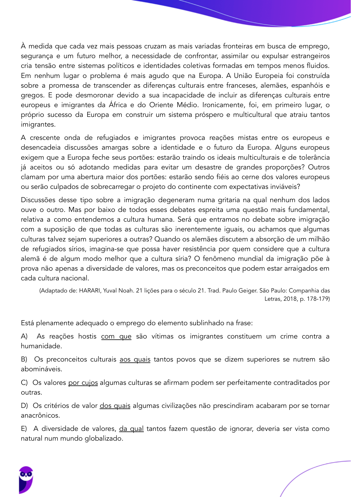 À medida que cada vez mais pessoas cruzam as mais variadas fronteiras em busca de emprego, segurança e um futuro melhor, a necessidade de confrontar, assimilar ou expulsar estrangeiros cria tensão entre sistemas políticos e identidades coletivas formadas em tempos menos fluidos. Em nenhum lugar o problema é mais agudo que na Europa. A União Europeia foi construída sobre a promessa de transcender as diferenças culturais entre franceses, alemães, espanhóis e gregos. E pode desmoronar devido a sua incapacidade de incluir as diferenças culturais entre europeus e imigrantes da África e do Oriente Médio. Ironicamente, foi, em primeiro lugar, o próprio sucesso da Europa em construir um sistema próspero e multicultural que atraiu tantos imigrantes. A crescente onda de refugiados e imigrantes provoca reações mistas entre os europeus e desencadeia discussões amargas sobre a identidade e o futuro da Europa. Alguns europeus exigem que a Europa feche seus portões: estarão traindo os ideais multiculturais e de tolerância já aceitos ou só adotando medidas para evitar um desastre de grandes proporções? Outros clamam por uma abertura maior dos portões: estarão sendo fiéis ao cerne dos valores europeus ou serão culpados de sobrecarregar o projeto do continente com expectativas inviáveis? Discussões desse tipo sobre a imigração degeneram numa gritaria na qual nenhum dos lados ouve o outro. Mas por baixo de todos esses debates espreita uma questão mais fundamental, relativa a como entendemos a cultura humana. Será que entramos no debate sobre imigração com a suposição de que todas as culturas são inerentemente iguais, ou achamos que algumas culturas talvez sejam superiores a outras? Quando os alemães discutem a absorção de um milhão de refugiados sírios, imagina-se que possa haver resistência por quem considere que a cultura alemã é de algum modo melhor que a cultura síria? O fenômeno mundial da imigração põe à prova não apenas a diversidade de valores, mas os preconceitos que podem estar arraigados em cada cultura nacional. (Adaptado de: HARARI, Yuval Noah. 21 lições para o século 21. Trad. Paulo Geiger. São Paulo: Companhia das Letras, 2018, p. 178-179) Está plenamente adequado o emprego do elemento sublinhado na frase: A) As reações hostis com que são vítimas os imigrantes constituem um crime contra a humanidade. B) Os preconceitos culturais aos quais tantos povos que se dizem superiores se nutrem são abomináveis. C) Os valores por cujos algumas culturas se afirmam podem ser perfeitamente contraditados por outras. D) Os critérios de valor dos quais algumas civilizações não prescindiram acabaram por se tornar anacrônicos. E) A diversidade de valores, da qual tantos fazem questão de ignorar, deveria ser vista como natural num mundo globalizado. Equipe Português Estratégia Concursos, Felipe Luccas Aula 02 - Questões Comentadas Questões Comentadas de Português (FGV, FCC e CEBRASPE) Em PDF - Cartão 12x! www.estrategiaconcursos.com.br 02253235164 - Julia Gabryely 69 73