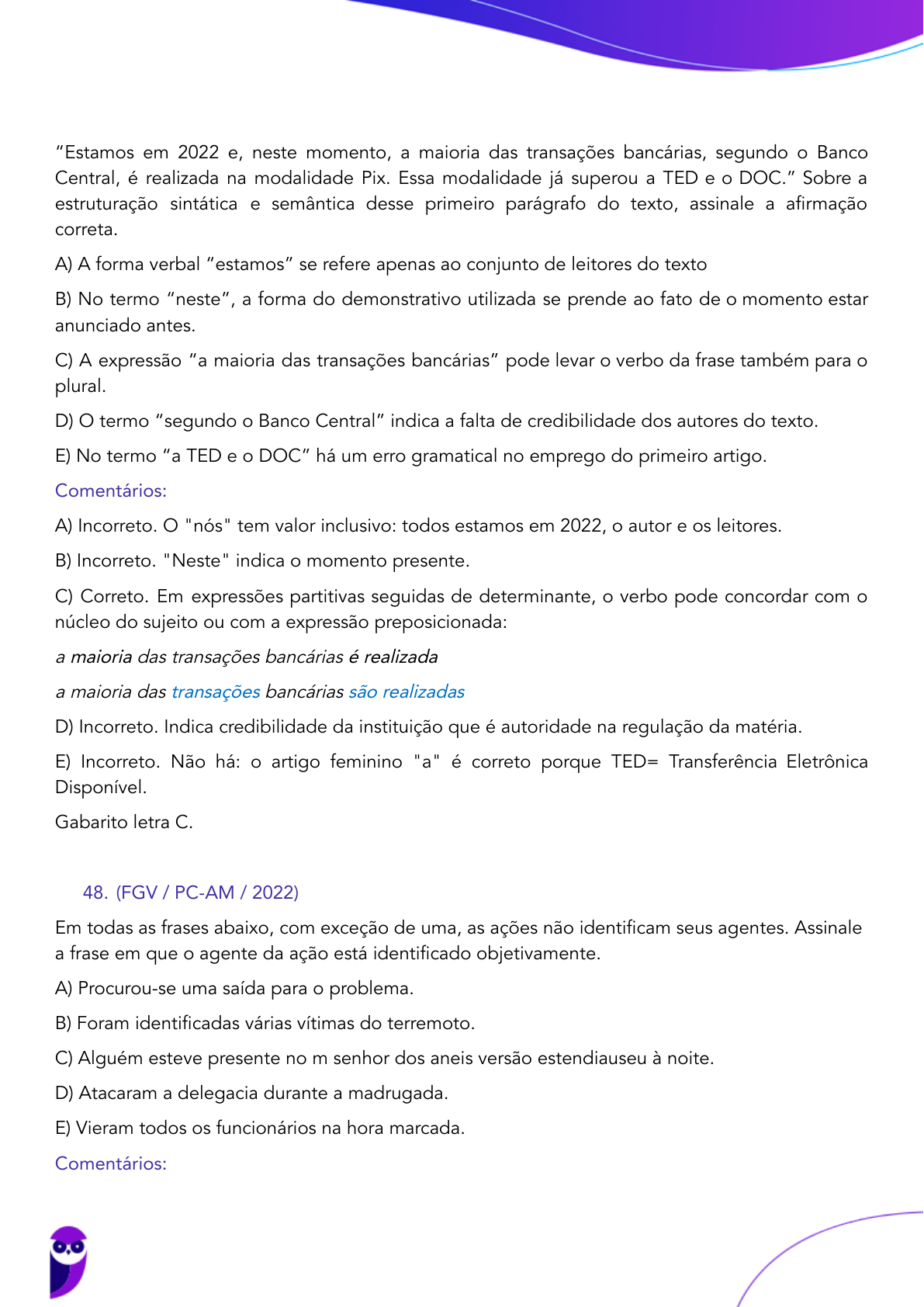 “Estamos em 2022 e, neste momento, a maioria das transações bancárias, segundo o Banco Central, é realizada na modalidade Pix. Essa modalidade já superou a TED e o DOC.” Sobre a estruturação sintática e semântica desse primeiro parágrafo do texto, assinale a afirmação correta. A) A forma verbal “estamos” se refere apenas ao conjunto de leitores do texto B) No termo “neste”, a forma do demonstrativo utilizada se prende ao fato de o momento estar anunciado antes. C) A expressão “a maioria das transações bancárias” pode levar o verbo da frase também para o plural. D) O termo “segundo o Banco Central” indica a falta de credibilidade dos autores do texto. E) No termo “a TED e o DOC” há um erro gramatical no emprego do primeiro artigo. Comentários: A) Incorreto. O "nós" tem valor inclusivo: todos estamos em 2022, o autor e os leitores. B) Incorreto. "Neste" indica o momento presente. C) Correto. Em expressões partitivas seguidas de determinante, o verbo pode concordar com o núcleo do sujeito ou com a expressão preposicionada: a maioria das transações bancárias é realizada a maioria das transações bancárias são realizadas D) Incorreto. Indica credibilidade da instituição que é autoridade na regulação da matéria. E) Incorreto. Não há: o artigo feminino "a" é correto porque TED= Transferência Eletrônica Disponível. Gabarito letra C. 48. (FGV / PC-AM / 2022) Em todas as frases abaixo, com exceção de uma, as ações não identificam seus agentes. Assinale a frase em que o agente da ação está identificado objetivamente. A) Procurou-se uma saída para o problema. B) Foram identificadas várias vítimas do terremoto. C) Alguém esteve presente no m senhor dos aneis versão estendiauseu à noite. D) Atacaram a delegacia durante a madrugada. E) Vieram todos os funcionários na hora marcada. Comentários: Equipe Português Estratégia Concursos, Felipe Luccas Aula 02 - Questões Comentadas Questões Comentadas de Português (FGV, FCC e CEBRASPE) Em PDF - Cartão 12x! www.estrategiaconcursos.com.br 02253235164 - Julia Gabryely 36 73