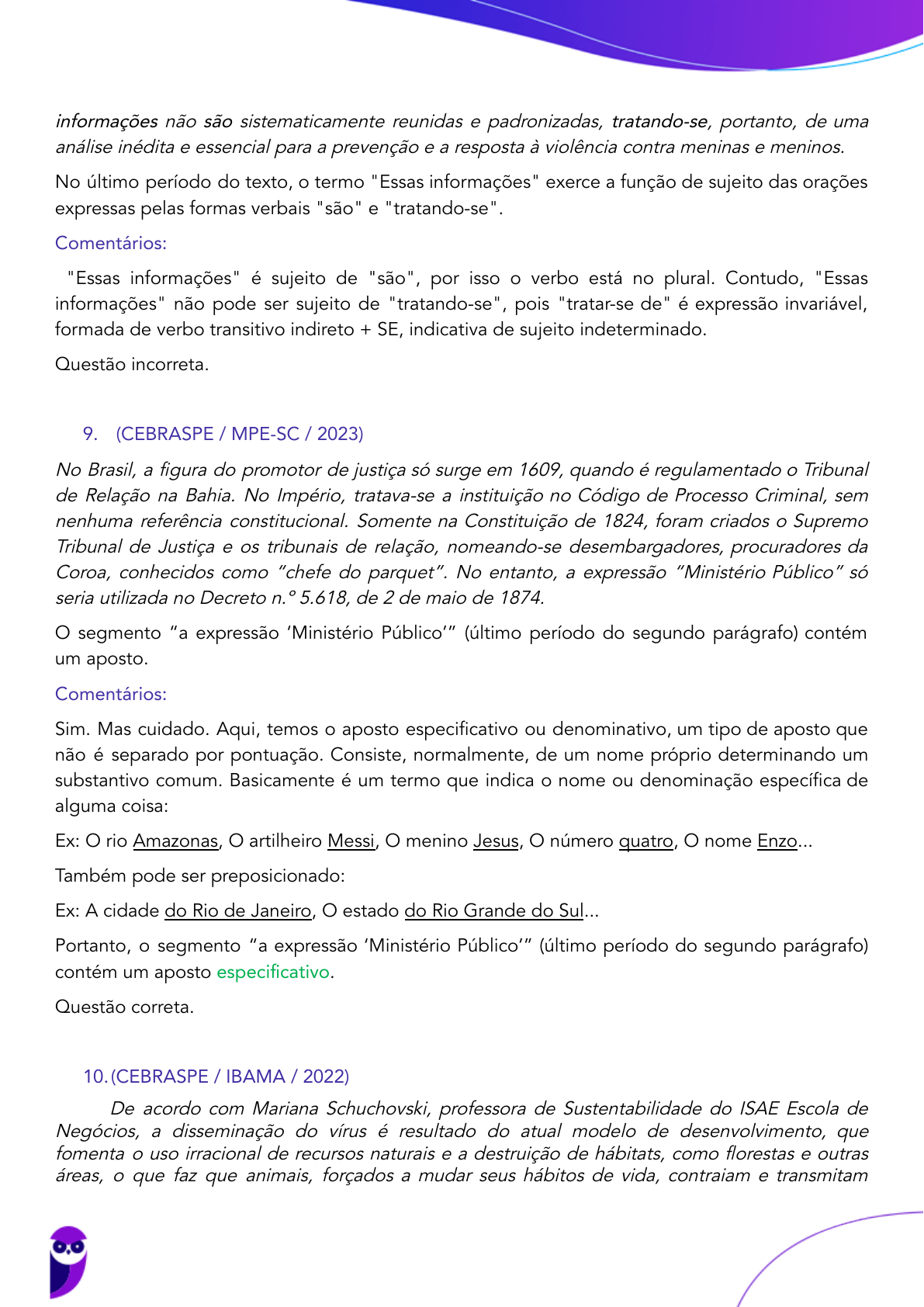 informações não são sistematicamente reunidas e padronizadas, tratando-se, portanto, de uma análise inédita e essencial para a prevenção e a resposta à violência contra meninas e meninos. No último período do texto, o termo "Essas informações" exerce a função de sujeito das orações expressas pelas formas verbais "são" e "tratando-se". Comentários: "Essas informações" é sujeito de "são", por isso o verbo está no plural. Contudo, "Essas informações" não pode ser sujeito de "tratando-se", pois "tratar-se de" é expressão invariável, formada de verbo transitivo indireto + SE, indicativa de sujeito indeterminado. Questão incorreta. 9. (CEBRASPE / MPE-SC / 2023) No Brasil, a figura do promotor de justiça só surge em 1609, quando é regulamentado o Tribunal de Relação na Bahia. No Império, tratava-se a instituição no Código de Processo Criminal, sem nenhuma referência constitucional. Somente na Constituição de 1824, foram criados o Supremo Tribunal de Justiça e os tribunais de relação, nomeando-se desembargadores, procuradores da Coroa, conhecidos como “chefe do parquet”. No entanto, a expressão “Ministério Público” só seria utilizada no Decreto n.º 5.618, de 2 de maio de 1874. O segmento “a expressão ‘Ministério Público’” (último período do segundo parágrafo) contém um aposto. Comentários: Sim. Mas cuidado. Aqui, temos o aposto especificativo ou denominativo, um tipo de aposto que não é separado por pontuação. Consiste, normalmente, de um nome próprio determinando um substantivo comum. Basicamente é um termo que indica o nome ou denominação específica de alguma coisa: Ex: O rio Amazonas, O artilheiro Messi, O menino Jesus, O número quatro, O nome Enzo... Também pode ser preposicionado: Ex: A cidade do Rio de Janeiro, O estado do Rio Grande do Sul... Portanto, o segmento “a expressão ‘Ministério Público’” (último período do segundo parágrafo) contém um aposto especificativo. Questão correta. 10. (CEBRASPE / IBAMA / 2022) De acordo com Mariana Schuchovski, professora de Sustentabilidade do ISAE Escola de Negócios, a disseminação do vírus é resultado do atual modelo de desenvolvimento, que fomenta o uso irracional de recursos naturais e a destruição de hábitats, como florestas e outras áreas, o que faz que animais, forçados a mudar seus hábitos de vida, contraiam e transmitam Equipe Português Estratégia Concursos, Felipe Luccas Aula 02 - Questões Comentadas Questões Comentadas de Português (FGV, FCC e CEBRASPE) Em PDF - Cartão 12x! www.estrategiaconcursos.com.br 02253235164 - Julia Gabryely 10 73