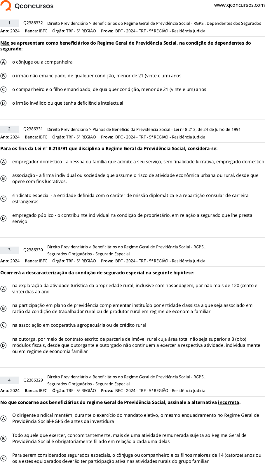 www.qconcursos.com Ano: 2024 Banca: IBFC Órgão: TRF - 5ª REGIÃO Não se apresentam como bene�ciários do Regime Geral de Previdência Social, na condição de dependentes do segurado: A o cônjuge ou a companheira B o irmão não emancipado, de qualquer condição, menor de 21 (vinte e um) anos C o companheiro e o �lho emancipado, de qualquer condição, menor de 21 (vinte e um) anos D o irmão inválido ou que tenha de�ciência intelectual Ano: 2024 Banca: IBFC Órgão: TRF - 5ª REGIÃO Para os �ns da Lei n° 8.213/91 que disciplina o Regime Geral da Previdência Social, considera-se: A empregador doméstico - a pessoa ou família que admite a seu serviço, sem �nalidade lucrativa, empregado doméstico B associação - a �rma individual ou sociedade que assume o risco de atividade econômica urbana ou rural, desde que opere com �ns lucrativos. C sindicato especial - a entidade de�nida com o caráter de missão diplomática e a repartição consular de carreira estrangeiras D empregado público - o contribuinte individual na condição de proprietário, em relação a segurado que lhe presta serviço Ano: 2024 Banca: IBFC Órgão: TRF - 5ª REGIÃO Ocorrerá a descaracterização da condição de segurado especial na seguinte hipótese: A na exploração da atividade turística da propriedade rural, inclusive com hospedagem, por não mais de 120 (cento e vinte) dias ao ano B na participação em plano de previdência complementar instituído por entidade classista a que seja associado em razão da condição de trabalhador rural ou de produtor rural em regime de economia familiar C na associação em cooperativa agropecuária ou de crédito rural D na outorga, por meio de contrato escrito de parceria de imóvel rural cuja área total não seja superior a 8 (oito) módulos �scais, desde que outorgante e outorgado não continuem a exercer a respectiva atividade, individualmente ou em regime de economia familiar Ano: 2024 Banca: IBFC Órgão: TRF - 5ª REGIÃO No que concerne aos bene�ciários do regime Geral de Previdência Social, assinale a alternativa incorreta. A O dirigente sindical mantém, durante o exercício do mandato eletivo, o mesmo enquadramento no Regime Geral de Previdência Social-RGPS de antes da investidura B Todo aquele que exercer, concomitantemente, mais de uma atividade remunerada sujeita ao Regime Geral de Previdência Social é obrigatoriamente �liado em relação a cada uma delas C Para serem considerados segurados especiais, o cônjuge ou companheiro e os �lhos maiores de 14 (catorze) anos ou os a estes equiparados deverão ter participação ativa nas atividades rurais do grupo familiar 1 Q2386332 >Direito Previdenciário Bene�ciários do Regime Geral de Previdência Social - RGPS , Dependentes dos Segurados Prova: IBFC - 2024 - TRF - 5ª REGIÃO - Residência Judicial 2 Q2386331 >Direito Previdenciário Planos de Benefício da Previdência Social - Lei nº 8.213, de 24 de Julho de 1991 Prova: IBFC - 2024 - TRF - 5ª REGIÃO - Residência Judicial 3 Q2386330 >Direito Previdenciário Bene�ciários do Regime Geral de Previdência Social - RGPS , Segurados Obrigatórios - Segurado Especial Prova: IBFC - 2024 - TRF - 5ª REGIÃO - Residência Judicial 4 Q2386329 >Direito Previdenciário Bene�ciários do Regime Geral de Previdência Social - RGPS , Segurados Obrigatórios - Segurado Especial Prova: IBFC - 2024 - TRF - 5ª REGIÃO - Residência Judicial https://www.qconcursos.com/ https://www.qconcursos.com/questoes-de-concursos/bancas/ibfc https://www.qconcursos.com/questoes-de-concursos/institutos/trf-5-regiao https://www.qconcursos.com/questoes-de-concursos/bancas/ibfc https://www.qconcursos.com/questoes-de-concursos/institutos/trf-5-regiao https://www.qconcursos.com/questoes-de-concursos/bancas/ibfc https://www.qconcursos.com/questoes-de-concursos/institutos/trf-5-regiao https://www.qconcursos.com/questoes-de-concursos/bancas/ibfc https://www.qconcursos.com/questoes-de-concursos/institutos/trf-5-regiao https://www.qconcursos.com/questoes-de-concursos/questoes/4004907e-db https://www.qconcursos.com/questoes-de-concursos/disciplinas/direito-direito-previdenciario https://www.qconcursos.com/questoes-de-concursos/disciplinas/direito-direito-previdenciario/beneficiarios-do-regime-geral-de-previdencia-social-rgps https://www.qconcursos.com/questoes-de-concursos/disciplinas/direito-direito-previdenciario/dependentes-dos-segurados https://www.qconcursos.com/questoes-de-concursos/provas/ibfc-2024-trf-5-regiao-residencia-judicial https://www.qconcursos.com/questoes-de-concursos/questoes/400226c5-db https://www.qconcursos.com/questoes-de-concursos/disciplinas/direito-direito-previdenciario https://www.qconcursos.com/questoes-de-concursos/disciplinas/direito-direito-previdenciario/planos-de-beneficio-da-previdencia-social-lei-n-8-213-de-24-de-julho-de-1991 https://www.qconcursos.com/questoes-de-concursos/provas/ibfc-2024-trf-5-regiao-residencia-judicial https://www.qconcursos.com/questoes-de-concursos/questoes/3fff9d02-db https://www.qconcursos.com/questoes-de-concursos/disciplinas/direito-direito-previdenciario https://www.qconcursos.com/questoes-de-concursos/disciplinas/direito-direito-previdenciario/beneficiarios-do-regime-geral-de-previdencia-social-rgps https://www.qconcursos.com/questoes-de-concursos/disciplinas/direito-direito-previdenciario/segurados-obrigatorios-segurado-especial https://www.qconcursos.com/questoes-de-concursos/provas/ibfc-2024-trf-5-regiao-residencia-judicial https://www.qconcursos.com/questoes-de-concursos/questoes/3ffd308a-db https://www.qconcursos.com/questoes-de-concursos/disciplinas/direito-direito-previdenciario https://www.qconcursos.com/questoes-de-concursos/disciplinas/direito-direito-previdenciario/beneficiarios-do-regime-geral-de-previdencia-social-rgps https://www.qconcursos.com/questoes-de-concursos/disciplinas/direito-direito-previdenciario/segurados-obrigatorios-segurado-especial https://www.qconcurso
