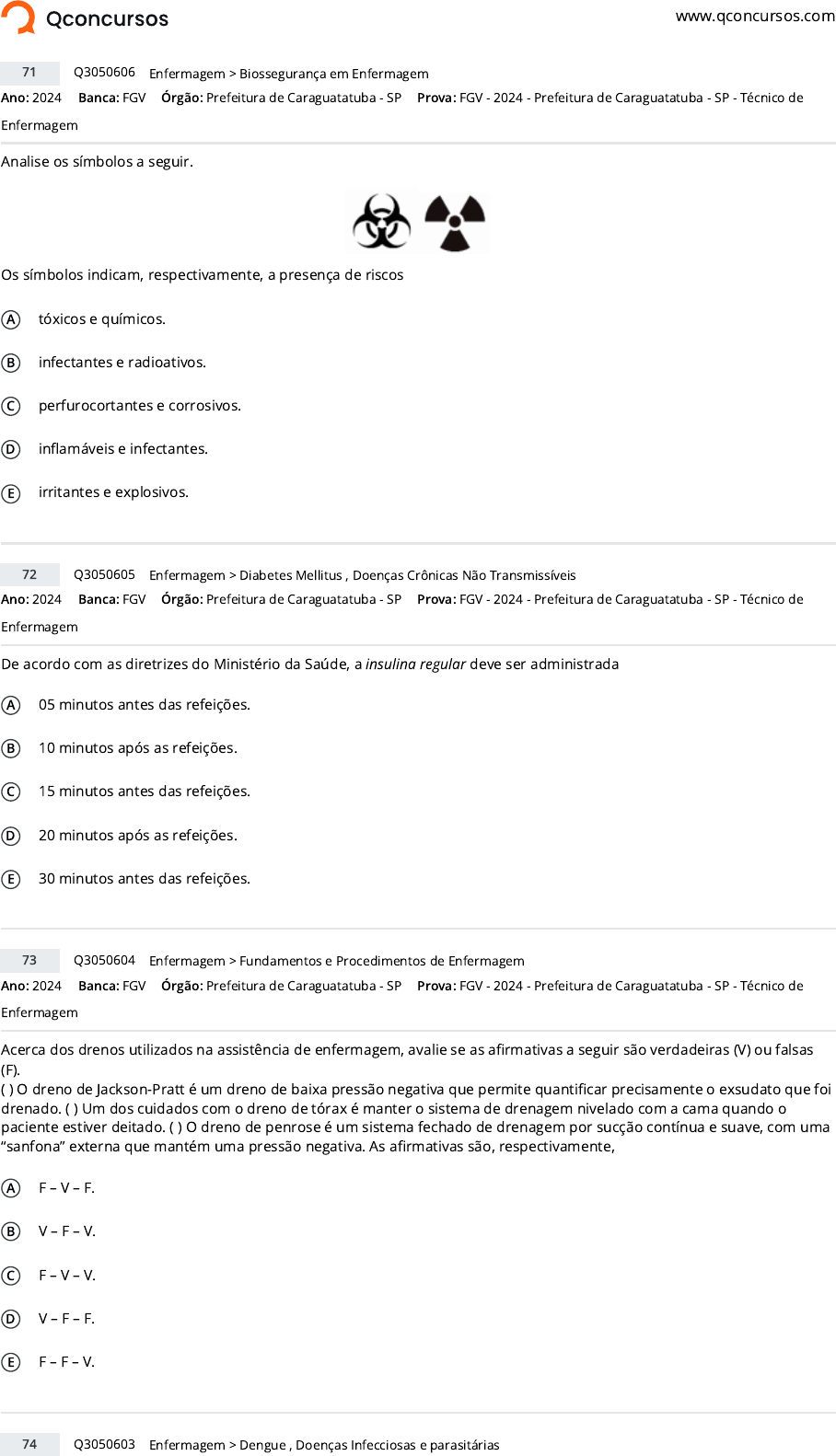 www.qconcursos.com Ano: 2024 Banca: FGV Órgão: Prefeitura de Caraguatatuba - SP Analise os símbolos a seguir. Os símbolos indicam, respectivamente, a presença de riscos A tóxicos e químicos. B infectantes e radioativos. C perfurocortantes e corrosivos. D in�amáveis e infectantes. E irritantes e explosivos. Ano: 2024 Banca: FGV Órgão: Prefeitura de Caraguatatuba - SP De acordo com as diretrizes do Ministério da Saúde, a insulina regular deve ser administrada A 05 minutos antes das refeições. B 10 minutos após as refeições. C 15 minutos antes das refeições. D 20 minutos após as refeições. E 30 minutos antes das refeições. Ano: 2024 Banca: FGV Órgão: Prefeitura de Caraguatatuba - SP Acerca dos drenos utilizados na assistência de enfermagem, avalie se as a�rmativas a seguir são verdadeiras (V) ou falsas (F). ( ) O dreno de Jackson-Pratt é um dreno de baixa pressão negativa que permite quanti�car precisamente o exsudato que foi drenado. ( ) Um dos cuidados com o dreno de tórax é manter o sistema de drenagem nivelado com a cama quando o paciente estiver deitado. ( ) O dreno de penrose é um sistema fechado de drenagem por sucção contínua e suave, com uma “sanfona” externa que mantém uma pressão negativa. As a�rmativas são, respectivamente, A F – V – F. B V – F – V. C F – V – V. D V – F – F. E F – F – V. 71 Q3050606 >Enfermagem Biossegurança em Enfermagem Prova: FGV - 2024 - Prefeitura de Caraguatatuba - SP - Técnico de Enfermagem 72 Q3050605 >Enfermagem Diabetes Mellitus , Doenças Crônicas Não Transmissíveis Prova: FGV - 2024 - Prefeitura de Caraguatatuba - SP - Técnico de Enfermagem 73 Q3050604 >Enfermagem Fundamentos e Procedimentos de Enfermagem Prova: FGV - 2024 - Prefeitura de Caraguatatuba - SP - Técnico de Enfermagem 74 Q3050603 >Enfermagem Dengue , Doenças Infecciosas e parasitárias https://www.qconcursos.com/ https://www.qconcursos.com/questoes-de-concursos/bancas/fgv https://www.qconcursos.com/questoes-de-concursos/institutos/prefeitura-de-caraguatatuba-sp https://www.qconcursos.com/questoes-de-concursos/bancas/fgv https://www.qconcursos.com/questoes-de-concursos/institutos/prefeitura-de-caraguatatuba-sp https://www.qconcursos.com/questoes-de-concursos/bancas/fgv https://www.qconcursos.com/questoes-de-concursos/institutos/prefeitura-de-caraguatatuba-sp https://www.qconcursos.com/questoes-de-concursos/questoes/a3afce7f-92 https://www.qconcursos.com/questoes-de-concursos/disciplinas/enfermagem-enfermagem https://www.qconcursos.com/questoes-de-concursos/disciplinas/enfermagem-enfermagem/biosseguranca-em-enfermagem https://www.qconcursos.com/questoes-de-concursos/provas/fgv-2024-prefeitura-de-caraguatatuba-sp-tecnico-de-enfermagem https://www.qconcursos.com/questoes-de-concursos/provas/fgv-2024-prefeitura-de-caraguatatuba-sp-tecnico-de-enfermagem https://www.qconcursos.com/questoes-de-concursos/questoes/a3adb261-92 https://www.qconcursos.com/questoes-de-concursos/disciplinas/enfermagem-enfermagem https://www.qconcursos.com/questoes-de-concursos/disciplinas/enfermagem-enfermagem/diabetes-mellitus https://www.qconcursos.com/questoes-de-concursos/disciplinas/enfermagem-enfermagem/doencas-cronicas-nao-transmissiveis https://www.qconcursos.com/questoes-de-concursos/provas/fgv-2024-prefeitura-de-caraguatatuba-sp-tecnico-de-enfermagem https://www.qconcursos.com/questoes-de-concursos/provas/fgv-2024-prefeitura-de-caraguatatuba-sp-tecnico-de-enfermagem https://www.qconcursos.com/questoes-de-concursos/questoes/a3ab5d74-92 https://www.qconcursos.com/questoes-de-concursos/disciplinas/enfermagem-enfermagem https://www.qconcursos.com/questoes-de-concursos/disciplinas/enfermagem-enfermagem/fundamentos-e-procedimentos-de-enfermagem https://www.qconcursos.com/questoes-de-concursos/provas/fgv-2024-prefeitura-de-caraguatatuba-sp-tecnico-de-enfermagem https://www.qconcursos.com/questoes-de-concursos/provas/fgv-2024-prefeitura-de-caraguatatuba-sp-tecnico-de-enfermagem https://www.qconcursos.com/questoes-de-concursos/questoes/a3a934c7-92 https://www.qconcursos.com/questoes-de-concursos/disciplinas/enfermagem-enfermagem https://www.qconcursos.com/questoes-de-concursos/disciplinas/enfermagem-enfermagem/dengue https://www.qconcursos.com/questoes-de-concursos/disciplinas/enfermagem-enfermagem/doencas-infecciosas-e-parasitarias Ano: 2024 Banca: FGV Órgão: Prefeitura de Caraguatatuba - SP Um paciente com suspeita de dengue apresenta febre com duração máxima de 7 dias e os seguintes sintomas especí�cos: A cefaleia e mialgia. B diarreia e prostração. C dispneia e dor retrorbitrária. D vômito e diarreia. E hipotensão e dispneia. Ano: 2024 Banca: FGV Órgão: Prefeitura de Caraguatatuba - SP Com base nas Diretrizes Brasileiras de Hipertensão Arterial, assinale a opção que indica a pressão arterial considerada normal para um jovem de 19 anos. A PAD Enfermagem Hipertensão Arterial Sistêmica , Doenças Crônicas Não Transmissíveis Prova: FGV - 2024 - Prefeitura de Caraguatatuba - SP - Técnico de Enfermagem 76 Q3050601 >Enfermagem Imunização , Calendário Vacinal Prova: FGV - 2024 - Prefeitura de Caraguatatuba - SP - Técnico de Enfermagem 77 Q3050600 >Enfermagem Administração de medicamentos Prova: FGV - 2024 - Prefeitura de Caraguatatuba - SP - Técnico de Enfermagem https://www.qconcursos.com/questoes-de-concursos/bancas/fgv https://www.qconcursos.com/questoes-de-concursos/institutos/prefeitura-de-caraguatatuba-sp https://www.qconcursos.com/questoes-de-concursos/bancas/fgv https://www.qconcursos.com/questoes-de-concursos/institutos/prefeitura-de-caraguatatuba-sp https://www.qconcursos.com/questoes-de-concursos/bancas/fgv https://www.qconcursos.com/questoes-de-concursos/institutos/prefeitura-de-caraguatatuba-sp https://www.qconcursos.com/questoes-de-concursos/bancas/fgv https://www.qconcursos.com/questoes-de-concursos/institutos/prefeitura-de-caraguatatuba-sp https://www.qconcursos.com/questoes-de-concursos/provas/fg