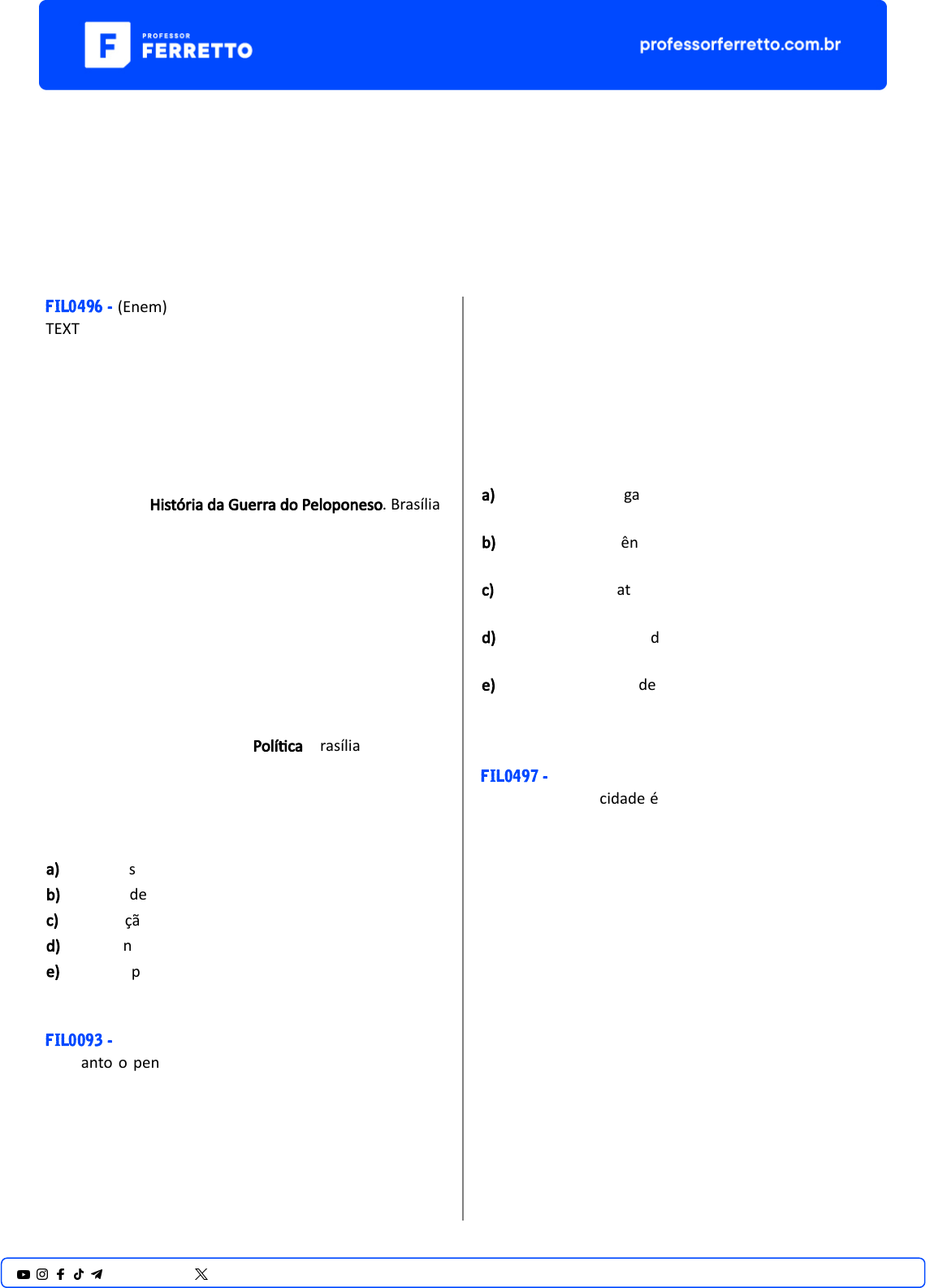 ENEM Filosofia Antiga Aristóteles FIL0496 - (Enem) TEXTO I Olhamos o homem alheio às a�vidades públicas não como alguém que cuida apenas de seus próprios interesses, mas como um inú�l; nós, cidadão atenienses, decidimos as questões públicas por nós mesmos na crença de que não é o debate que é empecilho à ação, e sim o fato de não se estar esclarecido pelo debate antes de chegar a hora da ação. TUCÍDIDES. História da Guerra do Peloponeso. Brasília: UnB, 1987 (adaptado). TEXTO II Um cidadão integral pode ser definido por nada mais nada menos que pelo direito de administrar jus�ça e exercer funções públicas; algumas destas, todavia, são limitadas quanto ao tempo de exercício, de tal modo que não podem de forma alguma ser exercidas duas vezes pela mesma pessoa, ou somente podem sê-lo depois de certos intervalos de tempo prefixados. ARISTÓTELES. Polí�ca. Brasília: UnB, 1985. Comparando os textos I e II, tanto para Tucídides (no século V a.C.) quanto para Aristóteles (no século IV a.C.), a cidadania era definida pelo(a) a) pres�gio social. b) acúmulo de riqueza. c) par�cipação polí�ca. d) local de nascimento. e) grupo de parentesco. FIL0093 - (Enem) Enquanto o pensamento de Santo Agos�nho representa o desenvolvimento de uma filosofia cristã inspirada em Platão, o pensamento de São Tomás reabilita a filosofia de Aristóteles – até então vista sob suspeita pela Igreja –, mostrando ser possível desenvolver uma leitura de Aristóteles compa�vel com a doutrina cristã. O aristotelismo de São Tomás abriu caminho para o estudo da obra aristotélica e para a legi�mação do interesse pelas ciências naturais, um dos principais mo�vos do interesse por Aristóteles nesse período. MARCONDES, D. Textos básicos de filosofia. Rio de Janeiro: Zahar, 2005. A Igreja Católica por muito tempo impediu a divulgação da obra de Aristóteles pelo fato de a obra aristotélica a) valorizar a inves�gação cien�fica, contrariando certos dogmas religiosos. b) declarar a inexistência de Deus, colocando em dúvida toda a moral religiosa. c) cri�car a Igreja Católica, ins�gando a criação de outras ins�tuições religiosas. d) evocar pensamentos de religiões orientais, minando a expansão do cris�anismo. e) contribuir para o desenvolvimento de sen�mentos an�rreligiosos, seguindo sua teoria polí�ca. FIL0497 - (Enem) Vemos que toda cidade é uma espécie de comunidade, e toda comunidade se forma com vistas a algum bem, pois todas as ações de todos os homens são pra�cadas com vistas ao que lhe parece um bem; se todas as comunidades visam algum bem, é evidente que a mais importante de todas elas e que inclui todas as outras tem mais que todas este obje�vo e visa ao mais importante de todos os bens. ARISTÓTELES. Polí�ca. Brasília: UnB,1988. No fragmento, Aristóteles promove uma reflexão que associa dois elementos essenciais à discussão sobre a vida em comunidade, a saber: 1@professorferretto @prof_ferretto a) É�ca e polí�ca, pois conduzem à eudaimonia. b) Retórica e linguagem, pois cuidam dos discursos na ágora. c) Meta�sica e ontologia, pois tratam da filosofia primeira. d) Democracia e sociedade, pois se referem a relações sociais. e) Geração e corrupção, pois abarcam o campo da physis. FIL0095 - (Enem PPL) Ao falar do caráter de um homem não dizemos que ele é sábio ou que possui entendimento, mas que é calmo ou temperante. No entanto, louvamos também o sábio, referindo-se ao hábito; e aos hábitos dignos de louvor chamamos virtude. ARISTÓTELES. É�ca a Nicômaco. São Paulo: Nova CuIturaI, 1973. Em Aristóteles, o conceito de virtude é�ca expressa a a) excelência de a�vidades pra�cadas em consonância com o bem comum. b) concre�zação u�litária de ações que revelam a manifestação de propósitos privados. c) concordância das ações humanas aos preceitos emanados da divindade. d) realização de ações que permitem a configuração da paz interior. e) manifestação de ações esté�cas, coroadas de adorno e beleza. FIL0699 - (Enem PPL) Sem dúvida, os sons da voz (phone) exprimem a dor e o prazer; também a encontramos nos animais em geral; sua natureza lhes permite somente sen�r a dor e o prazer e manifestar-lhes entre si. Mas o lógos é feito para exprimir o justo e o injusto. Este é o caráter dis�n�vo do homem face a todos os outros animais: só ele percebe o bem e o mal, o justo e o injusto, e os outros valores; é a posse comum desses valores que faz a família e a cidade. ARISTÓTELES. A polí�ca. São Paulo: Nova Cultural, 1987 (adaptado). Para o autor, a caracterís�ca que define o ser humano é o lógos, que consiste na: a) evolução espiritual da alma. b) apreensão gradual da verdade. c) segurança material do indivíduo. d) capacidade racional de discernir. e) possibilidade eventual de transcender. FIL0098 - (Enem) Pode-se viver sem ciência, pode-se adotar crenças sem querer jus�ficá-las racionalmente, pode-se desprezar as evidências empíricas. No entanto, depois de Platão e Aristóteles, nenhum homem honesto pode ignorar que uma outra a�tude intelectual foi experimentada, a de adotar crenças com base em razões e evidências e ques�onar tudo o mais a fim de descobrir seu sen�do úl�mo. ZINGANO, M. Platão e Aristóteles: o fascínio da filosofia. São Paulo: Odysseus, 2002. Platão e Aristóteles marcaram profundamente a formação do pensamento Ocidental. No texto, é ressaltado importante aspecto filosófico de ambos os autores que, em linhas gerais, refere-se à a) adoção da experiência do senso comum como critério de verdade. b) incapacidade de a razão confirmar o conhecimento resultante de evidências empíricas. c) pretensão de a experiência legi�mar por si mesma a verdade. d) defesa de que a hones�dade condiciona a possibilidade de se pensar a verdade. e) compreensão de que a verdade deve ser