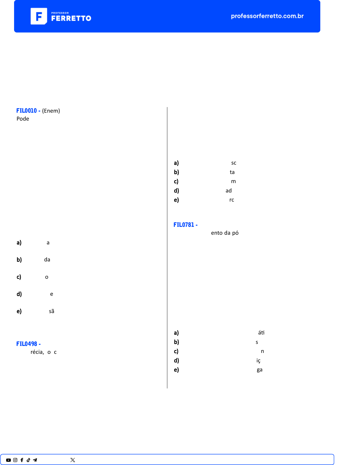 ENEM Filosofia Antiga Surgimento da Filosofia FIL0010 - (Enem) Pode-se viver sem ciência, pode-se adotar crenças sem querer jus�ficá-las racionalmente, pode-se desprezar as evidências empíricas. No entanto, depois de Platão e Aristóteles, nenhum homem honesto pode ignorar que uma outra a�tude intelectual foi experimentada, a de adotar crenças com base em razões e evidências e ques�onar tudo o mais a fim de descobrir seu sen�do úl�mo. ZINGANO, M. Platão e Aristóteles: o fascínio da filosofia. São Paulo: Odysseus, 2002. Platão e Aristóteles marcaram profundamente a formação do pensamento Ocidental. No texto, é ressaltado importante aspecto filosófico de ambos os autores que, em linhas gerais, refere-se à a) adoção da experiência do senso comum como critério de verdade. b) incapacidade de a razão confirmar o conhecimento resultante de evidências empíricas. c) pretensão de a experiência legi�mar por si mesma a verdade. d) defesa de que a hones�dade condiciona a possibilidade de se pensar a verdade. e) compreensão de que a verdade deve ser jus�ficada racionalmente. FIL0498 - (Enem) Na Grécia, o conceito de povo abrange tão somente aqueles indivíduos considerados cidadãos. Assim é possível perceber que o conceito de povo era muito restri�vo. Mesmo tendo isso em conta, a forma democrá�ca vivenciada e experimentada pelos gregos atenienses nos séculos IV e V a.C. pode ser caracterizada, fundamentalmente, como direta. MANDUCO, A. Ciência polí�ca. São Paulo: Saraiva. 2011. Naquele contexto, a emergência do sistema de governo mencionado no excerto promoveu o(a) a) compe�ção para a escolha de representantes. b) campanha pela revitalização das oligarquias. c) estabelecimento de mandatos temporários. d) declínio da sociedade civil organizada. e) par�cipação no exercício do poder. FIL0781 - (Enem PPL) O aparecimento da pólis, situado entre os séculos VIII e VII a.C., cons�tui, na história do pensamento grego, um acontecimento decisivo. Certamente, no plano intelectual como no domínio das ins�tuições, a vida social e as relações entre os homens tomam uma forma nova, cuja originalidade foi plenamente sen�da pelos gregos, manifestando-se no surgimento da filosofia. VERNANT, J.-P. As origens do pensamento grego. Rio de Janeiro: Difel, 2004 (adaptado). Segundo Vernant, a filosofia na an�ga Grécia foi resultado do(a) a) cons�tuição do regime democrá�co. b) contato dos gregos com outros povos. c) desenvolvimento no campo das navegações. d) aparecimento de novas ins�tuições religiosas. e) surgimento da cidade como organização social. 1@professorferretto @prof_ferretto