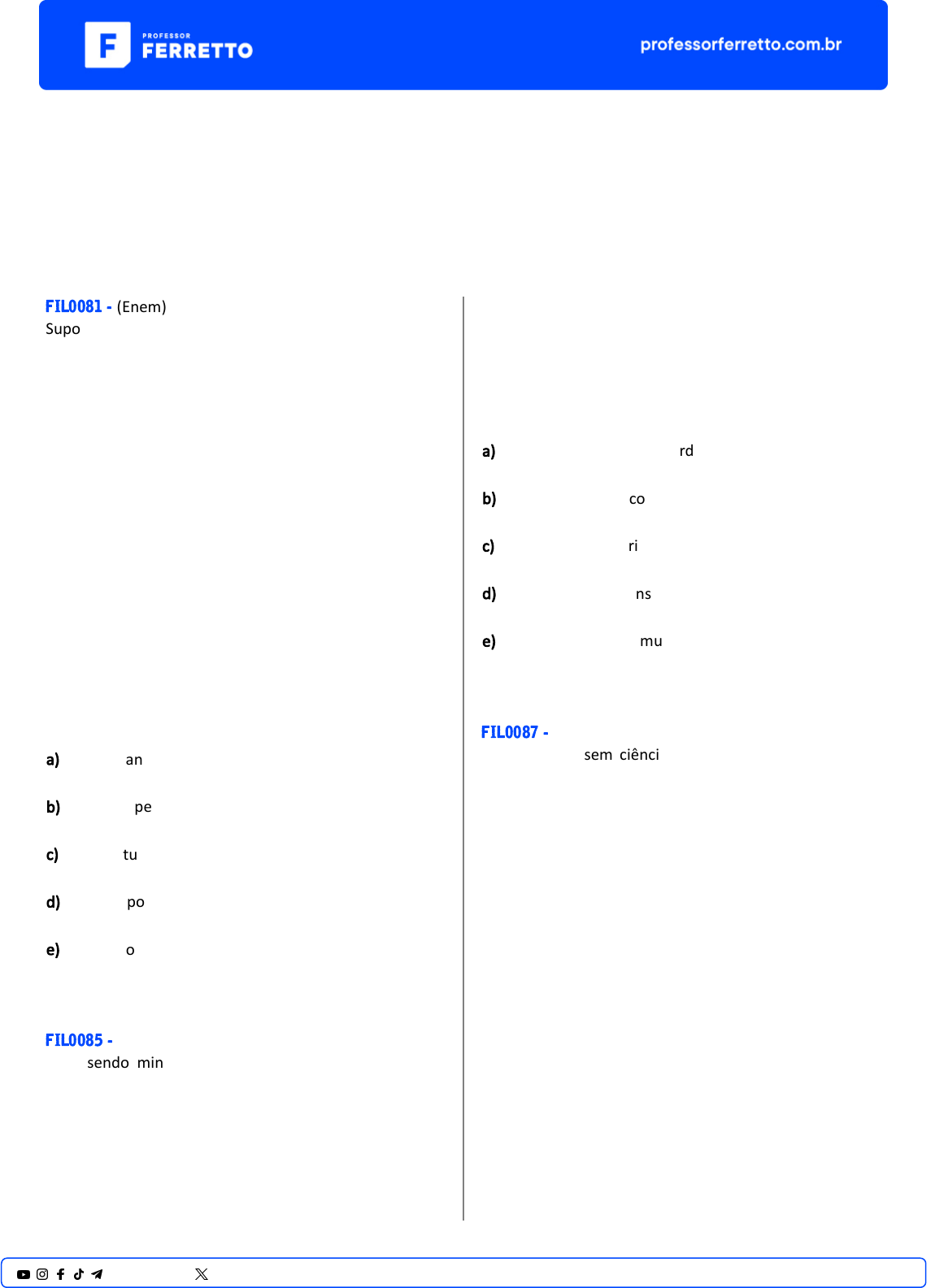 ENEM Filosofia Antiga Platão FIL0081 - (Enem) Suponha homens numa morada subterrânea, em forma de caverna, cuja entrada, aberta à luz, se estende sobre todo o comprimento da fachada; eles estão lá desde a infância, as pernas e o pescoço presos por correntes, de tal sorte que não podem trocar de lugar e só podem olhar para frente, pois os grilhões os impedem de voltar a cabeça; a luz de uma fogueira acesa ao longe, numa elevada do terreno, brilha por detrás deles; entre a fogueira e os prisioneiros, há um caminho ascendente; ao longo do caminho, imagine um pequeno muro, semelhante aos tapumes que os manipuladores de marionetes armam entre eles e o público e sobre os quais exibem seus pres�gios. PLATÃO. A República. Lisboa: Fundação Calouste Gulbenkian, 2007. Essa narra�va de Platão é uma importante manifestação cultural do pensamento grego an�go, cuja ideia central, do ponto de vista filosófico, evidencia o(a) a) caráter antropológico, descrevendo as origens do homem primi�vo. b) sistema penal da época, cri�cando o sistema carcerário da sociedade ateniense. c) vida cultural e ar�s�ca, expressa por dramaturgos trágicos e cômicos gregos. d) sistema polí�co eli�sta, provindo do surgimento da pólis e da democracia ateniense. e) teoria do conhecimento, expondo a passagem do mundo ilusório para o mundo das ideias. FIL0085 - (Enem) Mas, sendo minha intenção escrever algo de ú�l para quem por tal se interesse, pareceu-me mais conveniente ir em busca da verdade extraída dos fatos e não à imaginação dos mesmos, pois muitos conceberam repúblicas e principados jamais vistos ou conhecidos como tendo realmente exis�do. MAQUIAVEL, N. O príncipe. Disponível em: www.culturabrasil.pro.br. Acesso em: 4 abr. 2013. A par�r do texto, é possível perceber a crí�ca maquiaveliana à filosofia polí�ca de Platão, pois há nesta a a) elaboração de um ordenamento polí�co com fundamento na bondade infinita de Deus. b) explicitação dos acontecimentos polí�cos do período clássico de forma imparcial. c) u�lização da oratória polí�ca como meio de convencer os oponentes na ágora. d) inves�gação das cons�tuições polí�cas de Atenas pelo método indu�vo. e) idealização de um mundo polí�co perfeito existente no mundo das ideias. FIL0087 - (Enem) Pode-se viver sem ciência, pode-se adotar crenças sem querer jus�ficá-las racionalmente, pode-se desprezar as evidências empíricas. No entanto, depois de Platão e Aristóteles, nenhum homem honesto pode ignorar que uma outra a�tude intelectual foi experimentada, a de adotar crenças com base em razões e evidências e ques�onar tudo o mais a fim de descobrir seu sen�do úl�mo. ZINGANO, M. Platão e Aristóteles: o fascínio da filosofia. São Paulo: Odysseus, 2002. Platão e Aristóteles marcaram profundamente a formação do pensamento Ocidental. No texto, é ressaltado importante aspecto filosófico de ambos os autores que, em linhas gerais, refere-se à 1@professorferretto @prof_ferretto a) adoção da experiência do senso comum como critério de verdade. b) incapacidade de a razão confirmar o conhecimento resultante de evidências empíricas. c) pretensão de a experiência legi�mar por si mesma a verdade. d) defesa de que a hones�dade condiciona a possibilidade de se pensar a verdade. e) compreensão de que a verdade deve ser jus�ficada racionalmente. FIL0086 - (Enem) Para Platão, o que havia de verdadeiro em Parmênides era que o objeto de conhecimento é um objeto de razão e não de sensação, e era preciso estabelecer uma relação entre objeto racional e objeto sensível ou material que privilegiasse o primeiro em detrimento do segundo. Lenta, mas irresis�velmente, a Doutrina das Ideias formava-se em sua mente. ZINGANO, M. Platão e Aristóteles: o fascínio da filosofia. São Paulo: Odysseus, 2012 (adaptado). O texto faz referência à relação entre razão e sensação, um aspecto essencial da Doutrina das Ideias de Platão (427–346 a.C.). De acordo com o texto, como Platão se situa diante dessa relação? a) Estabelecendo um abismo intransponível entre as duas. b) Privilegiando os sen�dos e subordinando o conhecimento a eles. c) Atendo-se à posição de Parmênides de que razão e sensação são inseparáveis. d) Afirmando que a razão é capaz de gerar conhecimento, mas a sensação não. e) Rejeitando a posição de Parmênides de que a sensação é superior à razão. FIL0082 - (Enem) No centro da imagem, o filósofo Platão é retratado apontando para o alto. Esse gesto significa que o conhecimento se encontra em uma instância na qual o homem descobre a a) suspensão do juízo como reveladora da verdade. b) realidade inteligível por meio do método dialé�co. c) salvação da condição mortal pelo poder de Deus. d) essência das coisas sensíveis no intelecto divino. e) ordem intrínseca ao mundo por meio da sensibilidade. FIL0584 - (Enem) Os verdadeiros filósofos, tomados senhores da cidade, sejam eles muitos ou um só, desprezam as honras como as de hoje, por julgá-las indignas de um homem livre e sem valor algum, mas, ao contrário, têm em alta conta a re�dão e as honras que dela decorrem e, julgando a jus�ça como algo muito importante e necessário, pondo- se a serviço dela e fazendo-a crescer, administram sua cidade. PLATÃO. A República. São Paulo: Mar�ns Fontes, 2006 (adaptado). No contexto da filosofia platônica, o texto expressa uma perspec�va aristocrá�ca acerca do exercício do poder, uma vez que este é legi�mado pelo(a) a) prá�ca da virtude. b) consenso da elite. c) decisão da maioria. d) riqueza do indivíduo. e) pertencimento de sangue. FIL0080 - (Enem) Estamos, pois, de acordo quando, ao ver algum objeto, dizemos: "Este objeto que estou vendo agora tem tendências para assemelhar-se a um outro ser, mas, por ter defeitos, não consegue ser tal como o ser em 2@professorferret