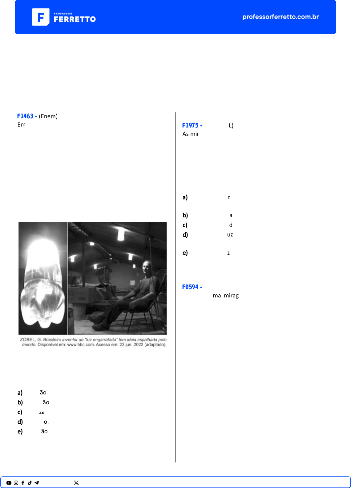 ENEM Óptica Refração F1463 - (Enem) Em 2002, um mecânico da cidade mineira de Uberaba (MG) teve uma ideia para economizar o consumo de energia elétrica e iluminar a própria casa num dia de sol. Para isso, ele u�lizou garrafas plás�cas PET com água e cloro, conforme ilustram as figuras. Cada garrafa foi fixada ao telhado de sua casa em um buraco com diâmetro igual ao da garrafa, muito maior que o comprimento de onda da luz. Nos úl�mos dois anos, sua ideia já alcançou diversas partes do mundo e deve a�ngir a marca de 1 milhão de casas u�lizando a “luz engarrafada”. Que fenômeno óp�co explica o funcionamento da “luz engarrafada”? a) Difração. b) Absorção. c) Polarização. d) Reflexão. e) Refração. F1975 - (Enem PPL) As miragens existem e podem induzir à percepção de que há água onde não existe. Elas são a manifestação de um fenômeno óp�co que ocorre na atmosfera. Disponível em: www.invivo.fiocruz.br. Acesso em: 29 fev. 2012. Esse fenômeno óp�co é consequência da a) refração da luz nas camadas de ar próximas do chão quente. b) reflexão da luz ao incidir no solo quente. c) reflexão difusa da luz na super�cie rugosa. d) dispersão da luz nas camadas de ar próximas do chão quente. e) difração da luz nas camadas de ar próximas do chão quente. F0594 - (Enem) Será que uma miragem ajudou a afundar o Titanic? O fenômeno ó�co conhecido como Fata Morgana pode fazer com que uma falsa parede de água apareça sobre o horizonte molhado. Quando as condições são favoráveis, a luz refle�da pela água fria pode ser desviada por uma camada incomum de ar quente acima, chegando até o observador, vinda de muitos ângulos diferentes. De acordo com estudos de pesquisadores da Universidade de San Diego, uma Fata Morgana pode ter obscurecido os icebergs da visão da tripulação que estava a bordo do Titanic. Dessa forma, a certa distância, o horizonte verdadeiro fica encoberto por uma névoa escurecida, que se parece muito com águas calmas no escuro. Disponível em: h�p://apod.nasa.gov. Acesso em: 6 set. 2012 (adaptado). O fenômeno ó�co que, segundo os pesquisadores, provoca a Fata Morgana é a 1@professorferretto @prof_ferretto a) ressonância. b) refração. c) difração. d) reflexão. e) difusão. F1974 - (Enem PPL) Folhas de papel, como as u�lizadas para a impressão de documentos, são opacas e permeáveis aos líquidos. Esse material é cons�tuído de microfibras entrelaçadas de celulose, que são transparentes à luz. Quando sobre elas se derrama glicerina, elas se tornam translúcidas. Uma imagem da super�cie de uma folha de papel, ampliada por um microscópio eletrônico de varredura, pode ser vista na figura. No quadro é apresentada a razão (n) entre a velocidade da luz no vácuo e no respec�vo material (celulose, glicerina ou ar). Material n celulose 1,46 glicerina 1,47 ar 1,00 Nessa situação, o papel se tornou translúcido porque a luz é a) mais refle�da. b) mais absorvida. c) mais espalhada. d) menos refratada. e) menos transmi�da. F0379 - (Enem) Uma proposta de disposi�vo capaz de indicar a qualidade da gasolina vendida em postos e, consequentemente, evitar fraudes, poderia u�lizar o conceito de refração luminosa. Nesse sen�do, a gasolina não adulterada, na temperatura ambiente, apresenta razão entre os senos dos raios incidente e refratado igual a 1,4. Desse modo, fazendo incidir o feixe de luz proveniente do ar com um ângulo fixo e maior que zero, qualquer modificação no ângulo do feixe refratado indicará adulteração no combus�vel. Em uma fiscalização ro�neira, o teste apresentou o valor de 1,9. Qual foi o comportamento do raio refratado? a) Mudou de sen�do. b) Sofreu reflexão total. c) A�ngiu o valor do ângulo limite. d) Direcionou-se para a super�cie de separação. e) Aproximou-se da normal à super�cie de separação. F0531 - (Enem) A figura representa um prisma óp�co, cons�tuído de um material transparente, cujo índice de refração é crescente com a frequência da luz que sobre ele incide. Um feixe luminoso, composto por luzes vermelha, azul e verde, incide na face A, emerge na face B e, após ser refle�do por um espelho, incide num filme para fotografia colorida, revelando três pontos. Observando os pontos luminosos revelados no filme, de baixo para cima, constatam-se as seguintes cores: a) Vermelha, verde, azul. b) Verde, vermelha, azul. c) Azul, verde, vermelha. d) Verde, azul, vermelha. e) Azul, vermelha, verde. F1982 - (Enem PPL) A fotografia feita sob luz polarizada é usada por dermatologistas para diagnós�cos. Isso permite ver detalhes da super�cie da pele que não são visíveis com o reflexo da luz branca comum. Para se obter luz polarizada, pode-se u�lizar a luz transmi�da por um 2@professorferretto @prof_ferretto polaroide ou a luz refle�da por uma super�cie na condição de Brewster, como mostra a figura. Nessa situação, o feixe da luz refratada forma um ângulo de 90˚ com o feixe da luz refle�da, fenômeno conhecido como Lei de Brewster. Nesse caso, o ângulo da incidência θp, também chamado de ângulo de polarização, e o ângulo de refração θr estão em conformidade com a Lei de Snell. Considere um feixe de luz não polarizada proveniente de um meio com índice de refração igual a 1, que incide sobre uma lâmina e faz um ângulo de refração θr de 30˚. Nessa situação, qual deve ser o índice de refração da lâmina para que o feixe refle�do seja polarizado? a) √3 b) (√3)/3 c) 2 d) 1/2 e) (√3)/2 F2011 - (Enem PPL) A faixa espectral da radiação solar que contribui fortemente para o efeito mostrado na �rinha é caracterizada como a) visível. b) amarela. c) vermelha. d) ultravioleta. e) infravermelha. F0564 - (Enem) Em uma linha de transmissão de informações por fibra óp�ca, quando um sinal diminui sua intensidade para valores inferiores a 10 dB, este precisa ser retransmi
