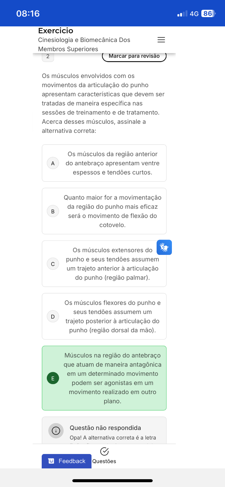 08:16 4G 86 Exercicio Cinesiologia e Biomecânica Dos Membros Superiores 2 Marcar para revisão Os músculos envolvidos com os movimentos da articulação do punho apresentam características que devem ser tratadas de maneira específica nas sessões de treinamento e de tratamento. Acerca desses músculos, assinale a alternativa correta: Os músculos da região anterior A do antebraço apresentam ventre espessos e tendões curtos. Quanto maior for a movimentação da região do punho mais eficaz B será o movimento de flexão do cotovelo. Os músculos extensores do punho e seus tendões assumem C um trajeto anterior à articulação do punho (região palmar). Os músculos flexores do punho e seus tendões assumem um D trajeto posterior à articulação do punho (região dorsal da mão). Músculos na região do antebraço que atuam de maneira antagônica em um determinado movimento E podem ser agonistas em um movimento realizado em outro plano. Questão não respondida Opa! A alternativa correta é a letra Feedback Questões