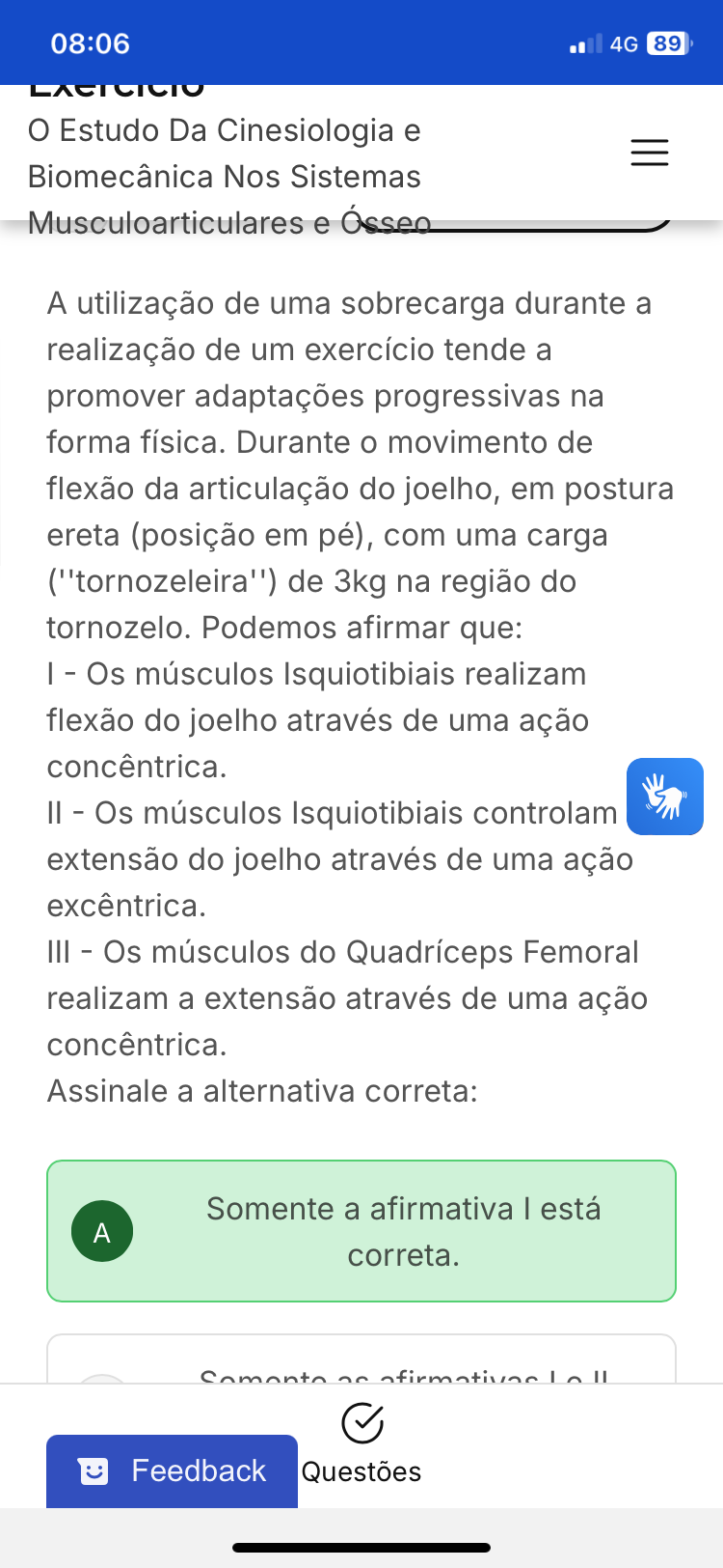 08:06 4G 89 O Estudo Da Cinesiologia e Biomecânica Nos Sistemas Musculoarticulares e A utilização de uma sobrecarga durante a realização de um exercício tende a promover adaptações progressivas na forma física. Durante o movimento de flexão da articulação do joelho, em postura ereta (posição em pé), com uma carga de 3kg na região do tornozelo. Podemos afirmar que: - Os músculos Isquiotibiais realizam flexão do joelho através de uma ação concêntrica. - - Os músculos Isquiotibiais controlam extensão do joelho através de uma ação excêntrica. III - Os músculos do Quadríceps Femoral realizam a extensão através de uma ação concêntrica. Assinale a alternativa correta: Somente a afirmativa está A correta. Feedback Questões