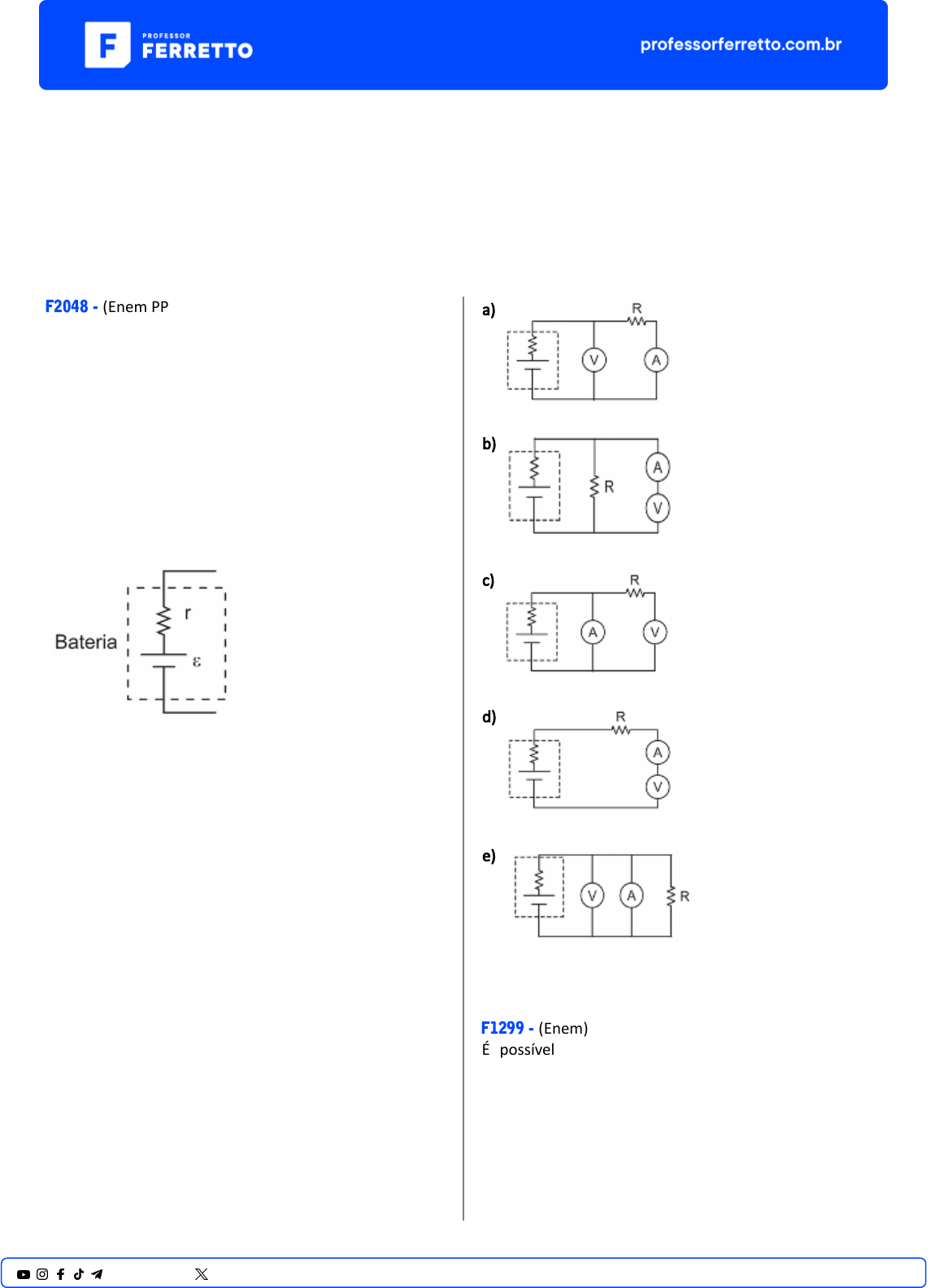 ENEM Eletrodinâmica Circuitos F2048 - (Enem PPL) Baterias são disposi�vos que acumulam energia e estão presentes em inúmeros aparelhos portáteis. Uma bateria ideal não possui resistência interna. Entretanto, baterias reais apresentam resistência interna disponibilizando uma tensão efe�va V inferior à sua tensão nominal ε, conforme a figura. Uma vez que se sabe o valor da tensão nominal da bateria, determina-se sua carga pelo conhecimento da corrente i enquanto está conectada a um circuito de resistência R, de tensão efe�va V, e da resistência interna r da bateria. De posse de um vol�metro V de um amperímetro A e de uma resistência-teste R, a configuração adequada para avaliar a carga da bateria é: a) b) c) d) e) F1299 - (Enem) É possível ligar aparelhos elétricos de baixa corrente u�lizando materiais comuns de laboratório no lugar das tradicionais pilhas. A ilustração apresenta uma montagem que faz funcionar um cronômetro digital. 1@professorferretto @prof_ferretto U�lizando a representação de projetos elétricos, o circuito equivalente a esse sistema é a) b) c) d) e) F2059 - (Enem PPL) 2@professorferretto @prof_ferretto Um mul�metro pode atuar como vol�metro (leitura em volt) ou como amperímetro (leitura em ampère), dependendo da função selecionada. A forma de conectar o mul�metro ao circuito depende da grandeza �sica a ser medida. Uma lâmpada de lanterna, de resistência elétrica igual a 40 Ω, brilha quando conectada a quatro pilhas em série, cada uma com 1,5 V de tensão elétrica. O mul�metro 2 indica o valor 5,62, conforme a figura, e o mul�metro 1 está conectado, porém desligado. Ao se ligar o mul�metro 1, a grandeza �sica e o seu valor correspondente indicados na tela são, respec�vamente, a) corrente elétrica e 0,14. b) corrente elétrica e 0,15. c) corrente elétrica e 0,29. d) tensão elétrica e 0,14. e) tensão elétrica e 225. F2060 - (Enem PPL) No circuito elétrico, estão associadas quatro lâmpadas elétricas idên�cas A, B, C e D. Considere a fonte de tensão (V) ideal. Comparando-se o brilho das lâmpadas, se a lâmpada A queimar, de modo que não possa conduzir corrente elétrica, observa-se que a) as lâmpadas B e D apagam-se, e C permanece acesa com o mesmo brilho. b) a lâmpada B apaga-se, a C permanece acesa com mesmo brilho e D permanece apagada. c) a lâmpada B apaga-se, a C permanece acesa com maior brilho e D permanece acesa com o mesmo brilho. d) a lâmpada B apaga-se, a C permanece acesa com o mesmo brilho e D permanece acesa com maior brilho. e) as lâmpadas C e D permanecem acesas com o mesmo brilho e B permanece acesa com maior brilho. F0562 - (Enem) Fusível é um disposi�vo de proteção contra sobrecorrente em circuitos. Quando a corrente que passa por esse componente elétrico é maior que sua máxima corrente nominal, o fusível queima. Dessa forma, evita que a corrente elevada danifique os aparelhos do circuito. Suponha que o circuito elétrico mostrado seja alimentado por uma fonte de tensão U e que o fusível suporte uma corrente nominal de 500 mA. Qual é o máximo valor da tensão U para que o fusível não queime? 3@professorferretto @prof_ferretto a) 20 V b) 40 V c) 60 V d) 120 V e) 185 V F0625 - (Enem) Medir temperatura é fundamental em muitas aplicações, e apresentar a leitura em mostradores digitais é bastante prá�co. O seu funcionamento é baseado na correspondência entre valores de temperatura e de diferença de potencial elétrico. Por exemplo, podemos usar o circuito elétrico apresentado, no qual o elemento sensor de temperatura ocupa um dos braços do circuito (Rs) e a dependência da resistência com a temperatura é conhecida. Para um valor de temperatura em que RS = 100Ω, a leitura apresentada pelo vol�metro será de a) +6,2V. b) +1,7V. c) +0,3V. d) –0,3V. e) –6,2V. 4@professorferretto @prof_ferretto