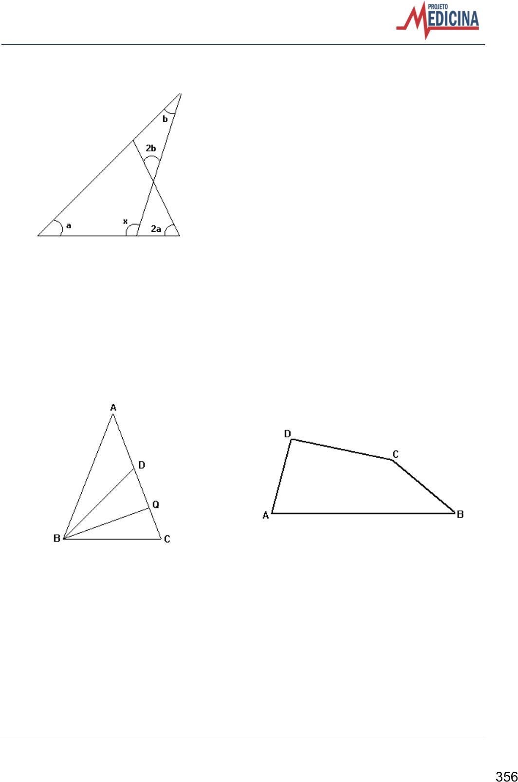 7 | P r o j e t o M e d i c i n a – w w w . p r o j e t o m e d i c i n a . c o m . b r 27. (Ufmg 97) Observe a figura. Nela, a, 2a, b, 2b, e x representam as medidas, em graus, dos ângulos assinalados. O valor de x, em graus, é: a) 100 b) 110 c) 115 d) 120 28. (Ufmg 97) Observe a figura. Nessa figura, tem-se: AB=AC=6, BC=BD=4 e CïQ=QïD. A tangente do ângulo CïQ é: a) Ë2/4 b) Ë2/2 c) (1+Ë2)/2 d) (Ë2-1)/2 29. (Unirio 97) Numa circunferência de 16cm de diâmetro, uma corda åæ é projetada ortogonalmente sobre o diâmetro æè. Sabendo-se que a referida projeção mede 4cm, a medida de åæ, em cm, é igual a: a) 6 b) 8 c) 10 d) 12 e) 14 30. (Ita 98) Seja ABC um triângulo isósceles de base BC. Sobre o lado AC deste triângulo considere um ponto D tal que os segmentos AD, BD e BC são todos congruentes entre si. A medida do ângulo BÂC é igual a: a) 23° b) 32° c) 36° d) 40° e) 45° 31. (Fuvest 98) No quadrilátero ABCD, temos AD = BC = 2 e prolongamento desses lados forma um ângulo de 60°. a) Indicando por A, B, C e D, respectivamente, as medidas dos ângulos internos do quadrilátero de vértices A, B, C e D, calcule a soma dos ângulos A + B e C + D. b) Sejam J o ponto médio do segmento DC, M o ponto médio do segmento AC e N o ponto médio do segmento BD. Calcule JM e JN. c) Calcule a medida do ângulo MJN. 356