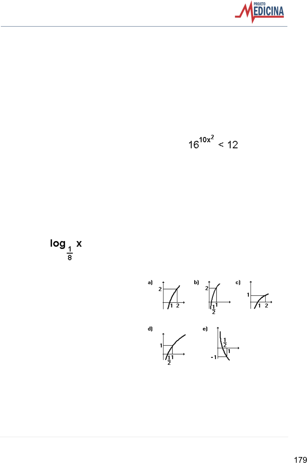 13 | P r o j e t o M e d i c i n a – w w w . p r o j e t o m e d i c i n a . c o m . b r 91. (Cesgranrio) Se log•³(2x - 5) = 0, então x vale: a) 5. b) 4. c) 3. d) 7/3. e) 5/2. 92. (Cesgranrio) Sendo a e b as raízes da equação x£+100x-10=0, calcule o valor de log•³[(1/a) + (1/b)]. 93. (Uff) Pode-se afirmar que o valor de log 18 é igual a: a) log 20 - log 2 b) 3 log 6 c) log 3 + log 6 d) log 36 / 2 e) (log 3) (log 6) 94. (Puccamp) Se (2Ë2)Ñ = 64, o valor do logaritmo a seguir é: a) -1 b) -5/6 c) -2/3 d) 5/6 e) 2/3 95. (Unesp) Sejam x e y números reais positivos. Se log(xy) = 14 e log(x£/y) = 10, em que os logaritmos são considerados numa mesma base, calcule, ainda nessa base: a) log x e log y b) log (Ëx . y). 96. (Unesp) Sejam a e b números reais positivos tais que a.b=1. Se logÝaö = logÝbò, em que C é um número real (C>0 e C·1), calcule os valores de a e b. 97. (Pucsp) Dados log 2 = 0,30 e log 3 = 0,48, um número real k é solução da inequação mostrada na figura adiante, se, somente se, a) k > -3 e k · 0,3. b) k 0,3. c) k 3. d) -3