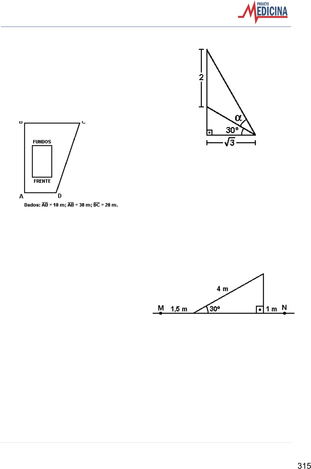 15 | P r o j e t o M e d i c i n a – w w w . p r o j e t o m e d i c i n a . c o m . b r 70. (Fgv) Num triângulo retângulo, a hipotenusa mede 15 e o ângulo AïC mede 60°. A soma das medidas dos catetos vale: a) 15(1+Ë3)/4 b) 15/4 c) 15(1+Ë3) d) 15/2 e) 15(1+Ë3)/2 71. (Ufjf) Num terreno em forma de um trapézio ABCD, com ângulos retos nos vértices A e B, deseja-se construir uma casa de base retangular, com 8 metros de frente, sendo esta paralela ao limite do terreno representado pelo segmento AD, como mostra a figura. O código de obras da cidade, na qual se localiza este terreno, exige que qualquer construção tenha uma distância mínima de 2 metros de cada divisa lateral. Sendo assim, para aprovação do projeto da casa a ser construída, é necessário que sua frente mantenha uma distância mínima do limite representado pelo segmento AD de: a) 2 m. b) 4 m. c) 6 m. d) 8 m. e) 10 m. 72. (Mackenzie) Na figura, tg ‘ vale: a) 1/3 b) 2/Ë3 c) 1/Ë3 d) 3/4 e) 2/3 73. (Pucrs) Uma bola foi chutada do ponto M, subiu a rampa e foi até o ponto N, conforme a figura a seguir. A distância entre M e N é, aproximadamente, a) 4,2 m b) 4,5 m c) 5,9 m d) 6,5 m e) 8,5 m 315