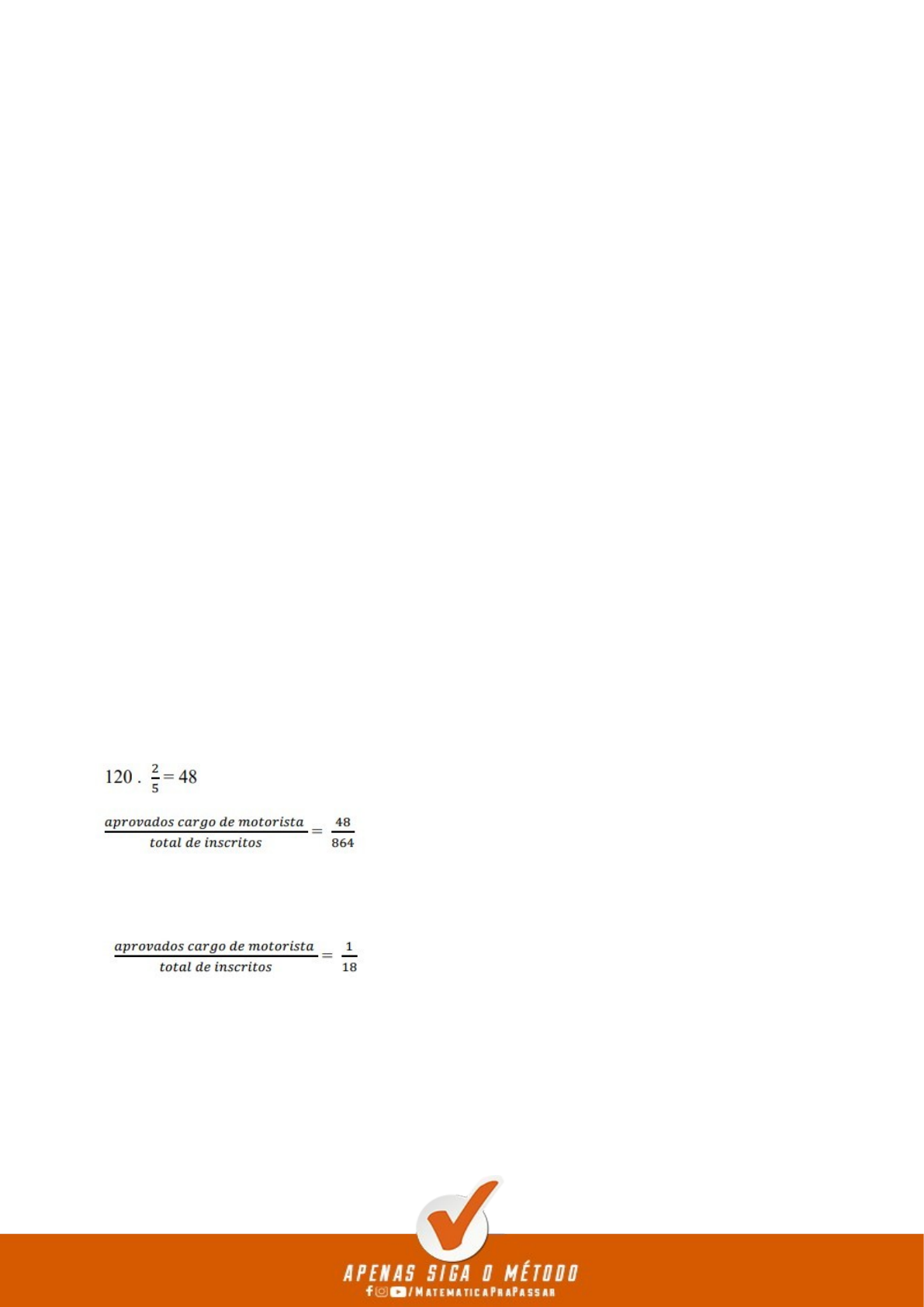 Página 286 Salário → 332.40 Gastou com moradia → 2/8 de 332,40 = 83,1 Gastou com alimentação → 3/8 de 332,40 = 124,65 Gasto total → 124,65 + 83,10 = 207,75 Restou → 332,40 – 207,75 = 124,65 Ou Gastou → 2/8 + 3/8 = 5/8 Sobrou → 1 – 5/8 = 3/8 3/8 de 332,40 = 124,65 Gabarito C 3 - Em um concurso houve um total de 846 inscritos. Para o cargo de motorista foram 120 inscritos e 2/5 desse número foram aprovados no concurso. A fração que representa o número de aprovados para o cargo de motorista em relação ao total de inscritos no concurso é de: a) 1/18 b) 4/11 c) 26/15 d) 29/28 Resolução da questão Gabarito A 4 - Em uma praça, 1/3 dos homens, 2/7 das mulheres, 5/12 das crianças estão com, pelo menos, uma peça de roupa na cor azul. O total de pessoas que estão com pelo menos uma peça de roupa dessa cor é: a) 7/12 b) 4/11