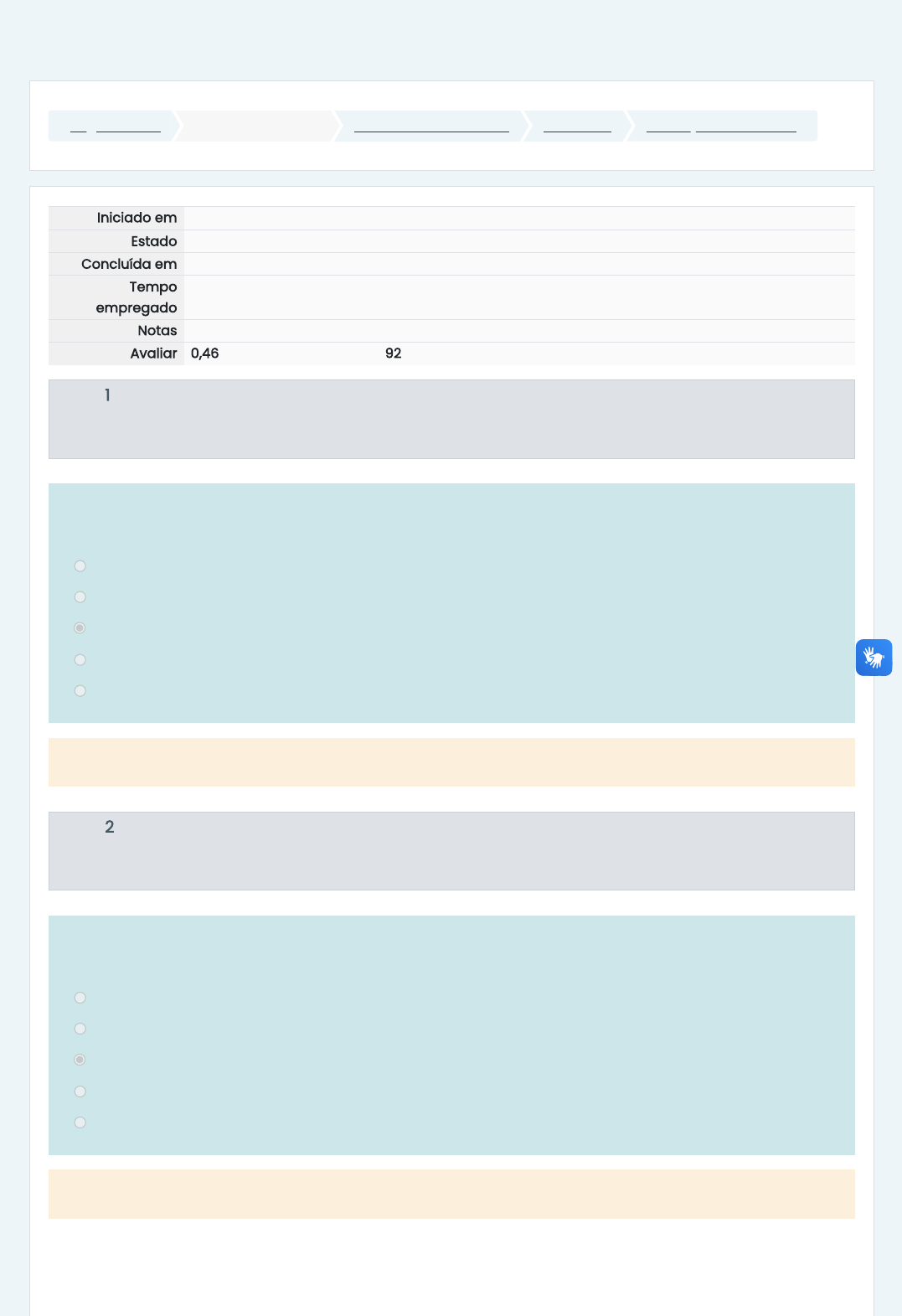 Página inicial Minhas disciplinas 2024/4 - PISCICULTURA UNIDADE II Avaliação - Unidade II Iniciado em domingo, 20 out 2024, 15:37 Estado Finalizada Concluída em domingo, 20 out 2024, 16:50 Tempo empregado 1 hora 13 minutos Notas 0,55/0,60 Avaliar 0,46 de um máximo de 0,50(92%) Questão 1 Correto Atingiu 0,05 de 0,05 Questão 2 Correto Atingiu 0,05 de 0,05 A produção de peixes (kg/ciclo) é variável, em que depende do sistema de produção em que é utilizado. Dentre as mais diversas estruturas, uma tem a capacidade de produzir até 150kg/m³/ciclo. Qual é esta estrutura? a. Viveiro escavado. b. Caixa d’água. c. Tanque-rede. d. Barragem. e. Lagos. A resposta correta é: Tanque-rede. Algumas espécies de peixes não possuem um hábito alimentar exclusivo, podendo se alimentar de frutos e sementes na época cheia dos rios e de zooplâncton na época da seca. Uma dessas espécies é: a. Surubim. b. Traíra. c. Tambaqui. d. Lambari. e. Tilápia. A resposta correta é: Tambaqui. https://ambienteonline.uninga.br/ https://ambienteonline.uninga.br/course/view.php?id=29616 https://ambienteonline.uninga.br/course/view.php?id=29616§ion=4 https://ambienteonline.uninga.br/mod/quiz/view.php?id=854128 Questão 3 Correto Atingiu 0,05 de 0,05 Questão 4 Incorreto Atingiu 0,00 de 0,05 Alguns fatores são determinantes para qualidade da ração de peixes. Um desses fatores determina a flutuabilidade e estabilidade da ração. a. Tamanho uniforme. b. Moagem. c. Qualidade física. d. Palatabilidade. e. Digestibilidade. A resposta correta é: Qualidade física. As incubadoras são destinadas a: a. Alevinagem b. Larvicultura c. Reprodução d. Terminação e. Engorda A resposta correta é: Larvicultura Questão 5 Correto Atingiu 0,05 de 0,05 Questão 6 Correto Atingiu 0,05 de 0,05 Durante o processo de fabricação de rações, a peletizadas corresponde a: (V) ou falso (F): ( ) Mistura dos ingredientes é comprimida utilizando umidade, calor e pressão. ( ) O produto final é um péletes denso. ( ) O produto final afunda rapidamente. ( ) É considerado uma proporção de pós finos na ração. a. V, F, F, V. b. F, V, V, F. c. F, V, F, V. d. V, V, V, V. e. F, F, V, V. A resposta correta é: V, V, V, V. No sistema de produção com renovação de água pode se utilizar diversas estruturas, sendo: (V) ou falso (F): ( ) Viveiros e barragens. ( ) Caixas d’água. ( ) Lagos. ( ) Tanques-rede. a. F, V, V, F. b. F, F, V, V. c. V, F, F, V. d. V, V, V, V. e. F, V, F, V. A resposta correta é: V, F, F, V. Questão 7 Correto Atingiu 0,05 de 0,05 Questão 8 Correto Atingiu 0,05 de 0,05 O ingrediente que contém mais de 18% de fibra bruta, pode ser classificado em: a. Aditivos. b. Minerais. c. Proteícos. d. Fibrosos. e. Energéticos; A resposta correta é: Fibrosos. Os peixes detritívoros são: a. Se alimentam predominantemente de itens de origem animal. b. Se alimentam predominantemente de frutas. c. que se alimentam de uma mistura de sedimentos e de itens vegetais e animais em decomposição. d. Se alimentam tanto de itens de origem vegetal quanto animal. e. se alimentam predominantemente de itens de origem vegetal. A resposta correta é: que se alimentam de uma mistura de sedimentos e de itens vegetais e animais em decomposição. Questão 9 Correto Atingiu 0,05 de 0,05 Questão 10 Correto Atingiu 0,05 de 0,05 Para chegar ao tipo de ração, é necessário se passar por diversos processos. Em relação a ração extrusada, podemos dizer: (V) ou falso (F): ( ) A mistura de ingredientes sofre expansão em condição de elevada temperatura, umidade e pressão. ( ) A mistura de ingredientes é comprimida utilizando umidade, calor e pressão. ( ) São obtidas com a secagem de uma pasta de ração em um rolo aquecido. ( ) Há redução na quantidade de pós e finos e produção de um pélete que flutua na água. a. F, F, V, V. b. F, V, F, V. c. F, V, V, F. d. V, F, F, V. e. V, V, V, V. A resposta correta é: V, F, F, V. Quando se fala em propriedade das rações, estas podem influenciar a aceitação da dieta. As propriedades químicas podem influenciar: I. Larvas. II. Carnívoros. III. Alevinos. IV. Onívoros. a. Somente as afirmativas II e III estão corretas. b. Todas as afirmativas estão corretas. c. Somente a afirmativa II está correta. d. Somente as afirmativas I, II e III estão corretas. e. Somente as afirmativas I e II estão corretas. A resposta correta é: Somente as afirmativas I e II estão corretas. Questão 11 Correto Atingiu 0,05 de 0,05 Questão 12 Correto Atingiu 0,05 de 0,05 São comumente utilizados como primeiro alimento para larvas: I. Naúplios de artêmia, zooplâncton e ração úmida. II. Larvas de peixes forrageiros. III. Fígado de boi. IV. Gema de ovo cru de galinha. a. Somente a afirmativa II está correta. b. Somente as afirmativas I e II estão corretas. c. Somente as afirmativas II e III estão corretas. d. Todas as afirmativas estão corretas. e. Somente as afirmativas I, II e III estão corretas. A resposta correta é: Todas as afirmativas estão corretas. São requisitos para construções de viveiros: I. Clima. II. Restrições ambientais. III. Topografia IV. Qualidade de água. a. Somente as afirmativas II e III estão corretas. b. Somente a afirmativa II está correta. c. Todas as afirmativas estão corretas. d. Somente as afirmativas I e II estão corretas. e. Somente as afirmativas I, II e III estão corretas. A resposta correta é: Todas as afirmativas estão corretas. Atividade anterior ◄ Slides Videoaula 3 Seguir para... Próxima atividade Videoaula 1 ► https://ambienteonline.uninga.br/mod/resource/view.php?id=854127&forceview=1 https://ambienteonline.uninga.br/mod/page/view.php?id=854129&forceview=1 Manter contato UNINGÁ https://www.uninga.br Mobile : 0800 800 5009 Baixar o aplicativo móvel. https://www.uninga.br/ tel:Mobile : 0800 800 5009 https://www.facebook.com/uninga.edu.br/ https://www.youtube.com/channel/UCFfrZpSpL4DflIFl78P2TSQ https://www.instagram.co