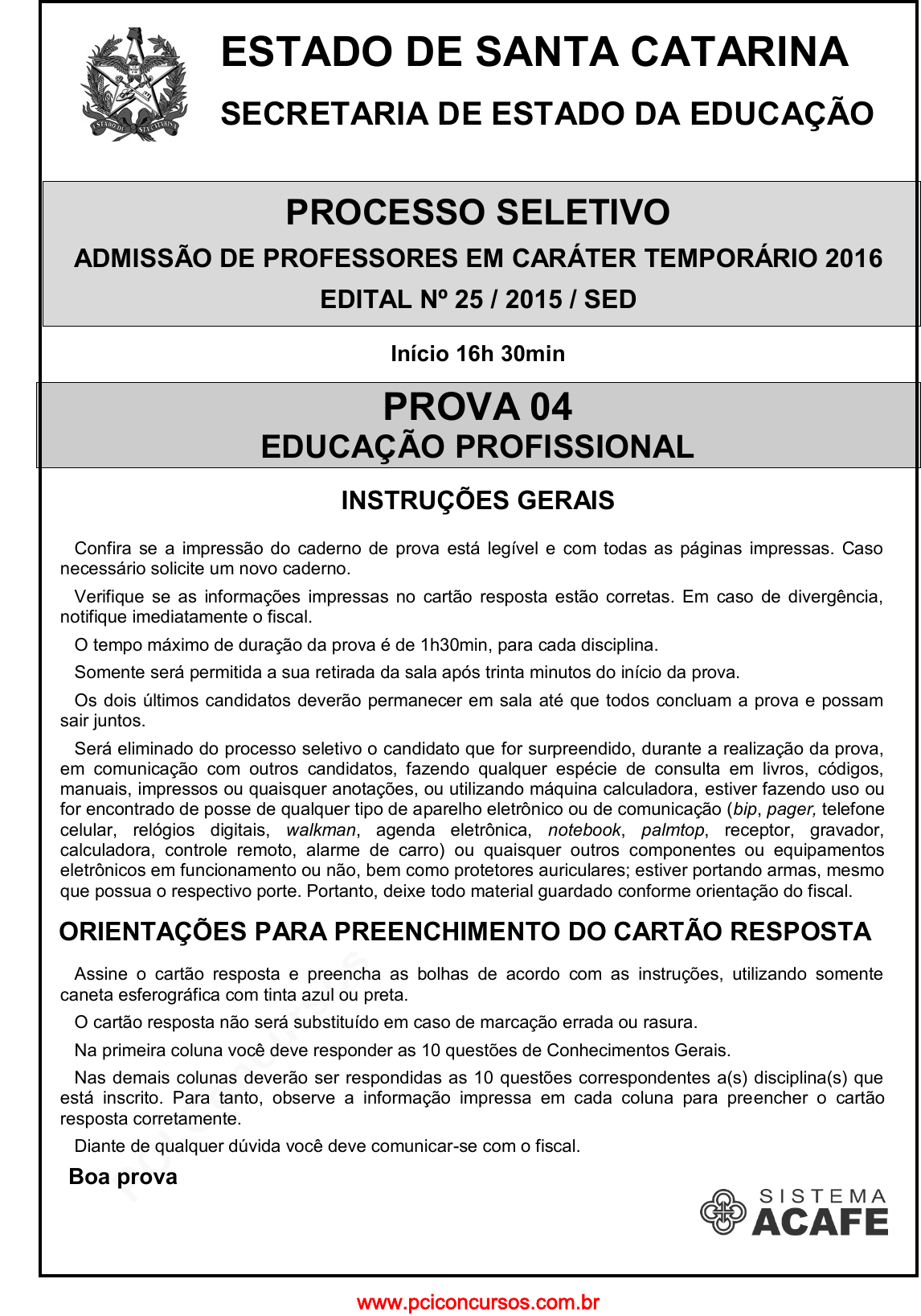 pcimarkpci MDAwMDowMDAwOjAwMDA6MDAwMDowMDAwOmZmZmY6ZDEwZTo0NDcx:U2F0LCAyNiBPY3QgMjAyNCAyMzo1NzowNSAtMDMwMA== www.pciconcursos.com.br ESTADO DE SANTA CATARINA SECRETARIA DE ESTADO DA EDUCAÇÃO PROCESSO SELETIVO ADMISSÃO DE PROFESSORES EM CARÁTER TEMPORÁRIO 2016 EDITAL Nº 25 / 2015 / SED Início 16h 30min PROVA 04 EDUCAÇÃO PROFISSIONAL INSTRUÇÕES GERAIS Confira se a impressão do caderno de prova está legível e com todas as páginas impressas. Caso necessário solicite um novo caderno. Verifique se as informações impressas no cartão resposta estão corretas. Em caso de divergência, notifique imediatamente o fiscal. O tempo máximo de duração da prova é de 1h30min, para cada disciplina. Somente será permitida a sua retirada da sala após trinta minutos do início da prova. Os dois últimos candidatos deverão permanecer em sala até que todos concluam a prova e possam sair juntos. Será eliminado do processo seletivo o candidato que for surpreendido, durante a realização da prova, em comunicação com outros candidatos, fazendo qualquer espécie de consulta em livros, códigos, manuais, impressos ou quaisquer anotações, ou utilizando máquina calculadora, estiver fazendo uso ou for encontrado de posse de qualquer tipo de aparelho eletrônico ou de comunicação (bip, pager, telefone celular, relógios digitais, walkman, agenda eletrônica, notebook, palmtop, receptor, gravador, calculadora, controle remoto, alarme de carro) ou quaisquer outros componentes ou equipamentos eletrônicos em funcionamento ou não, bem como protetores auriculares; estiver portando armas, mesmo que possua o respectivo porte. Portanto, deixe todo material guardado conforme orientação do fiscal. ORIENTAÇÕES PARA PREENCHIMENTO DO CARTÃO RESPOSTA Assine o cartão resposta e preencha as bolhas de acordo com as instruções, utilizando somente caneta esferográfica com tinta azul ou preta. O cartão resposta não será substituído em caso de marcação errada ou rasura. Na primeira coluna você deve responder as 10 questões de Conhecimentos Gerais. Nas demais colunas deverão ser respondidas as 10 questões correspondentes a(s) disciplina(s) que está inscrito. Para tanto, observe a informação impressa em cada coluna para preencher o cartão resposta corretamente. Diante de qualquer dúvida você deve comunicar-se com o fiscal. Boa prova www.pciconcursos.com.br pcimarkpci MDAwMDowMDAwOjAwMDA6MDAwMDowMDAwOmZmZmY6ZDEwZTo0NDcx:U2F0LCAyNiBPY3QgMjAyNCAyMzo1NzowNSAtMDMwMA== www.pciconcursos.com.br SUMÁRIO DISCIPLINAS PÁGINA Conhecimentos Gerais 03 Administração 04 Agronegócio 07 Agroecologia 09 Agropecuária 10 Alimentos 12 Análises Clínicas 14 Biotecnologia 16 Comércio 18 Contabilidade 20 Cozinha 22 Desenho 24 Direito 25 Economia 28 Edificações 29 Eletrônica 31 Eletrotécnica 33 Enfermagem 35 Hospedagem 36 Informática 38 Inglês / Inglês Instrumental / Inglês Técnico 39 Massoterapia 41 Matemática Aplicada 43 Mecânica 44 Meio Ambiente 45 Português / Português Instrumental 47 Psicologia 48 Química / Química Geral 49 Recursos Humanos 51 Saneamento 54 Saúde Bucal 55 Segurança no Trabalho 57 Transações Imobiliárias 58 Vestuário 60 Zootecnia 61 www.pciconcursos.com.br pcimarkpci MDAwMDowMDAwOjAwMDA6MDAwMDowMDAwOmZmZmY6ZDEwZTo0NDcx:U2F0LCAyNiBPY3QgMjAyNCAyMzo1NzowNSAtMDMwMA== www.pciconcursos.com.br3 CONHECIMENTOS GERAIS 01) O texto Escola Projeto Coletivo, da proposta curricular SC/2005, diz que: “Diminuir a repetência e aumentar a permanência implica na revisão da avaliação que se processa na escola.” Neste senti- do a avaliação deve: A diagnosticar as falhas cometidas pelo docen- te, pois sempre que um estudante não aprende é porque o conteúdo foi mal selecionado e explicado pelo professor. B interferir e redefinir os caminhos a serem per- corridos exclusivamente pelos estudantes, que devem ter suas falhas destacadas. C abolir provas e pesquisas individuais porque são instrumentos ultrapassados que não colabo- ram em nada com o processo de ensino e aprendi- zagem. D diagnosticar os avanços e entraves do pro- cesso para intervir, problematizar, interferir e rede- finir os caminhos a serem percorridos. E ser abolida, e a aprovação deve ser automá- tica; cada um aprende o que pode no ano letivo e isto deve ser respeitado. ======================================= 02) A avaliação formativa é aquela em que o pro- fessor está atento aos processos e às aprendiza- gens de seus estudantes. Nesse sentido, é correto afirmar, exceto: (Indagações sobre o currículo- currículo e Avaliação- MEC/2007) A O professor não avalia com o propósito de dar uma nota, pois dentro de uma lógica formativa, a nota é uma decorrência do processo e não o seu fim último. B A avaliação formativa é aquela que o profes- sor faz por observação do desempenho, sem utili- zar instrumentos de verificação como trabalhos em sala de aula e atividades extraclasse. C O professor deve entender que a avaliação é essencial para dar prosseguimento aos percursos de aprendizagem. D A avaliação faz parte do cotidiano das tarefas propostas, das observações atentas do professor, das práticas de sala de aula. E A avaliação formativa é aquela que orienta os estudantes para a realização de seus trabalhos e de suas aprendizagens, ajudando-os a localizar suas dificuldades e suas potencialidades, redire- cionando-os em seus percursos. ======================================= 03) O texto Escola Projeto Coletivo, da Proposta Curricular SC/2005, afirma que: “O conhecimento, corporificado como currículo, não pode ser visto de modo ingênuo e não problemático, mas deve ser analisado em sua constituição social e histórica.” Nesse sentido cabe à escola preocupar-se com o conhecimento a ser trabalhado, pois: A o currículo, ao incorporar temas polêmicos, pode induzir os estudantes a rebeldia e prejudicar os valores da moral e dos bons costumes. Neste sentido, tais temas d