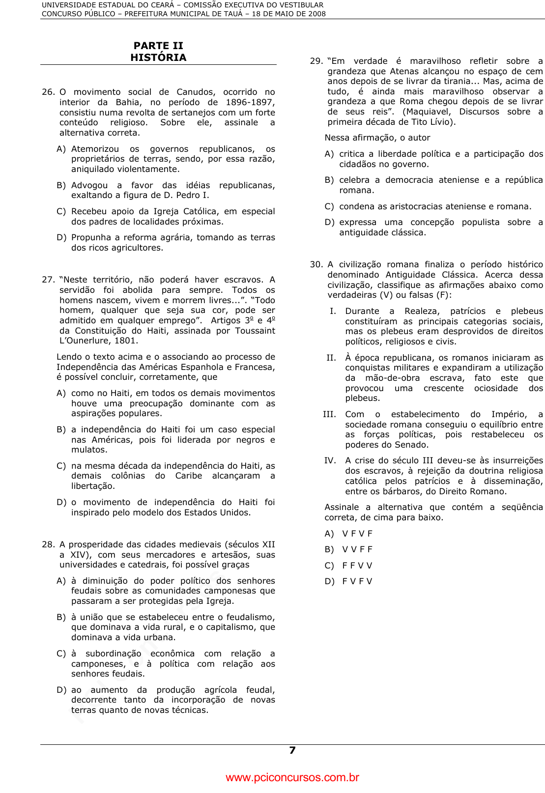 pcimarkpci MDAwMDowMDAwOjAwMDA6MDAwMDowMDAwOmZmZmY6ZDEwZTo0NDcx:U2F0LCAyNiBPY3QgMjAyNCAyMzo1MTowOSAtMDMwMA== www.pciconcursos.com.br UNIVERSIDADE ESTADUAL DO CEARÁ – COMISSÃO EXECUTIVA DO VESTIBULAR CONCURSO PÚBLICO – PREFEITURA MUNICIPAL DE TAUÁ – 18 DE MAIO DE 2008 7 PARTE II HISTÓRIA 26. O movimento social de Canudos, ocorrido no interior da Bahia, no período de 1896-1897, consistiu numa revolta de sertanejos com um forte conteúdo religioso. Sobre ele, assinale a alternativa correta. A) Atemorizou os governos republicanos, os proprietários de terras, sendo, por essa razão, aniquilado violentamente. B) Advogou a favor das idéias republicanas, exaltando a figura de D. Pedro I. C) Recebeu apoio da Igreja Católica, em especial dos padres de localidades próximas. D) Propunha a reforma agrária, tomando as terras dos ricos agricultores. 27. “Neste território, não poderá haver escravos. A servidão foi abolida para sempre. Todos os homens nascem, vivem e morrem livres...”. “Todo homem, qualquer que seja sua cor, pode ser admitido em qualquer emprego”. Artigos 3o e 4o da Constituição do Haiti, assinada por Toussaint L’Ounerlure, 1801. Lendo o texto acima e o associando ao processo de Independência das Américas Espanhola e Francesa, é possível concluir, corretamente, que A) como no Haiti, em todos os demais movimentos houve uma preocupação dominante com as aspirações populares. B) a independência do Haiti foi um caso especial nas Américas, pois foi liderada por negros e mulatos. C) na mesma década da independência do Haiti, as demais colônias do Caribe alcançaram a libertação. D) o movimento de independência do Haiti foi inspirado pelo modelo dos Estados Unidos. 28. A prosperidade das cidades medievais (séculos XII a XIV), com seus mercadores e artesãos, suas universidades e catedrais, foi possível graças A) à diminuição do poder político dos senhores feudais sobre as comunidades camponesas que passaram a ser protegidas pela Igreja. B) à união que se estabeleceu entre o feudalismo, que dominava a vida rural, e o capitalismo, que dominava a vida urbana. C) à subordinação econômica com relação a camponeses, e à política com relação aos senhores feudais. D) ao aumento da produção agrícola feudal, decorrente tanto da incorporação de novas terras quanto de novas técnicas. 29. “Em verdade é maravilhoso refletir sobre a grandeza que Atenas alcançou no espaço de cem anos depois de se livrar da tirania... Mas, acima de tudo, é ainda mais maravilhoso observar a grandeza a que Roma chegou depois de se livrar de seus reis”. (Maquiavel, Discursos sobre a primeira década de Tito Lívio). Nessa afirmação, o autor A) critica a liberdade política e a participação dos cidadãos no governo. B) celebra a democracia ateniense e a república romana. C) condena as aristocracias ateniense e romana. D) expressa uma concepção populista sobre a antiguidade clássica. 30. A civilização romana finaliza o período histórico denominado Antiguidade Clássica. Acerca dessa civilização, classifique as afirmações abaixo como verdadeiras (V) ou falsas (F): I. Durante a Realeza, patrícios e plebeus constituíram as principais categorias sociais, mas os plebeus eram desprovidos de direitos políticos, religiosos e civis. II. À época republicana, os romanos iniciaram as conquistas militares e expandiram a utilização da mão-de-obra escrava, fato este que provocou uma crescente ociosidade dos plebeus. III. Com o estabelecimento do Império, a sociedade romana conseguiu o equilíbrio entre as forças políticas, pois restabeleceu os poderes do Senado. IV. A crise do século III deveu-se às insurreições dos escravos, à rejeição da doutrina religiosa católica pelos patrícios e à disseminação, entre os bárbaros, do Direito Romano. Assinale a alternativa que contém a seqüência correta, de cima para baixo. A) V F V F B) V V F F C) F F V V D) F V F V www.pciconcursos.com.br pcimarkpci MDAwMDowMDAwOjAwMDA6MDAwMDowMDAwOmZmZmY6ZDEwZTo0NDcx:U2F0LCAyNiBPY3QgMjAyNCAyMzo1MTowOSAtMDMwMA== www.pciconcursos.com.br UNIVERSIDADE ESTADUAL DO CEARÁ – COMISSÃO EXECUTIVA DO VESTIBULAR CONCURSO PÚBLICO – PREFEITURA MUNICIPAL DE TAUÁ – 18 DE MAIO DE 2008 8 31. Com relação à expansão marítimo-comercial européia dos séculos XV e XVI, classifique as afirmações, a seguir, como verdadeiras (V) ou falsas (F). I. Não se preocupou com a formação de novos mercados para os produtos de origem artesanal ou manufatureira dos centros urbanos da Europa. II. Houve a propagação do Islamismo como única fonte de salvação. III. Criou-se a necessidade de descobrir novas jazidas de metais preciosos em outras regiões do mundo. Assinale o correto. A) Todas as afirmações estão corretas. B) Apenas a I e a II estão corretas. C) Apenas a II e a III estão corretas. D) Apenas a III está correta. 32. Se tomarmos como referência a antiguidade oriental, é correto afirmar-se sobre a sociedade egípcia que A) os faraós, apesar de estarem no topo da hierarquia social, deviam obediência aos sacerdotes, que detinham o poder teocrático. B) a alta nobreza era constituída pelos parentes do faraó, pelos altos funcionários do palácio, pelos oficiais superiores do exército, pelos chefes da administração e pelos sacerdotes. C) os escribas, homens letrados, eram considerados os “olhos e ouvidos” do faraó. D) os camponeses e os artesãos constituíam uma camada social dinâmica que controlava a economia agroindustrial egípcia. 33. A presença do indígena na História do Ceará é sempre muito repudiada por conta de termos uma versão muito européia dos fatos e eles serem considerados seres “inferiores”, mas sempre soubemos que eles foram os verdadeiros donos da terra. Sobre o tema, marque a alternativa que apresenta corretamente a localização de certos grupos indígenas no Ceará. A) Os Cariris ficam situados em parte do sertã