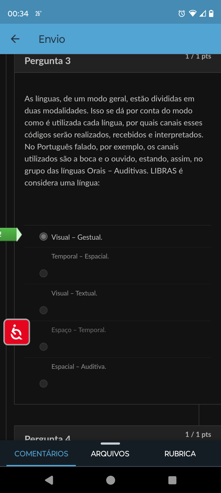 00:34 Envio 1/1 pts Pergunta 3 As línguas, de um modo geral, estão divididas em duas modalidades. Isso se dá por conta do modo como é utilizada cada língua, por quais canais esses códigos serão realizados, recebidos e interpretados. No Português falado, por exemplo, os canais utilizados são a boca e ouvido, estando, assim, no grupo das línguas Orais - Auditivas. LIBRAS é considera uma língua: ! Visual - Gestual. Temporal - Espacial. Visual - Textual. Espaço - Temporal. Espacial - Auditiva. 1/1 pts 4 COMENTÁRIOS ARQUIVOS RUBRICA