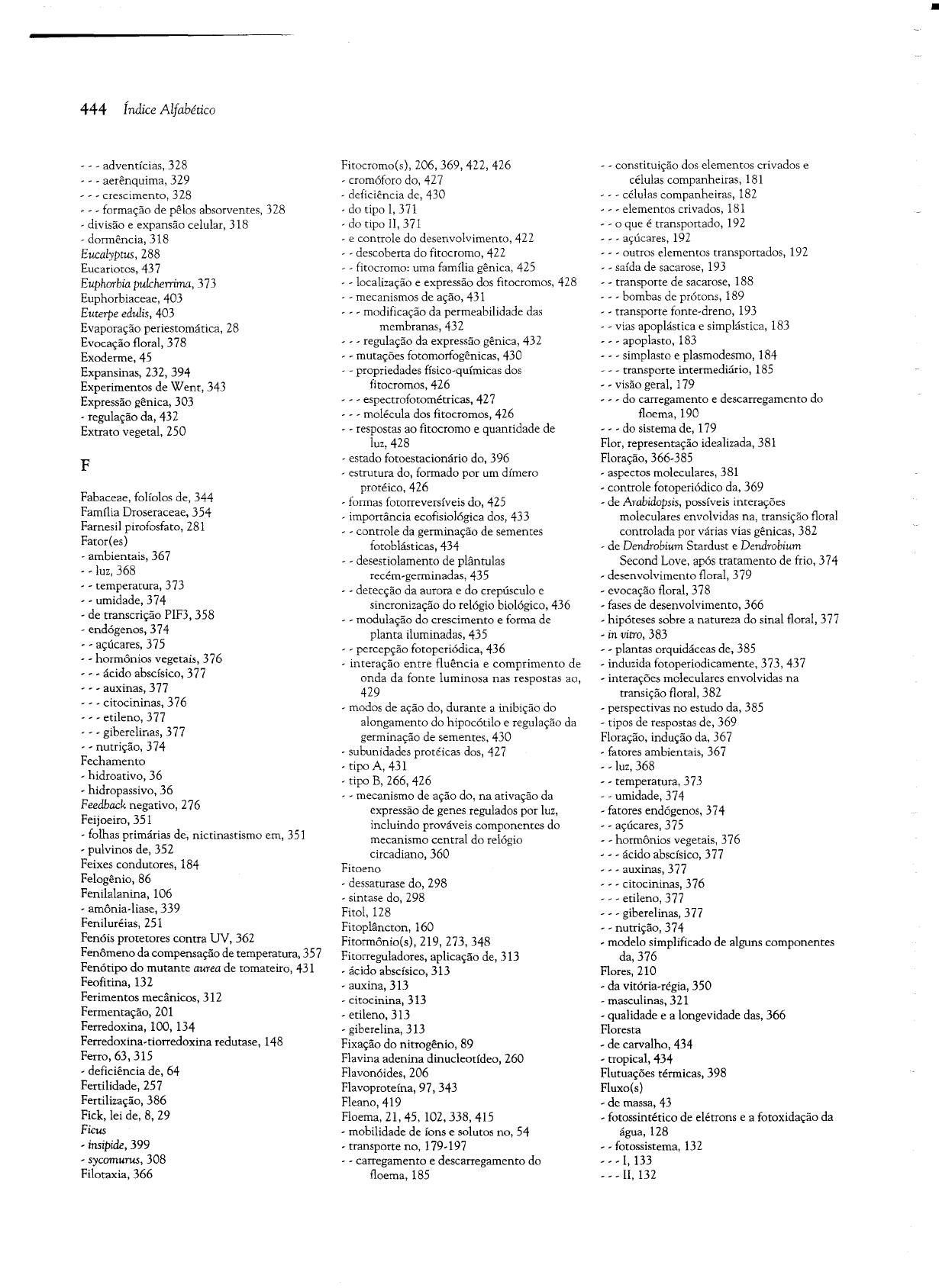 <p>444 Índice Alfabético</p><p>- - - adventícias, 328</p><p>- - - aerênquima, 329</p><p>- - - crescimento, 328</p><p>- - - formação de pêlos absorventes, 328</p><p>- divisão e expansão celular, 318</p><p>- dormência, 318</p><p>Eucalyptus, 288</p><p>Eucariotos, 437</p><p>Euphorbia pulcherrima, 373</p><p>Euphorbiaceae, 403</p><p>Euterpe edulis, 403</p><p>Evaporação periestomática, 28</p><p>Evocação floral, 378</p><p>Exoderme,45</p><p>Expansinas, 232, 394</p><p>Experimentos de Went, 343</p><p>Expressão gênica, 303</p><p>- regulação da, 432</p><p>Extrato vegetal, 250</p><p>F</p><p>Fabaceae, folíolos de, 344</p><p>Família Droseraceae, 354</p><p>Farnesil pirofosfato, 281</p><p>Fator(es)</p><p>- ambientais, 367</p><p>- - luz, 368</p><p>- - temperatura, 373</p><p>- - umidade, 374</p><p>- de transcrição PIF3, 358</p><p>- endógenos, 374</p><p>- - açúcares, 375</p><p>- - hormônios vegetais, 376</p><p>- - - ácido abscísico, 377</p><p>- - - auxinas, 377</p><p>- - - citocininas, 376</p><p>- - - etileno, 377</p><p>- - - giberelinas, 377</p><p>- - nutrição, 374</p><p>Fechamento</p><p>- hidroativo, 36</p><p>- hidropassivo, 36</p><p>Feedback negativo, 276</p><p>Feijoeiro, 351</p><p>- folhas primárias de, nictinastismo em, 351</p><p>- pulvinos de, 352</p><p>Feixes condutores, 184</p><p>Felogênio, 86</p><p>Fenilalanina, 106</p><p>- amônia-liase, 339</p><p>Feniluréias, 251</p><p>Fenóis protetores contra UV, 362</p><p>Fenômeno da compensação de temperatura, 357</p><p>Fenótipo do mutante aurea de tomateiro, 431</p><p>Feofitina, 132</p><p>Ferimentos mecânicos, 312</p><p>Fermentação, 201</p><p>Ferredoxina, 100, 134</p><p>Ferredoxina-tiorredoxina redutase, 148</p><p>Ferro, 63, 315</p><p>- deficiência de, 64</p><p>Fertilidade, 257</p><p>Fertilização, 386</p><p>Fick, lei de, 8, 29</p><p>Ficus</p><p>- insipide, 399</p><p>- sycomurus, 308</p><p>Filotaxia, 366</p><p>Fitocromo(s), 206,369,422,426</p><p>- cromóforo do, 427</p><p>- deficiência de, 430</p><p>- do tipo I, 371</p><p>- do tipo 11,371</p><p>- e controle do desenvolvimento, 422</p><p>- - descoberta do fitocromo, 422</p><p>- - fitocromo: uma família gênica, 425</p><p>- - localização e expressão dos fitocromos, 428</p><p>- - mecanismos de ação, 431</p><p>- - - modificação da permeabilidade das</p><p>membranas, 432</p><p>- - - regulação da expressão gênica, 432</p><p>- - mutações fotomorfogênicas, 430</p><p>- - propriedades físico-químicas dos</p><p>fitocromos, 426</p><p>- - - espectrofotométricas, 427</p><p>- - - molécula dos fitocromos, 426</p><p>- - respostas ao fitocromo e quantidade de</p><p>luz, 428</p><p>- estado fotoestacionário do, 396</p><p>- estrutura do, formado por um dímero</p><p>protéico, 426</p><p>- formas fotorreversíveis do, 425</p><p>- importância ecofisiológica dos, 433</p><p>- - controle da germinação de sementes</p><p>fotoblásticas,434</p><p>- - desestiolamento de plântulas</p><p>recém-germinadas, 435</p><p>- - detecção da aurora e do crepúsculo e</p><p>sincronização do relógio biológico, 436</p><p>- - modulação do crescimento e forma de</p><p>planta iluminadas, 435</p><p>- - percepção fotoperiódica, 436</p><p>- interação entre fluência e comprimento de</p><p>onda da fonte luminosa nas respostas ao,</p><p>429</p><p>- modos de ação do, durante a inibição do</p><p>alongamento do hipocótilo e regulação da</p><p>germinação de sementes, 430</p><p>- subunidades protéicas dos, 427</p><p>- tipo A, 431</p><p>- tipo B, 266, 426</p><p>- - mecanismo de ação do, na ativação da</p><p>expressão de genes regulados por luz,</p><p>incluindo prováveis componentes do</p><p>mecanismo central do relógio</p><p>circadiano, 360</p><p>Fitoeno</p><p>- dessaturase do, 298</p><p>- sintase do, 298</p><p>Fitol, 128</p><p>Fitoplâncton, 160</p><p>Fitormônio(s), 219, 273, 348</p><p>Fitorreguladores, aplicação de, 313</p><p>- ácido abscísico, 313</p><p>- auxina, 313</p><p>- citocinina, 313</p><p>- etileno, 313</p><p>- giberelina, 313</p><p>Fixação do nitrogênio, 89</p><p>Flavina adenina dinucleotídeo, 260</p><p>Flavonóides, 206</p><p>Flavoproteína, 97, 343</p><p>Fleano,419</p><p>Floema, 21,45,102,338,415</p><p>- mobilidade de íons e solutos no, 54</p><p>- transporte no, 179-197</p><p>- - carregamento e descarregamento do</p><p>floema, 185</p><p>- - constituição dos elementos crivados e</p><p>células companheiras, 181</p><p>- - - células companheiras, 182</p><p>- - - elementos crivados, 181</p><p>- - o que é transportado, 192</p><p>- - - açúcares, 192</p><p>- - - outros elementos transportados, 192</p><p>- - saída de sacarose, 193</p><p>- - transporte de sacarose, 188</p><p>- - - bombas de prótons, 189</p><p>- - transporte fonte-dreno, 193</p><p>- - vias apoplástica e simplástica, 183</p><p>- - - apoplasto, 183</p><p>- - - simplasto e plasmodesmo, 184</p><p>- - - transporte intermediário, 185</p><p>- - visão geral, 179</p><p>- - - do carregamento e descarregamento do</p><p>floema,190</p><p>- - - do sistema de, 179</p><p>Flor, representação idealizada, 381</p><p>Floração, 366-385</p><p>- aspectos moleculares, 381</p><p>- controle fotoperiódico da, 369</p><p>- de Arabidopsis, possíveis interações</p><p>moleculares envolvidas na, transição floral</p><p>controlada por várias vias gênicas, 382</p><p>- de Oendrobium Stardust e Oendrobium</p><p>Second Love, após tratamento de frio, 374</p><p>- desenvolvimento floral, 379</p><p>- evocação floral, 378</p><p>- fases de desenvolvimento, 366</p><p>- hipóteses sobre a natureza do sinal floral, 377</p><p>- in vitro, 383</p><p>- - plantas orquidáceas de, 385</p><p>- induzida fotoperiodicamente, 373, 437</p><p>- interações moleculares envolvidas na</p><p>transição floral, 382</p><p>- perspectivas no estudo da, 385</p><p>- tipos de respostas de, 369</p><p>Floração, indução da, 367</p><p>- fatores ambientais, 367</p><p>- - luz, 368</p><p>- - temperatura, 373</p><p>- - umidade, 374</p><