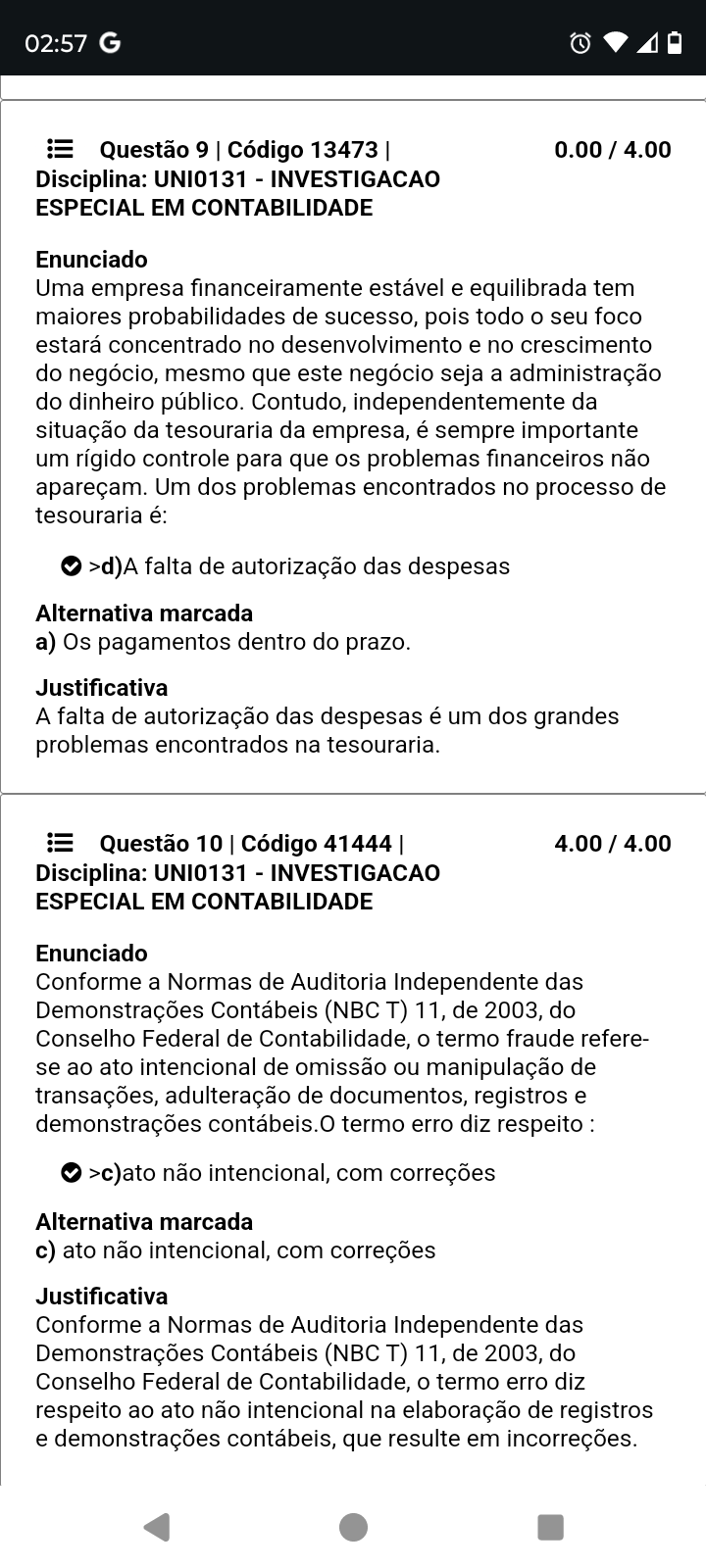 Questão 9 Código 13473 0.00/4.00 Disciplina: UNI0131 - INVESTIGACAO ESPECIAL EM CONTABILIDADE Enunciado Uma empresa financeiramente estável e equilibrada tem maiores probabilidades de sucesso, pois todo o seu foco estará concentrado no desenvolvimento e no crescimento do negócio, mesmo que este negócio seja a administração do dinheiro público. Contudo, independentemente da situação da tesouraria da empresa, é sempre importante um rígido controle para que os problemas financeiros não apareçam. Um dos problemas encontrados no processo de tesouraria é: >d)A falta de autorização das despesas Alternativa marcada a) Os pagamentos dentro do prazo. Justificativa A falta de autorização das despesas é um dos grandes problemas encontrados na tesouraria. Questão 10 Código 41444 4.00 / 4.00 Disciplina: UNI0131 INVESTIGACAO ESPECIAL EM CONTABILIDADE Enunciado Conforme a Normas de Auditoria Independente das Demonstrações Contábeis (NBC T) 11, de 2003, do Conselho Federal de Contabilidade, o termo fraude refere- se ao ato intencional de omissão ou manipulação de transações, adulteração de documentos, registros e demonstrações contábeis.0 termo erro diz respeito : >c)ato não intencional, com correções Alternativa marcada c) ato não intencional, com correções Justificativa Conforme a Normas de Auditoria Independente das Demonstrações Contábeis (NBC T) 11, de 2003, do Conselho Federal de Contabilidade, o termo erro diz respeito ao ato não intencional na elaboração de registros e demonstrações contábeis, que resulte em incorreções.