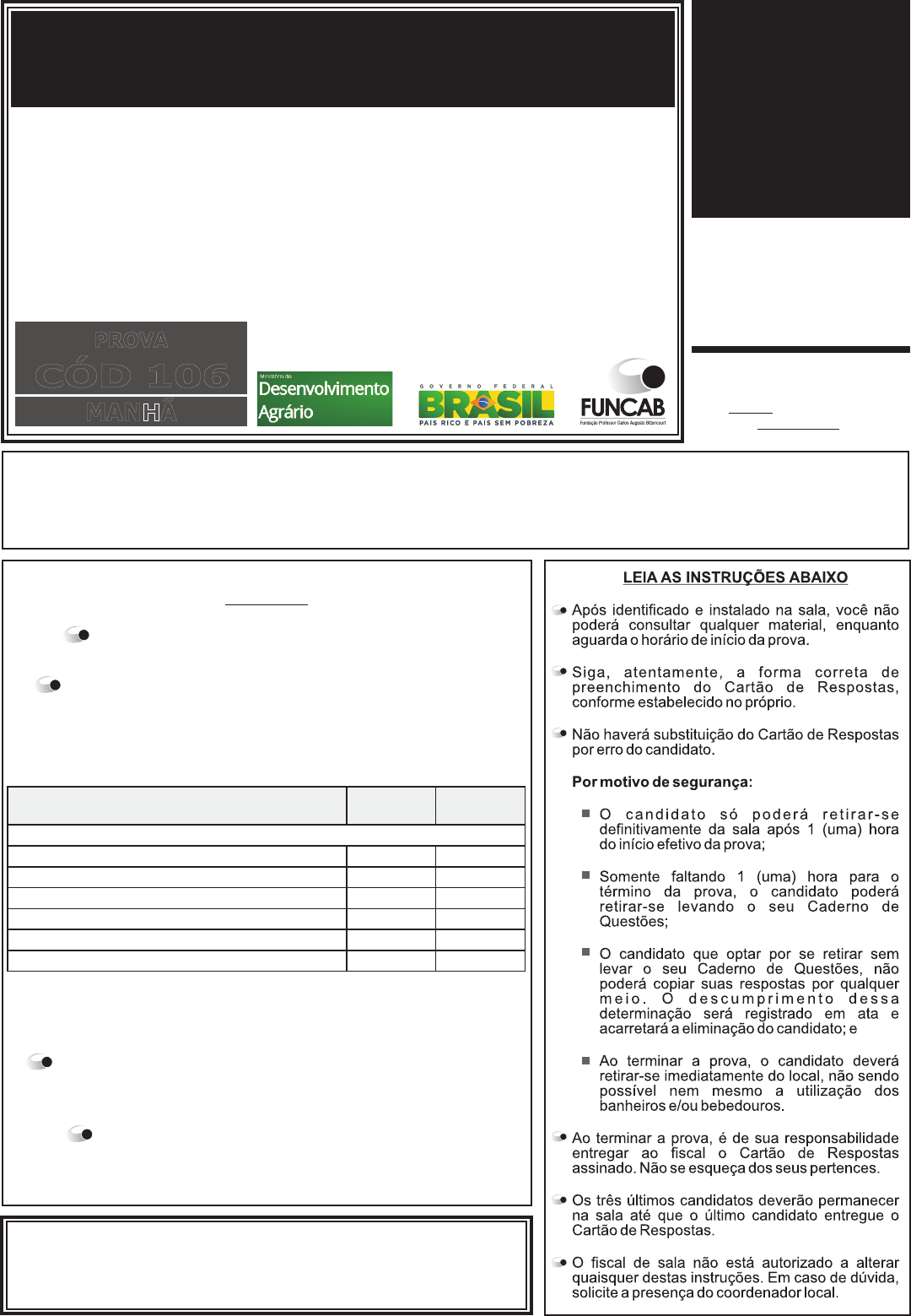 TRANSCREVA, EM ESPAÇO DETERMINADO NO SEU CARTÃO DE RESPOSTAS, A FRASE DO LÍDER INDIANO MAHATMA GANDHI PARA EXAME GRAFOTÉCNICO. “A força não provém da capacidade física, mas da vontade férrea.” BOA PROVA! www.funcab.org VERIFIQUE SE ESTE MATERIAL ESTÁ EM ORDEM, CASO CONTRÁRIO, NOTIFIQUE IMEDIATAMENTE O FISCAL. RESERVE OS 30 (TRINTA) MINUTOS FINAIS PARA MARCAR SEU CARTÃO DE RESPOSTAS. ATENÇÃO DURAÇÃO DA PROVA: 4 horas. ESTE CADERNO CONTÉM 50 (CINQUENTA) QUESTÕES DE MÚLTIPLA ESCOLHA, CADA UMA COM 5 ALTERNATIVAS DE RESPOSTA – A, B, C, D e E – CONFORME DISPOSIÇÃO ABAIXO. CONCURSO PÚBLICO para o cargo de DE ACORDO COM O EDITAL, O CANDIDATO QUE FIZER PROVA DE DIFERENTE SERÁ . LETRA ELIMINADO Verifique se esta LETRA é a mesma do seu Cartão de Respostas. MINISTÉRIO DO DESENVOLVIMENTO AGRÁRIO PROCESSO SELETIVO SIMPLIFICADO PARA CONTRATAÇÃO TEMPORÁRIA DE TÉCNICOS DE NÍVEIS INTERMEDIÁRIO E SUPERIOR T PROVA CÓD 106 MANHÃ Disciplinas Quantidade de questões Valor de cada questão Conhecimentos Gerais: Língua Portuguesa 7 1 Noções de Direito 5 1 Legislação 3 1 Atualidades 2 1 Noções de Informática 3 1 Conhecimentos Específicos 30 2 ATIVIDADES TÉCNICAS DE COMPLEXIDADE GERENCIAL (NÍVEL V) ATIVIDADE 8 www.pciconcursos.com.br 02 LÍNGUA PORTUGUESA FUNCAB - Fundação Professor Carlos Augusto Bittencourt Leia o texto abaixo e responda às questões propostas. A notícia da canonização do padre José de Anchieta, feita de maneira justa pelo Papa Francisco, é um reconhecimento histórico de um homem que deu a sua vida pelos valores e princípios do Evangelho, tão importantes no início do processo de miscigenação cultural de nossa nação. A sua visão missionária vai além de seu tempo, deixando um legado religioso e cultural para a História do Brasil, ainda hoje reconhecido por muitos intelectuais e historiadores de nosso país. É difícil, em poucas palavras, expressar a riqueza desse legado, sobretudo quando este se estende desde o campo da literatura, da poesia, da antropologia e dramaturgia, chegando até os primórdios da biogeografia brasileira. Sem nenhuma intenção de proselitismo, não podemos deixar de reconhecer a grande contribuição deste homem, considerado um ícone da evangelização nos primórdios das raízes de nossa brasilidade. Estar ligado à fundação das duas maiores cidades do país, São Paulo e Rio de Janeiro, não é algo trivial, pois isto supõe capacidade de dialogar, de aceitar diferenças, de ser inovador, de romper barreiras religiosas e culturais, de integrar culturas distintas e, extraordinariamente, de entregar sua vida por uma causa mais nobre, sem pretensões de poder, benefício próprio ou ambições econômicas. A maneira como Anchieta viveu e morreu aqui em nosso país é um testemunho inquestionável de alguém que procurou trabalhar e gastar a sua vida com gratuidade e simplicidade, sempre defendendo aqueles que sofriam os efeitos nefastos do processo colonizador, como os povos indígenas na sua época. Além deste árduo trabalho de inculturação da fé, a sua contribuição literária foi fundamental, lançando as bases da arte da poesia lírica e épica no Brasil, além dos sermões, cartas e uma gramática tupi-guarani, a língua mais falada naquela época na costa do país. Junto com outros que procuraram narrar em cartas os aspectos etnológicos, etológicos e históricos no início do processo de colonização, como Pero Vaz de Caminha, Pedro Lopes de Souza, Hans Staden, André Thévet, Jean de Léry, Pedro de Magalhães Gândavo, entre outros, a carta escrita por José de Anchieta em 1560, documento pouco conhecido pelos brasileiros, tem um papel relevante para os primórdios da chamada biogeografia brasileira. Neste relato pré-biogeográfico, aparece a riqueza e o uso da biodiversidade pelos povos nativos, revelando também aspectos etológicos de alguns animais. O que chama a atenção é a Anchieta muito além dos milagres preocupação de Anchieta em mostrar a visão integradora do homem com a fauna e com a flora, agregando informações sobre os fenômenos climáticos. A sua maneira holística de olhar a realidade antropológica, etnológica, teológica e ambiental integradamente é, sem dúvida, uma referência para o nosso mundo atual, carente de uma visão mais sistêmica da realidade socioambiental. Ao canonizar o padre Anchieta, o Papa Francisco foi além dos milagres baseados apenas nas curas e nas graças alcançadas, mostrando que é preciso ver também o legado e a contribuição cultural que uma pessoa deixa na história de um país, sendo sempre estímulo às futuras gerações. Que o exemplo do Santo José de Anchieta nos estimule a buscar sempre a abertura e o diálogo com as diferentes culturas e religiões que fazem parte de nossa brasilidade, exercendo a solidariedade entre os povos, e mostrando o quanto temos que conhecer e aprender com esta rica biodiversidade de nosso país, mesmo sabendo que a mesma se encontra cada vez mais vulnerável pela exploração e destruição de nossos ecossistemas. (SIQUEIRA, J. Carlos de. , 02/04/2014, p.17.)O Globo www.pciconcursos.com.br 03 FUNCAB - Fundação Professor Carlos Augusto Bittencourt Questão 01 Abaixo são feitas afirmativas a respeito do texto. I. A canonização do padre José de Anchieta representa um reconhecimento histórico de um homem cuja vida pautou-se pelos valores e princípios do Evangelho. II. A visão missionária de Anchieta ultrapassa o seu tempo e deixa um legado religioso e cultural que se prolonga pelo campo da literatura, da antropologia, da dramaturgia e das origens da biogeografia brasileira. III. A extraordinária capacidade demonstrada por Anchieta de entregar a própria vida a uma causa nobre, sem pretensões de poder, foi a razão principal que o levou a fundar as duas maiores cidades do país, São Paulo e Rio de Janeiro. IV. A contribuição de Anchieta foi fundamental para a literatura no Bra
