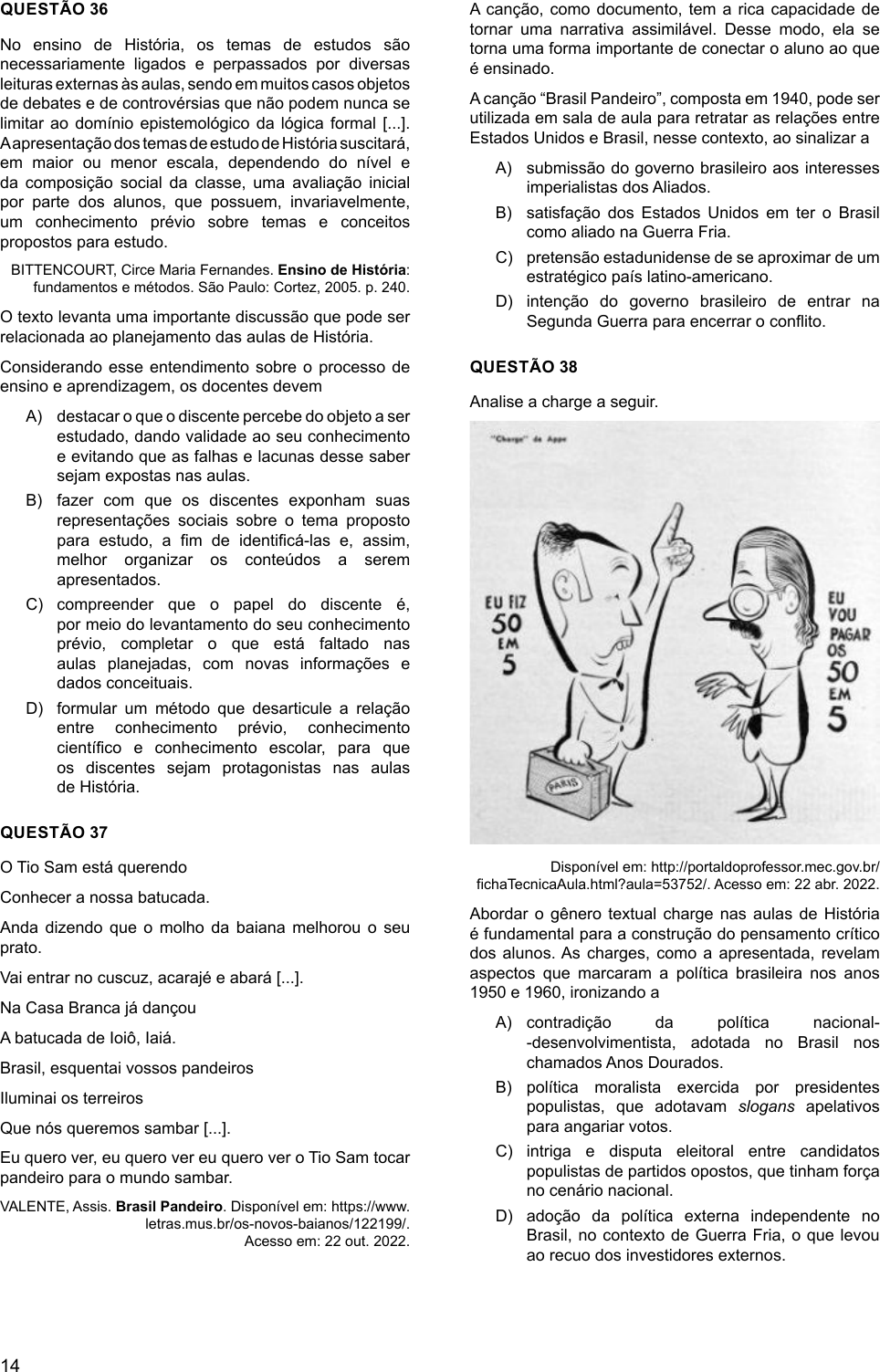 14 QUESTÃO 36 No ensino de História, os temas de estudos são necessariamente ligados e perpassados por diversas leituras externas às aulas, sendo em muitos casos objetos de debates e de controvérsias que não podem nunca se limitar ao domínio epistemológico da lógica formal [...]. A apresentação dos temas de estudo de História suscitará, em maior ou menor escala, dependendo do nível e da composição social da classe, uma avaliação inicial por parte dos alunos, que possuem, invariavelmente, um conhecimento prévio sobre temas e conceitos propostos para estudo. BITTENCOURT, Circe Maria Fernandes. Ensino de História: fundamentos e métodos. São Paulo: Cortez, 2005. p. 240. O texto levanta uma importante discussão que pode ser relacionada ao planejamento das aulas de História. Considerando esse entendimento sobre o processo de ensino e aprendizagem, os docentes devem A) destacar o que o discente percebe do objeto a ser estudado, dando validade ao seu conhecimento e evitando que as falhas e lacunas desse saber sejam expostas nas aulas. B) fazer com que os discentes exponham suas representações sociais sobre o tema proposto para estudo, a fim de identificá-las e, assim, melhor organizar os conteúdos a serem apresentados. C) compreender que o papel do discente é, por meio do levantamento do seu conhecimento prévio, completar o que está faltado nas aulas planejadas, com novas informações e dados conceituais. D) formular um método que desarticule a relação entre conhecimento prévio, conhecimento científico e conhecimento escolar, para que os discentes sejam protagonistas nas aulas de História. QUESTÃO 37 O Tio Sam está querendo Conhecer a nossa batucada. Anda dizendo que o molho da baiana melhorou o seu prato. Vai entrar no cuscuz, acarajé e abará [...]. Na Casa Branca já dançou A batucada de Ioiô, Iaiá. Brasil, esquentai vossos pandeiros Iluminai os terreiros Que nós queremos sambar [...]. Eu quero ver, eu quero ver eu quero ver o Tio Sam tocar pandeiro para o mundo sambar. VALENTE, Assis. Brasil Pandeiro. Disponível em: https://www. letras.mus.br/os-novos-baianos/122199/. Acesso em: 22 out. 2022. A canção, como documento, tem a rica capacidade de tornar uma narrativa assimilável. Desse modo, ela se torna uma forma importante de conectar o aluno ao que é ensinado. A canção “Brasil Pandeiro”, composta em 1940, pode ser utilizada em sala de aula para retratar as relações entre Estados Unidos e Brasil, nesse contexto, ao sinalizar a A) submissão do governo brasileiro aos interesses imperialistas dos Aliados. B) satisfação dos Estados Unidos em ter o Brasil como aliado na Guerra Fria. C) pretensão estadunidense de se aproximar de um estratégico país latino-americano. D) intenção do governo brasileiro de entrar na Segunda Guerra para encerrar o conflito. QUESTÃO 38 Analise a charge a seguir. Disponível em: http://portaldoprofessor.mec.gov.br/ fichaTecnicaAula.html?aula=53752/. Acesso em: 22 abr. 2022. Abordar o gênero textual charge nas aulas de História é fundamental para a construção do pensamento crítico dos alunos. As charges, como a apresentada, revelam aspectos que marcaram a política brasileira nos anos 1950 e 1960, ironizando a A) contradição da política nacional- -desenvolvimentista, adotada no Brasil nos chamados Anos Dourados. B) política moralista exercida por presidentes populistas, que adotavam slogans apelativos para angariar votos. C) intriga e disputa eleitoral entre candidatos populistas de partidos opostos, que tinham força no cenário nacional. D) adoção da política externa independente no Brasil, no contexto de Guerra Fria, o que levou ao recuo dos investidores externos.
