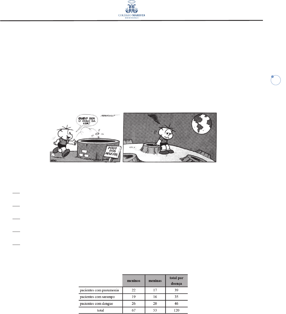 CADERNO DE ATIVIDADES 2º ANO – E.M. 2015 131 Escolhe-se aleatoriamente um item produzido por essa fábrica. A probabilidade de ser um item de tamanho e espessura padronizados é de: a) 95,4%. b) 95,6%. c) 95,8%. d) 96,0%. e) 96,2%. Gab: C 81 - (UNEB BA/2014) De acordo com o texto, se Cebolinha lançar a sua moeda dez vezes, a probabilidade de a face voltada para cima sair cara, em pelo menos oito dos lançamentos, é igual a: a) 128 5 b) 128 7 c) 256 15 d) 256 17 e) 512 25 Gab: 02 82 - (ESCS DF/2014) Um hospital pediátrico atendeu 120 crianças doentes, cada uma delas estava apenas com sarampo, pneumonia ou dengue. A tabela acima apresenta a distribuição do número de prontuários desse atendimento, por sexo e por doença. Nessa situação hipotética, se um prontuário de atendimento for selecionado ao acaso, as chances de esse prontuário ser de uma criança do sexo masculino ou de uma que tenha sido atendida por causa de sarampo serão: a) superiores a 55% e inferiores a 65%. b) superiores a 65%. c) inferiores a 45%. d) superiores a 45% e inferiores a 55%. Gab: D