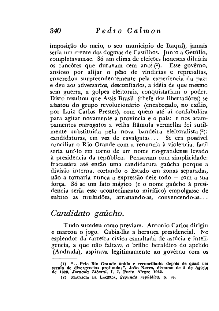 340 Pedro Calmon impos1çao do meio, o seu municipio de Itaquí), jamais seria um crente dos dogmas de Castilhos. Junto a Getúlio, completavam-se. Só um clima de eleições honestas diluiria os rancôres que duravam cem anos (1). Esse govêrno, ansioso por alijar o pêso de vindictas e represalías, enveredou surpreendentemente pela experiencia da paz: e deu aos adversarias, desconfiados, a idéia de que mesmo sem guerra, a golpes eleitorais, conquistariam o poder. Disto resultou que Assis Brasil (chefe dos libertadôres) se afastou do grupo revolucionário (encabeçado, no exílio, por Luiz Carlos Prestes), com quem até aí confabulára para agitar novamente a provincia e o país: e nos acam pamentos maragatos a velha flâmula vermelha foi sutil mente su bstituida pela nova bandeira eleitoralista (2): candidaturas, em vez de cavalgatas. . . Se era possível conciliar o Rio Grande com a renuncia à violencia, facil seria uní-lo em torno de um nome rio-grandense levado à presidencia da república. Pensavam com simplicidade: fracassára até então uma candidatura gaúcha porque a divisão interna, cortando o Estado em zonas separadas, não a tornaria nunca a expressão dele todo - com a sua força. Só se um fato mágico (e o nome gaúcho à presi dencia seria esse acontecimento mirífico) empolgasse de subito as multidões, arrastando-as, convencendo-as ... Candidato gaúcho. Tudo sucedeu como previam. Antonio Carlos dirigiu e marcou o jogo. Cabia-lhe a herança presidencial. No esplendor da carreira cívica esmaltada de astúcia e inteli gencia, a que não faltava o brilho heraldico do apelido (Andrada), aspirava legitimamente ao govêrno com os (l) " ... Pelo Rio Grande unido e reconciliado, depois de quasl um seculo de divergencias profundas", João Neves, discurso de 5 de ,\gQs\o de 1929, Jornada Liberal, l, 7, Porto Alegre 1932. (2) MAUlUCIO DB LACERDA, Segunda república, p. 98. d) A Revolução de Trinta difundiu o trabalhismo tanto pelas cidades quanto pelo campo, gerando emprego a muitas pessoas que, antes, dedicavam- -se ao banditismo social. O fim de grupos como o de Lampião era uma questão de tempo, mesmo que ele tenha sido morto pela polícia no fim da década de 1930. 93 - (UERN) “Ilmo sr. Francisco de Souza – Aspiro boa saúde com a exma. família, tendo eu frequentado uma fazenda sua, deliberei saudando-o em uma cartinha, pedir um cobrezinho. Basta dois contos de réis. Eu reconheço que o sr. não se sacrifica com isto e eu ficarei bem agradecido e não terei razão de lhe odiar nem também a gente de Virgulino terá esta razão. Sem mais, do seu criado, obrigado. Hortêncio, vulgo Arvoredo, rapaz do bando de Virgulino Ferreira, vulgo Lampião.” (Publicado no Jornal A Tarde, 20/01/1931, Coletânea de Documentos Históricos para o 1º grau, São Paulo; SE/CENP, 1980.p.51, in.: Rodrigues, 1999.) Apesar do palavreado gentil, o sentido real da carta está ligado ao próprio significado do Cangaço, movimento social do início da República Brasileira, ou seja, a) o sentido de um movimento de cunho social que visava apenas combater as oligarquias e as discrepâncias sociais. b) uma espécie de “banditismo social”, que agia basicamente por interesses próprios, com violência extrema e sem uma ideologia determinada. c) um movimento essencialmente comprometido com uma determinada classe social, a saber, a classe oligár- quica, que muitas vezes utilizou-se de seus serviços para garantir a ordem. d) de um movimento que demonstrou um viés socialista, já que os cangaceiros estabeleciam alianças com os tenentistas comandados por Luis Carlos Prestes, o “cavaleiro da esperança”. 94 - (UECE) Em 1904, a Revolta da Vacina, ocorrida na cidade do Rio de Janeiro, então capital federal, deu-se num momento decisivo de transformações da sociedade brasileira. Acerca desse movimento, analise as assertivas abaixo. I. Seu pretexto imediato foi a campanha de vacinação em massa contra a varíola, desencadeada por decisão da própria presidência da república, num momento em que uma onda de insatisfação popular varria o Rio de Janeiro. II. O governo esbravejava contra métodos de execução da aplicação da vacina que eram truculentos, os soros e os aplicadores pouco confiáveis, e os funcionários, enfermeiros e fiscais encarregados da campanha manifestavam atitudes pouco recomendáveis, mas a vacina era absolutamente necessária. III. O combate foi intenso. Aproveitando-se das reformas então em curso para a abertura de avenidas, os populares se armaram de pedras, paus, ferros, instrumentos e ferramentas contundentes, e os utilizaram como material bélico contra a polícia. Está correto o que se afirma somente em a) II. b) I e II. c) II e III. d) I e III. 95 - (Unievangélica GO) Observe a imagem. Disponível em: . Acesso em: 01 out. 2013. http://www.google.com.br/search?gs_rn=27&gs_ri=psyab Sobre a capoeira no Brasil, verifica-se que a) a população afrobrasileira praticava a dança da capoeira nos festejos religiosos organizados pela igreja católica. b) até o ano de 1930, a prática da capoeira não era bem vista no Brasil, pois o esporte era considerado violento e subversivo e a polícia tinha ordens de prender os capoeiristas. c) a capoeira chegou ao Brasil em 1937, quando o governo Getúlio Vargas a transformou em esporte nacional. d) os africanos que vieram para o Brasil trouxeram seus hábitos culturais, mas a violência e a repressão dos colonizadores brasileiros obrigaram os escravos a modificarem suas formas de defesa que uniam luta e dança. 96 - (ENEM) Charge capa da revista “O Malho”, de 1904. Disponível em: http://1.bp.blogspot.com. A imagem representa as manifestações nas ruas da cidade do Rio de Janeiro, na primeira década do século XX, que integraram a Revolta da Vacina. Considerando o contexto político-social da época, essa revolta revela a) a insatisfação da população com os benefícios de uma modernização urbana autorit