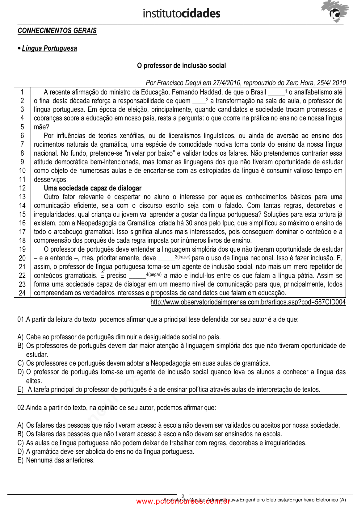 pcimarkpci MDAwMDowMDAwOjAwMDA6MDAwMDowMDAwOmZmZmY6OTU0ZTpiYjA0:U3VuLCAyNyBPY3QgMjAyNCAwMzoyNDo0OSAtMDMwMA== www.pciconcursos.com.br ________________________________________________________________________________________ Analista de Gestão Administrativa/Engenheiro Eletricista/Engenheiro Eletrônico (A) 2 CONHECIMENTOS GERAIS • Língua Portuguesa O professor de inclusão social Por Francisco Dequi em 27/4/2010, reproduzido do Zero Hora, 25/4/ 2010 1 2 3 4 5 6 7 8 9 10 11 12 13 14 15 16 17 18 19 20 21 22 23 24 A recente afirmação do ministro da Educação, Fernando Haddad, de que o Brasil _____1 o analfabetismo até o final desta década reforça a responsabilidade de quem ____2 a transformação na sala de aula, o professor de língua portuguesa. Em época de eleição, principalmente, quando candidatos e sociedade trocam promessas e cobranças sobre a educação em nosso país, resta a pergunta: o que ocorre na prática no ensino de nossa língua mãe? Por influências de teorias xenófilas, ou de liberalismos linguísticos, ou ainda de aversão ao ensino dos rudimentos naturais da gramática, uma espécie de comodidade nociva toma conta do ensino da nossa língua nacional. No fundo, pretende-se "nivelar por baixo" e validar todos os falares. Não pretendemos contrariar essa atitude democrática bem-intencionada, mas tornar as linguagens dos que não tiveram oportunidade de estudar como objeto de numerosas aulas e de encartar-se com as estropiadas da língua é consumir valioso tempo em desserviços. Uma sociedade capaz de dialogar Outro fator relevante é despertar no aluno o interesse por aqueles conhecimentos básicos para uma comunicação eficiente, seja com o discurso escrito seja com o falado. Com tantas regras, decorebas e irregularidades, qual criança ou jovem vai aprender a gostar da língua portuguesa? Soluções para esta tortura já existem, com a Neopedagogia da Gramática, criada há 30 anos pelo Ipuc, que simplificou ao máximo o ensino de todo o arcabouço gramatical. Isso significa alunos mais interessados, pois conseguem dominar o conteúdo e a compreensão dos porquês de cada regra imposta por inúmeros livros de ensino. O professor de português deve entender a linguagem simplória dos que não tiveram oportunidade de estudar – e a entende –, mas, prioritariamente, deve _____3(trazer) para o uso da língua nacional. Isso é fazer inclusão. E, assim, o professor de língua portuguesa torna-se um agente de inclusão social, não mais um mero repetidor de conteúdos gramaticais. É preciso _____4(pegar) a mão e incluí-los entre os que falam a língua pátria. Assim se forma uma sociedade capaz de dialogar em um mesmo nível de comunicação para que, principalmente, todos compreendam os verdadeiros interesses e propostas de candidatos que falam em educação. http://www.observatoriodaimprensa.com.br/artigos.asp?cod=587CID004 01. A partir da leitura do texto, podemos afirmar que a principal tese defendida por seu autor é a de que: A) Cabe ao professor de português diminuir a desigualdade social no país. B) Os professores de português devem dar maior atenção à linguagem simplória dos que não tiveram oportunidade de estudar. C) Os professores de português devem adotar a Neopedagogia em suas aulas de gramática. D) O professor de português torna-se um agente de inclusão social quando leva os alunos a conhecer a língua das elites. E) A tarefa principal do professor de português é a de ensinar política através aulas de interpretação de textos. 02. Ainda a partir do texto, na opinião de seu autor, podemos afirmar que: A) Os falares das pessoas que não tiveram acesso à escola não devem ser validados ou aceitos por nossa sociedade. B) Os falares das pessoas que não tiveram acesso à escola não devem ser ensinados na escola. C) As aulas de língua portuguesa não podem deixar de trabalhar com regras, decorebas e irregularidades. D) A gramática deve ser abolida do ensino da língua portuguesa. E) Nenhuma das anteriores. www.pciconcursos.com.br pcimarkpci MDAwMDowMDAwOjAwMDA6MDAwMDowMDAwOmZmZmY6OTU0ZTpiYjA0:U3VuLCAyNyBPY3QgMjAyNCAwMzoyNDo0OSAtMDMwMA== www.pciconcursos.com.br ________________________________________________________________________________________ Analista de Gestão Administrativa/Engenheiro Eletricista/Engenheiro Eletrônico (A) 3 03. A estruturação do 2º parágrafo do texto nos permite afirmar que este parágrafo se classifica como do tipo: A) Narrativo B) Injuntivo C) Argumentativo D) Descritivo E) Dialogal 04. Assinale na lista abaixo a única das palavras retiradas do texto que teve sua ortografia alterada pelo novo acordo ortográfico da Língua Portuguesa. A) Língua (l.7) B) Linguísticos (l.6) C) Linguagens (l.9) D) Conteúdo (l.17) E) Incluí-los (l.22) 05. Observe a separação silábica das palavras abaixo e assinale o item que identifica a afirmação correta em relação a ela: I. Trans-for-ma-ção II. In-flu-ên-ci-as III. Es-tro-pi-a-das IV. Sim-pló-ri-a A) Apenas os itens II e IV estão errados. B) Apenas os itens II e III estão corretos. C) Apenas o item II está errado. D) Apenas os itens I, II e III estão corretos. E) Apenas os itens III e IV estão corretos. 06. Assinale a alternativa que apresenta as palavras com as quais podemos preencher adequadamente os espaços vazios do trecho abaixo. O Ministro da Educação deseja que ____ escolas brasileiras cheguem rapidamente _____lugares mais afastados. Daqui _____ poucos anos, ele quer erradicar o analfabetismo de regiões onde, _____ bem pouco tempo, não havia uma escola sequer. A) as, aqueles, há, há. B) às aqueles, há, ah. C) as, àqueles, a, há. D) às, a aqueles, a, a. E) as, àqueles, a, a. 07. A partir da observação do período “Outro fator relevante é despertar no aluno o interesse por aqueles conhecimentos básicos para uma comunicação eficiente, seja com o discurso escrito seja com o falado.” (l.13-14) podemos afirmar que: A) 