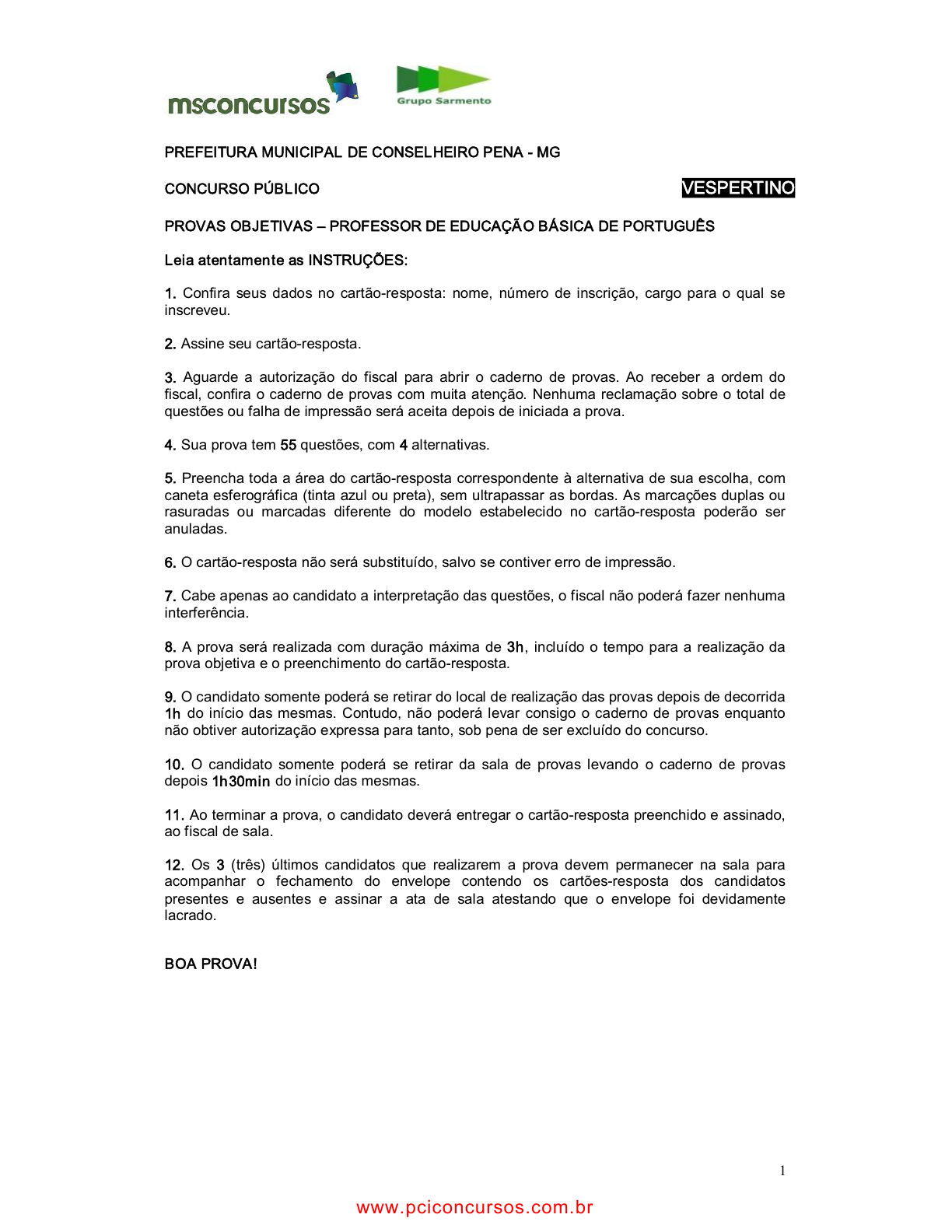 pcimarkpci MDAwMDowMDAwOjAwMDA6MDAwMDowMDAwOmZmZmY6MmRlOToyN2U1:U3VuLCAyNyBPY3QgMjAyNCAwNDoxODoxOCAtMDMwMA== www.pciconcursos.com.br 1 PREFEITURA MUNICIPAL DE CONSELHEIRO PENA MG CONCURSO PÚBLICO VESPERTINO PROVAS OBJETIVAS – PROFESSOR DE EDUCAÇÃO BÁSICA DE PORTUGUÊS Leia atentamente as INSTRUÇÕES: 1. Confira seus dados no cartãoresposta: nome, número de inscrição, cargo para o qual se inscreveu. 2. Assine seu cartãoresposta. 3. Aguarde a autorização do fiscal para abrir o caderno de provas. Ao receber a ordem do fiscal, confira o caderno de provas com muita atenção. Nenhuma reclamação sobre o total de questões ou falha de impressão será aceita depois de iniciada a prova. 4. Sua prova tem 55 questões, com 4 alternativas. 5. Preencha toda a área do cartãoresposta correspondente à alternativa de sua escolha, com caneta esferográfica (tinta azul ou preta), sem ultrapassar as bordas. As marcações duplas ou rasuradas ou marcadas diferente do modelo estabelecido no cartãoresposta poderão ser anuladas. 6. O cartãoresposta não será substituído, salvo se contiver erro de impressão. 7. Cabe apenas ao candidato a interpretação das questões, o fiscal não poderá fazer nenhuma interferência. 8. A prova será realizada com duração máxima de 3h, incluído o tempo para a realização da prova objetiva e o preenchimento do cartãoresposta. 9. O candidato somente poderá se retirar do local de realização das provas depois de decorrida 1h do início das mesmas. Contudo, não poderá levar consigo o caderno de provas enquanto não obtiver autorização expressa para tanto, sob pena de ser excluído do concurso. 10. O candidato somente poderá se retirar da sala de provas levando o caderno de provas depois 1h30min do início das mesmas. 11. Ao terminar a prova, o candidato deverá entregar o cartãoresposta preenchido e assinado, ao fiscal de sala. 12. Os 3 (três) últimos candidatos que realizarem a prova devem permanecer na sala para acompanhar o fechamento do envelope contendo os cartõesresposta dos candidatos presentes e ausentes e assinar a ata de sala atestando que o envelope foi devidamente lacrado. BOA PROVA! www.pciconcursos.com.br pcimarkpci MDAwMDowMDAwOjAwMDA6MDAwMDowMDAwOmZmZmY6MmRlOToyN2U1:U3VuLCAyNyBPY3QgMjAyNCAwNDoxODoxOCAtMDMwMA== www.pciconcursos.com.br 2 PROVAS OBJETIVAS – PROFESSOR DE EDUCAÇÃO BÁSICA DE PORTUGUÊS PORTUGUÊS Leia o trecho de "Rebolation" (Eliane Cantanhêde), para responder às questões: Um país que se diz sério tem de se confirmar sério. Como? Uma das formas mais elementares é... cumprindo as leis. Não é o que acontece no Brasil, principalmente em ano eleitoral, como agora. No país real, José Serra, Dilma Rousseff e Marina Silva são candidatos para valer e estão em campanha ostensiva e já quase frenética. No país legal e imaginário, eles são apenas "précandidatos" e, até as convenções de junho, não podem usar palanques, fazer discursos nem agir como candidatos. Em sendo candidatos, deveriam fingir que não são. Mas nem se dão a esse trabalho. (...) Os candidatos não respeitam as leis, e as leis são feitas para não serem respeitadas, porque não há lastro de realismo em forçar candidatos a não serem candidatos. E, enquanto a lei não é mudada, se é que será, jogase tudo para o alto e seguese em frente. Poderseia dizer ao menos que os candidatos têm de rebolar para driblar a lei eleitoral, mas seria a mais descarada mentira. Na verdade, estão todos no maior "rebolation". Inclusive a Justiça. (Folha de São Paulo) 01. A fim de comprovar a tese de que o Brasil não é um país sério, Cantanhêde apresenta o seguinte argumento: a) As leis são feitas para não serem respeitadas. b) Os candidatos à presidência do país vêm fazendo campanha eleitoral antes do período permitido. c) O país não cumpre as leis. d) Os candidatos driblam as leis eleitorais. 02. A palavra rebolation, usada entre aspas para indicar que se trata de um(a) _____________, foi utilizada no último parágrafo como sinônima de _____________. A alternativa que preenche adequada e respectivamente as lacunas do enunciado dado é: a) Neologismo – bagunça generalizada, desordem. b) Estrangeirismo – uma música que fez sucesso no carnaval brasileiro. c) Ironia – balbúrdia. d) Novo termo incluído na língua – algazarra. 03. Releia: “ Em sendo candidatos, deveriam fingir que não são. Mas nem se dão a esse trabalho.” A frase destacada poderia ser substituída por uma construção mais formal, sem prejuízo de sentido por: a) No entanto, nem se importam com isso. b) Entretanto, nem ligam para esse fato. c) Contudo, nem dão bola a esse acontecimento. d) Desta maneira, nem despendem tempo com o caso. Leia o texto abaixo para responder às questões: Lição da greve da USP (Gilberto Dimenstein) A sociedade fica horrorizada diante das cenas de selvageria patrocinadas pela greve dos funcionários da USP – cenas que ganharam um símbolo devastador com a proibição pelos grevistas de uma criança de quatro anos usar o banheiro da creche, bloqueada pelos piqueteiros. Ameaçase agora a invasão do centro de computação da universidade. A principal lição disso tudo vai muito além da USP. O que está em discussão é a crescente força dos servidores públicos, com seus sindicatos, colocando interesses corporativos acima dos interesses do coletivo. Basta lembrar que neste ano o sindicato dos professores reivindicou aumento do absenteísmo, fim da promoção por mérito e das provas de conhecimento dos professores temporários. Todos os dias, vemos como, em diferentes partes, são propostos novos benefícios a funcionários públicos, a começar de aposentadorias, inchando a folha de pagamentos sem vermos retorno em eficiência. Neste período eleitoral, se forem atender as reivindicações que estão no Congresso, vamos ter de trabalhar apenas para bancar os salários públicos. Aliás, já trabalhamos mais 