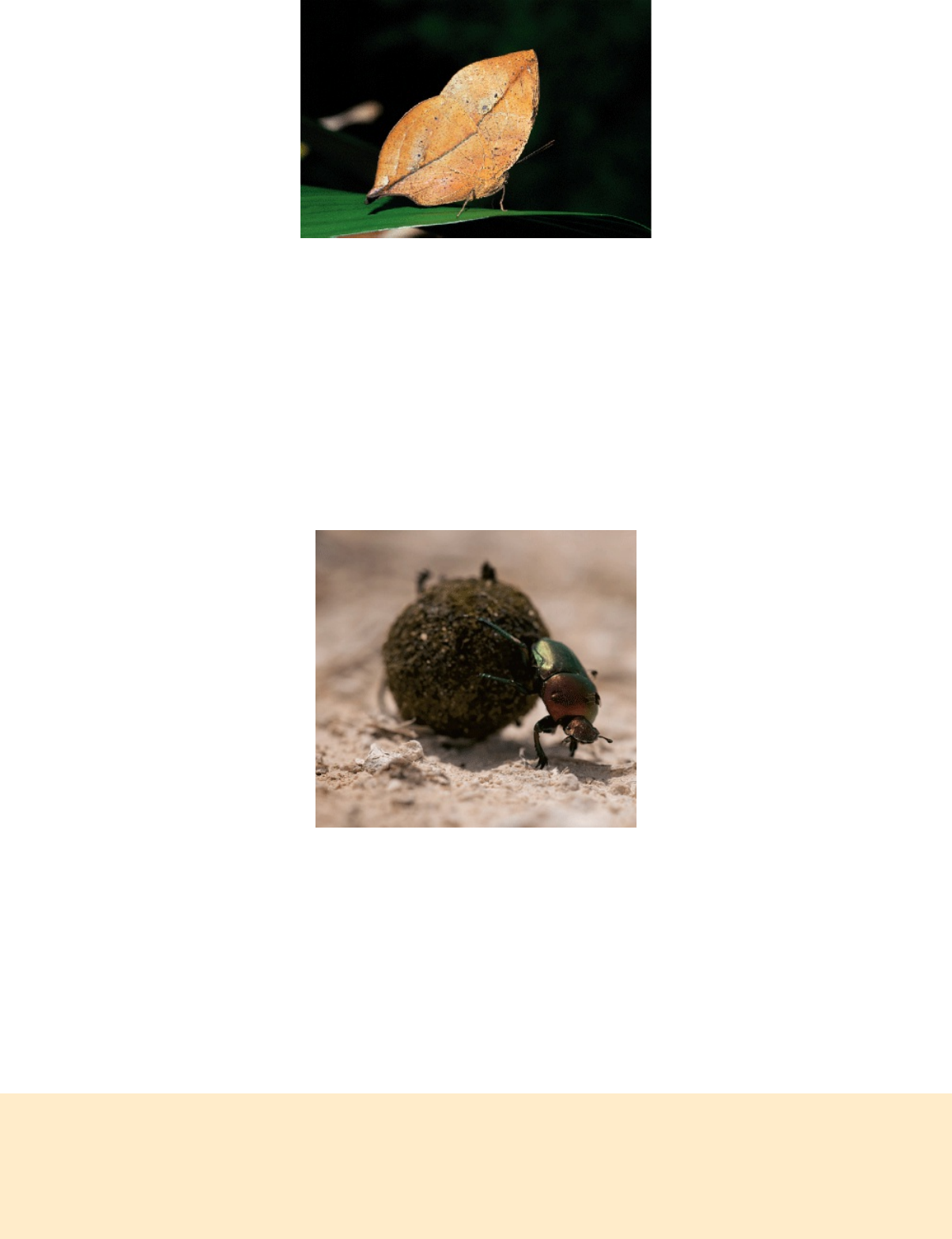Figura 21.28 Camuflagem dos insetos. A borboleta Kallima paralekta parece uma folha morta. Ela é nativa da Indonésia e da Malásia. No entanto, uma grande parte do comportamento dos insetos não é simplesmente uma questão de orientação, mas envolve uma série complexa de respostas. Um par de besouros rola-bosta arranca um pedaço de material fecal, rola-o até formar uma bola, e rola essa bola trabalhosamente até o local onde pretende enterrá-la, para depois depositar seus ovos dentro dela (Figura 21.29). As cigarras cortam a casca de um galho e, então, colocam um ovo em cada um dos cortes feitos. As fêmeas das vespas do gênero Eumenes coletam pelotas de argila, carregando-as uma a uma até o local da construção, e constroem, com estilo, pequenos e graciosos potes de argila de gargalo estreito, dentro dos quais colocam um ovo em cada um. A seguir, a mãe-vespa caça e paralisa um bom número de lagartas, empurra-as para dentro da abertura dos potes, e fecha as aberturas com argila. Cada ovo, protegido individualmente por seu próprio pote, emerge e acaba encontrando um suprimento de comida bem provido. Figura 21.29 Esse besouro rola-bosta africano, Kheper aegyptiorum purpurascens, é generalista para selecionar o tipo de fezes, mas aqui está rolando uma bola de fezes de elefante. Tipicamente, é formada uma bola com as fezes, que é rolada pelos machos, pelas fêmeas ou por ambos os indivíduos juntos. Os ovos são depositados na bola, e os jovens besouros desenvolvem-se aí dentro, algumas vezes sob o cuidado da mãe. Grande parte desse comportamento é inata; entretanto, está envolvida uma parte muito maior de aprendizado do que se pensava anteriormente. Essa vespa, por exemplo, precisa aprender onde ela construiu seus potes uma vez que precisa voltar para preenchê-los com lagartas, um de cada vez. Os insetos sociais, que foram estudados extensamente, são capazes de executar a maioria das formas básicas de aprendizado utilizadas pelos mamíferos. Uma exceção é o aprendizado por intuição. Aparentemente, quando estão em face de um novo problema, os insetos não conseguem reorganizar suas memórias visando construir uma nova resposta. Alguns insetos podem memorizar e efetuar em sequência tarefas que envolvem sinais múltiplos em várias áreas sensoriais. Abelhas operárias foram treinadas para caminhar através de labirintos que envolviam cinco viradas em sequência, usando como pistas a cor de um marcador, a distância entre dois locais determinados ou o ângulo de uma virada. O mesmo ocorre com formigas. Operárias de uma espécie de Formica aprenderam um labirinto de seis pontos em uma velocidade apenas 2 ou 3 vezes mais lenta do que a de ratos de laboratório. As trilhas de forrageamento de formigas e abelhas frequentemente contêm muitas voltas e curvas, mas, uma vez que a forrageira encontrou alimento, a viagem de volta é relativamente direta. Um pesquisador sugere que a série contínua de cálculos necessários para determinar tais ângulos, direções, distâncias e velocidade da viagem e convertê-los em um retorno direto poderia envolver o uso de cronômetro, bússola e cálculo integral vetorial. Ainda não se sabe como os insetos fazem isso. Os insetos comunicam-se entre si por meio de sinais químicos, visuais, auditivos e táteis. Sinais químicos tomam a forma de feromônios, que são substâncias secretadas por um indivíduo que afetam o comportamento ou os processos fisiológicos de outro indivíduo. Muitos feromônios foram descritos. Como os hormônios, os feromônios são eficientes em quantidades ínfimas. Os feromônios são usados em diversas situações. Eles podem atrair o sexo oposto, sinalizar um alarme ou iniciar comportamentos, como passar pelo inverno, entre as joaninhas, ou se agregarem com besouros-de-pinheiro. Também podem ser usados para marcar caminhos, definir territórios ou estimular respostas de defesa. Os parasitos sociais evitam a detecção – e certa destruição – ao imitar ou duplicar os feromônios produzidos pelos membros de sua colônia hospedeira. Os feromônios determinam a casta em cupins e, até certo ponto, em formigas e abelhas. Eles são uma das principais forças integradoras das populações de insetos sociais. Muitos feromônios de insetos foram isolados e identificados. As armadilhas que utilizam iscas de feromônio têm sido usadas por vários anos no monitoramento de insetos de importância econômica. Elas podem ser usadas para detectar a presença de um inseto, como um novo invasor que veio de uma área vizinha (mapeando o espalhamento da mariposa europeia Porthetria dispar nos EUA, ou a presença das lagartas da borboleta europeia Heliothis zea em uma plantação), ou para monitorar as mudanças nos níveis da população. O uso de armadilhas de feromônio tornou-se uma ferramenta importante para detectar infestações potenciais, dando tempo suficiente para que possam ser planejadas medidas para remediar a situação. A produção e a recepção de sons (fonoprodução e fonorrecepção) dos insetos têm sido estudadas extensamente, e, embora o sentido da audição não esteja presente em todos os insetos, esse meio de comunicação é muito significativo entre os insetos que o utilizam. Os sons servem como mecanismos de aviso, informação sobre a propriedade de territórios, ou cantos de acasalamento. Os sons de gafanhotos e grilos parecem estar envolvidos com a corte ou com agressão. Os grilos-machos esfregam as bordas modificadas de suas asas anteriores entre si para produzir seu som característico. O canto bem alongado dos machos de cigarras, que é um chamado para atrair fêmeas, é produzido por membranas vibráteis localizadas em um par de órgãos situados no lado ventral do segmento abdominal basal. Existem muitas formas de comunicação tátil, como tapas, batidas, agarramentos, e o tocar entre antenas, que provocam respostas que vão desde o reconhecimento até o recrutamento e o