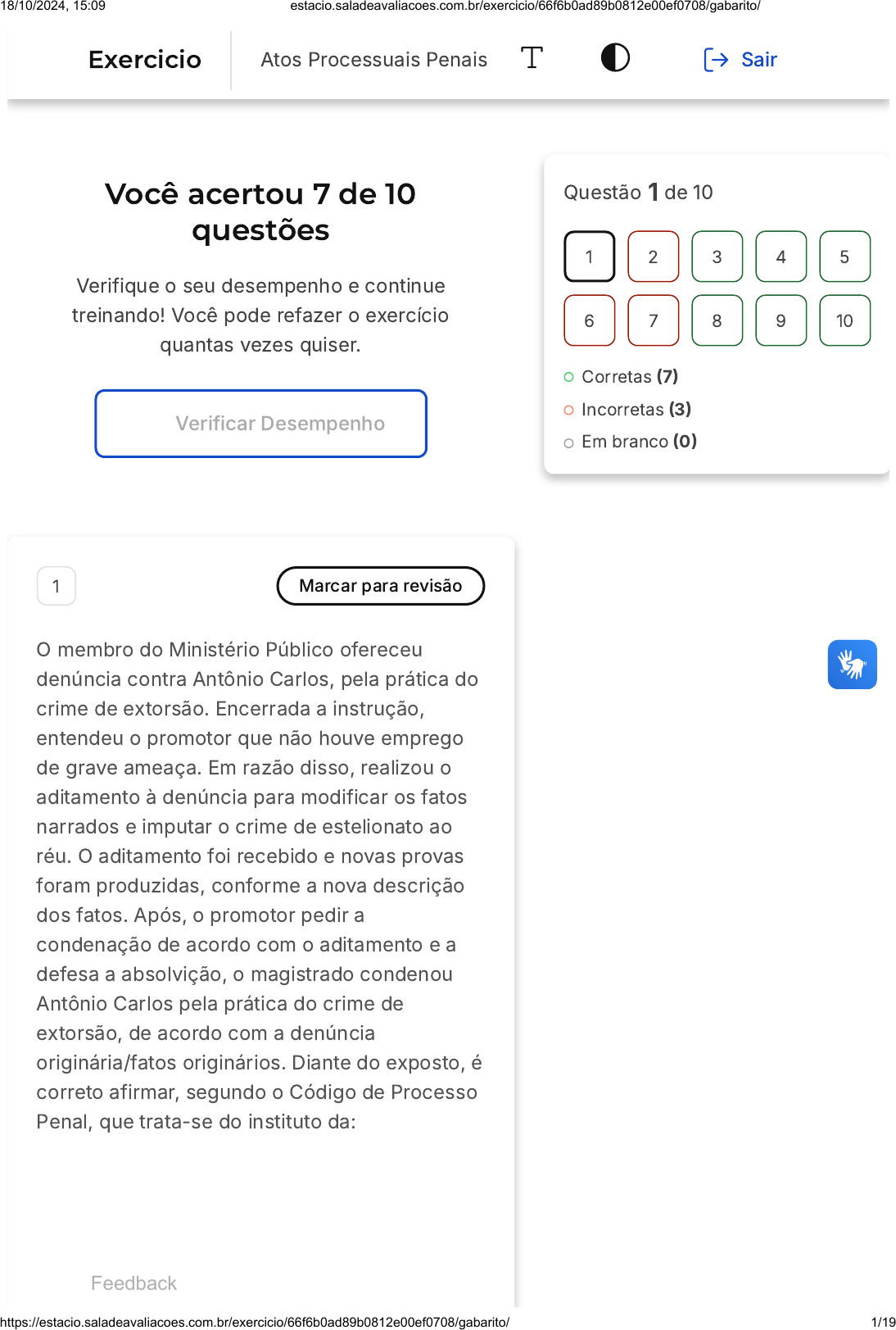 Você acertou 7 de 10 questões Verifique o seu desempenho e continue treinando! Você pode refazer o exercício quantas vezes quiser. Verificar Desempenho 1 Marcar para revisão O membro do Ministério Público ofereceu denúncia contra Antônio Carlos, pela prática do crime de extorsão. Encerrada a instrução, entendeu o promotor que não houve emprego de grave ameaça. Em razão disso, realizou o aditamento à denúncia para modificar os fatos narrados e imputar o crime de estelionato ao réu. O aditamento foi recebido e novas provas foram produzidas, conforme a nova descrição dos fatos. Após, o promotor pedir a condenação de acordo com o aditamento e a defesa a absolvição, o magistrado condenou Antônio Carlos pela prática do crime de extorsão, de acordo com a denúncia originária/fatos originários. Diante do exposto, é correto afirmar, segundo o Código de Processo Penal, que trata-se do instituto da: Questão 1 de 10 Corretas �7� Incorretas �3� Em branco �0� 1 2 3 4 5 6 7 8 9 10 Feedback Exercicio Atos Processuais Penais Sair 18/10/2024, 15:09 estacio.saladeavaliacoes.com.br/exercicio/66f6b0ad89b0812e00ef0708/gabarito/ https://estacio.saladeavaliacoes.com.br/exercicio/66f6b0ad89b0812e00ef0708/gabarito/ 1/19 A B C D E Mutatio libelli, não podendo o magistrado condenar Antônio Carlos pelo crime de extorsão, uma vez que são garantias do réu: ter a certeza de que não poderá ser condenado sem que tenha tido oportunidade de defender-se da imputação e que será julgado apenas nos limites do pedido do autor da ação penal. Mutatio libelli, podendo o magistrado condenar Antônio Carlos pelo que quiser. Mutatio libelli, podendo o magistrado condenar Antônio Carlos pelo crime de extorsão qualificada. Emendatio libelli, não podendo o magistrado condenar Antônio Carlos pelo crime de extorsão, por ser mais grave. Emendatio libelli, podendo o magistrado, conforme o art. 383 do CPP, condenar Antônio Carlos pelo crime de extorsão, em razão da máxima: "dá-me os fatos que te darei o direito". Resposta correta Parabéns, você selecionou a alternativa correta. Confira o gabarito comentado! Gabarito Comentado 18/10/2024, 15:09 estacio.saladeavaliacoes.com.br/exercicio/66f6b0ad89b0812e00ef0708/gabarito/ https://estacio.saladeavaliacoes.com.br/exercicio/66f6b0ad89b0812e00ef0708/gabarito/ 2/19 Na situação apresentada, ocorreu o instituto da Mutatio libelli, que é realizada pelo Ministério Público e está prevista no art. 384 do Código de Processo Penal �CPP�. Este artigo estabelece que, após o encerramento da instrução probatória, se o Ministério Público entender cabível uma nova definição jurídica do fato, em consequência de prova existente nos autos de elemento ou circunstância da infração penal não contida na acusação, deverá aditar a denúncia ou queixa. Nesse caso, o juiz ficará adstrito aos termos do aditamento, conforme o parágrafo 4º do mesmo artigo. Portanto, o magistrado não poderia condenar Antônio Carlos pelo crime de extorsão, uma vez que são garantias do réu: ter a certeza de que não poderá ser condenado sem que tenha tido oportunidade de defender-se da imputação e que será julgado apenas nos limites do pedido do autor da ação penal. 2 Marcar para revisão �CONSUPLAN/2018 � Adaptada) Os institutos da "mutatio libelli" e da ¿emendatio libelli¿ devem ser sempre orientados pelo princípio da correlação no estudo das sentenças. Sobre o tema, analise as afirmativas a seguir. I. Segundo o Código de Processo Penal, a "emendatio libelli" exige que seja assegurada ao acusado vista sobre a possível modificação da classificação jurídica do fato, para incidência de crime mais gravemente apenado. II. "Y" foi denunciado por tentativa de furto simples. Encerrada a instrução, a prova coligida aponta para a prática de furto qualificado 18/10/2024, 15:09 estacio.saladeavaliacoes.com.br/exercicio/66f6b0ad89b0812e00ef0708/gabarito/ https://estacio.saladeavaliacoes.com.br/exercicio/66f6b0ad89b0812e00ef0708/gabarito/ 3/19 A B C D E consumado, a exigir a providência do art. 384 do CPP �¿mutatio libelli¿�. O Promotor de Justiça oficiante recusou-se a aditar a denúncia e, remetidos os autos ao Procurador Geral de Justiça, este avalizou a recusa. Neste caso, nada restará ao magistrado fazer, a não ser proferir sentença pelo crime constante da inicial. III. No caso de "mutatio libelli", não procedendo o órgão do Ministério Público ao aditamento, o assistente de acusação poderá fazê-lo, no prazo de 5 (cinco) dias, ficando o Juiz, na sentença, adstrito aos termos do aditamento. IV. É admissível a "mutatio libelli" em segundo grau de jurisdição. Assinale a alternativa correta. Apenas a afirmativa III está correta. Apenas a afirmativa II está correta. Apenas as afirmativas I, II e III estão corretas. Apenas as afirmativas I e II estão corretas. Apenas a afirmativa IV está correta. Resposta incorreta Opa! A alternativa correta é a letra B. Confira o gabarito comentado! 18/10/2024, 15:09 estacio.saladeavaliacoes.com.br/exercicio/66f6b0ad89b0812e00ef0708/gabarito/ https://estacio.saladeavaliacoes.com.br/exercicio/66f6b0ad89b0812e00ef0708/gabarito/ 4/19 Gabarito Comentado Somente a alternativa II está correta. A última palavra fica no próprio âmbito do Ministério Público, aplicando-se por analogia o artigo 28 do CPP, que trata do arquivamento do inquérito policial. Art. 383� O juiz, sem modificar a descrição do fato contida na denúncia ou queixa, poderá atribuir-lhe definição jurídica diversa, ainda que, em consequência, tenha de aplicar pena mais grave. Não há qualquer cerceamento de defesa pois o réu, no processo penal, se defende dos fatos narrados na peça acusatória e não da classificação jurídico penal. A "mutatio libelli" só é realizada pelo MP, não alcançando o assistente de acusação, e só pode ser realizada em primeira instância sob pena de sup