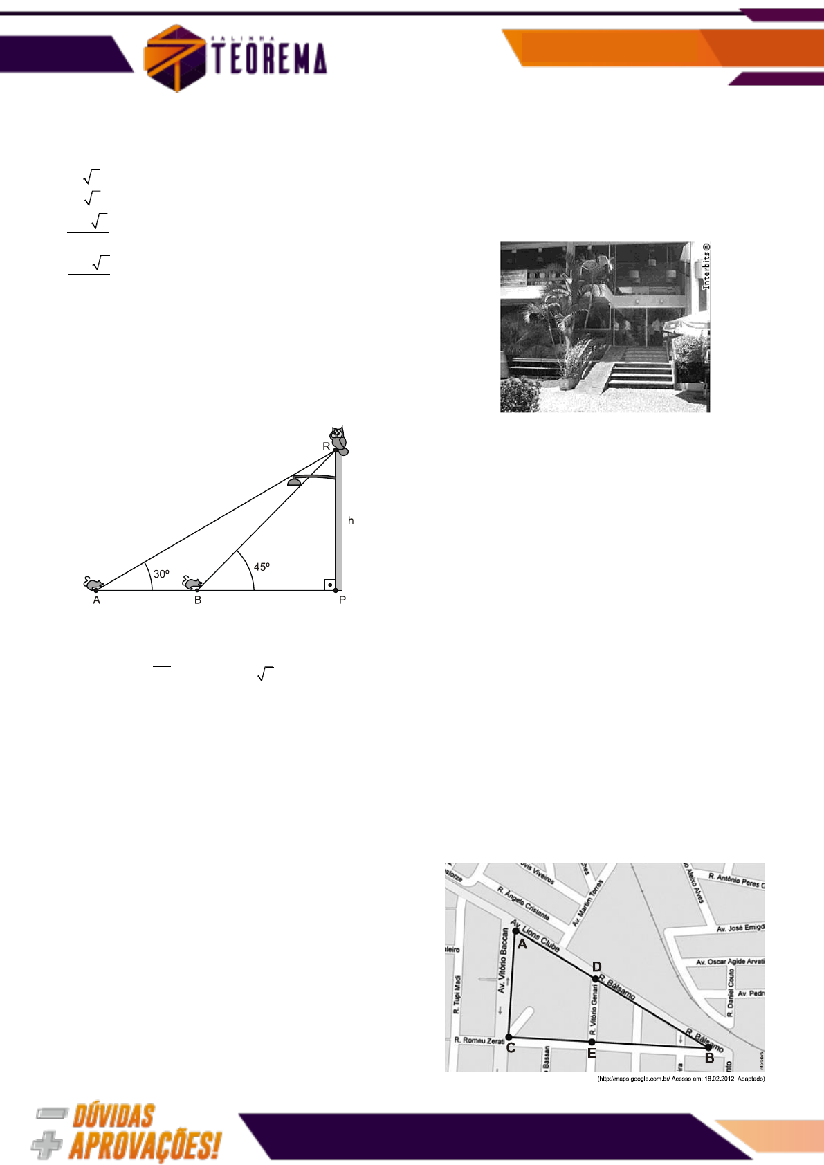 TRIGONOMETRIA Se a altura do teodolito é de 1,5 metros, é correto afirmar que a altura do morro com relação à região plana à qual pertencem A e B é, em metros: a) 80 3 1,5+ b) 80 3 1,5− c) 160 3 1,5 3 + d) 160 3 1,5 3 − e) 160 30. Uma coruja está pousada em R, ponto mais alto de um poste, a uma altura h do ponto P, no chão. Ela é vista por um rato no ponto A, no solo, sob um ângulo de 30°, conforme mostra figura abaixo. O rato se desloca em linha reta até o ponto B, de onde vê a coruja, agora sob um ângulo de 45° com o chão e a uma distância BR de medida 6 2 metros. Com base nessas informações, estando os pontos A, B e P alinhados e desprezando-se a espessura do poste, pode-se afirmar então que a medida do deslocamento AB do rato, em metros, é um número entre a) 3 e 4 b) 4 e 5 c) 5 e 6 d) 6 e 7 e) 9 e 10 31. Numa escola, o acesso entre dois pisos desnivelados é feito por uma escada que tem quatro degraus, cada um medindo 24 cm de comprimento por 12 cm de altura. Para atender à política de acessibilidade do Governo Federal, foi construída uma rampa, ao lado da escada, com mesma inclinação, conforme mostra a foto a seguir. Com o objetivo de verificar se a inclinação está de acordo com as normas recomendadas, um fiscal da Prefeitura fez a medição do ângulo que a rampa faz com o solo. O valor encontrado pelo fiscal a) estava entre 30 e 45 . b) era menor que 30 . c) foi exatamente 45 . d) era maior que 45 . e) era maior que 60° 32. As ruas e avenidas de uma cidade são um bom exemplo de aplicação de Geometria. Um desses exemplos encontra-se na cidade de Mirassol, onde se localiza a Etec Prof. Mateus Leite de Abreu. A imagem apresenta algumas ruas e avenidas de Mirassol, onde percebemos que a Av. Vitório Baccan, a Rua Romeu Zerati e a Av. Lions Clube/Rua Bálsamo formam uma figura geométrica que se aproxima muito de um triângulo retângulo, como representado no mapa.