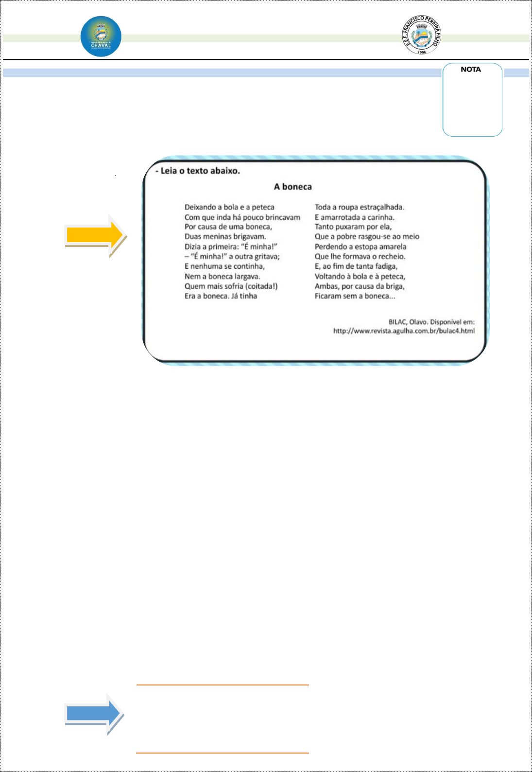 GOVERNO MUNICIPAL PREFEITURA MUNICIPAL DE CHAVAL SECRETARIA MUNICIPAL DE EDUCAÇÃO ESCOLA DE ENSINO FUNDAMENTAL FRANCISCO PEREIRA FILHO Rua Joaquim Amâncio Teles, 397 – Caçamba – Chaval/CE - CEP: 62420-000 E-mail: eeffranciscopereirafilho2017@gmail.com ESCOLA DE ENSINO FUNDAMENTAL FRANCISCO PEREIRA FILHO ALUNO (A):_________________________________________________________________________ SERIE/ANO: 5º ANO TURMA: _______ TURNO:____________ PROFESSOR (A): ANA DURVAL. AVALIAÇÃO DE PORTUGUÊS – 3º PERÍODO Leia o texto abaixo, para responder as questões 01, 02, 03, 04 e 05. Questão 01. As meninas brigavam por que (A) A mãe das meninas tomou a boneca delas. (B) As duas queriam a mesma boneca. (C) Elas foram brincar com a bola e a peteca. (D) Elas resolveram parar de brincar. Questão 02. A consequência da briga das meninas foi (A) Brincar com a bola. (B) Ficarem de castigo. (C) Guardar a boneca. (D) Perder a boneca. Questão 03. Observe a palavra destacada em cada verso e escreva a quem ela se refere: (A) ”É minha” a outra gritava: _____________________________________________ (B) E nenhuma se continha. _____________________________________________ (C) Quem mais sofria (coitada) _____________________________________________ (D) Tanto puxaram por ela. _____________________________________________ Questão 04. Releia os versos e responda: Quem mais sofria (coitada) Era a boneca. Já tinha toda a roupa estraçalhada, E amarrotada a carinha. A) Por que, segundo os versos, quem mais sofria era a boneca? ________________________________________________________________________________ ________________________________________________________________________________ B) Que ações das meninas deixaram a boneca nesse estado? ________________________________________________________________________________ ________________________________________________________________________________ Questão 05. Com esta poesia aprendemos que (A) Tudo se resolve na base de grosseria. (B) Devemos querer tudo só pra dente. (C) Nunca devemos ser egoístas. (D) Se o brinquedo é meu eu não posso emprestá-lo. Leia o texto para responder a questão 06. Questão 06. Entende-se desse texto que (A) A corneta faz mais barulho que os apitos. (B) A corneta prefere ficar sozinha. (C) Os apitos foram expulsos da copa. (D) Os apitos gostam de fazer silêncio. Leia o texto abaixo, para responder a questão 07. Um homem cor de limão Eu vi um foguete especial e pensei que era cometa e coisa e tal. Depois vi um disco parado no ar e achei que era um balão cansado de voar. Foi aí que eu vi um homem com de limão e cismei que era o herói da televisão. Só quando eu ouvi sua voz de marciano foi que desconfiei: ---eu estou sonhando!... Questão 07. De acordo com esse texto, o que o homem achou que era um balão? (A) O disco. (B) O foguete. (C) O herói. (D) O marciano. Leia o texto abaixo, para responder as questões 08, 09 e 10. Questão 08. De acordo com esse texto, o que Pâmela fez na casa de Dona Clarice? (A) Preparou o suco. (B) Decorou bolinhos. (C) Conversou sobre muitas coisas. (D) Brincou com a amiga Bárbara. Questão 09. Nesse texto, no trecho “...ela e a mãe estavam terminando de decorar.”, a palavra “decorar” significa (A) Comprar. (B) Enfeitar. (C) Ensaiar. (D) Memorizar. Questão 10. Nesse texto, ao levar os bolinhos para Dona Clarice, Pâmela (A) Demonstra preocupação com vizinha. (B) Desejava conhecer a casa da vizinha. (C) Pretende ensinar uma nova receita. (D) Queria deixar sua mãe orgulhosa. Leia o texto abaixo, para responder as questões 11 e 12. Você sabia que... ...uma piscina de vidro foi construída entre dois prédios em Londres (Inglaterra)? Ela fica suspensa a uma altura que equivale ao 10º andar! E tem 25 metros de comprimento, 5 metros de largura e 3 metros de profundidade. Irado! Questão 11. Nesse texto, no trecho “Ela fica suspensa...”, a palavra destacada significa. (A) Cancelada. (B) Fechada. (C) Pendurada. (D) Proibida. Questão 12. Nesse texto, a palavra “Irado” é comum da linguagem (A) Científica. (B) Coloquial. (C) Padrão. (D) Regional. Leia o texto abaixo, para responder as questões 13 e 14. Você sabia que as baratas tem perfume? Está duvidando? Pois é verdade. Elas, que quando aparecem costumam causar rebuliço[...], têm perfume irresistível para... Outras baratas, claro! Os machos da espécie Leocuphaeamaderae, por exemplo, usam seu perfume para atrair [...] as fêmeas. O cheirinho especial sai de suas costas, debaixo das asas. Aí, é amor á primeira cafungada![...] Questão 13. Nesse texto, os pontos de interrogação foram utilizados para (A) Despertar a curiosidade do leitor. (B) Indicar deboche. (C) Marcar uma preocupação do autor. (D) Mostrar insegurança. Questão 14. Nesse texto, o termo “Leocuphaeamaderae” é característico da linguagem. (A) Científica. (B) Formal. (C) Jurídica. (D) Literária. Leia o texto abaixo, para responder as questões 15, 16 e 17. Não precisa ter pena... Oscar, uma fêmea papagaio (sim, apesar do nome masculino, ela é do outro sexo) é um exemplo de superação no mundo animal. A ave perdeu as penas por conta de uma doença, e os veterinários deram a ela uma expectativa de apenas 6meses de vida. Entretanto, já se passaram 13 anos! A papagaia, de 35 anos, foi levada a um santuário animal [...]. Desde então está sob os cuidados da tratadora Cheriewacchter. “Ela já é parte da família. Adoro quando ela senta em meu braço”, afirma. Questão 15. No trecho “...deram a ela uma expectativa de apenas 6 meses...”, a palavra destacada está no lugar de (A) Doença. (B) Papagaia. (C) Tratadora. (D) Família. Questão 16. Nesse texto, o trecho que dá ideia de tempo é (A)”...Já se passaram 13 anos!”. (B)”...foi levada a um santuário...” (C)”...sob os cuidados da tratadora...”. (D)”...ela senta em meu braço,...”. Questão 17. Nesse texto, o trecho que apresenta uma opiniã