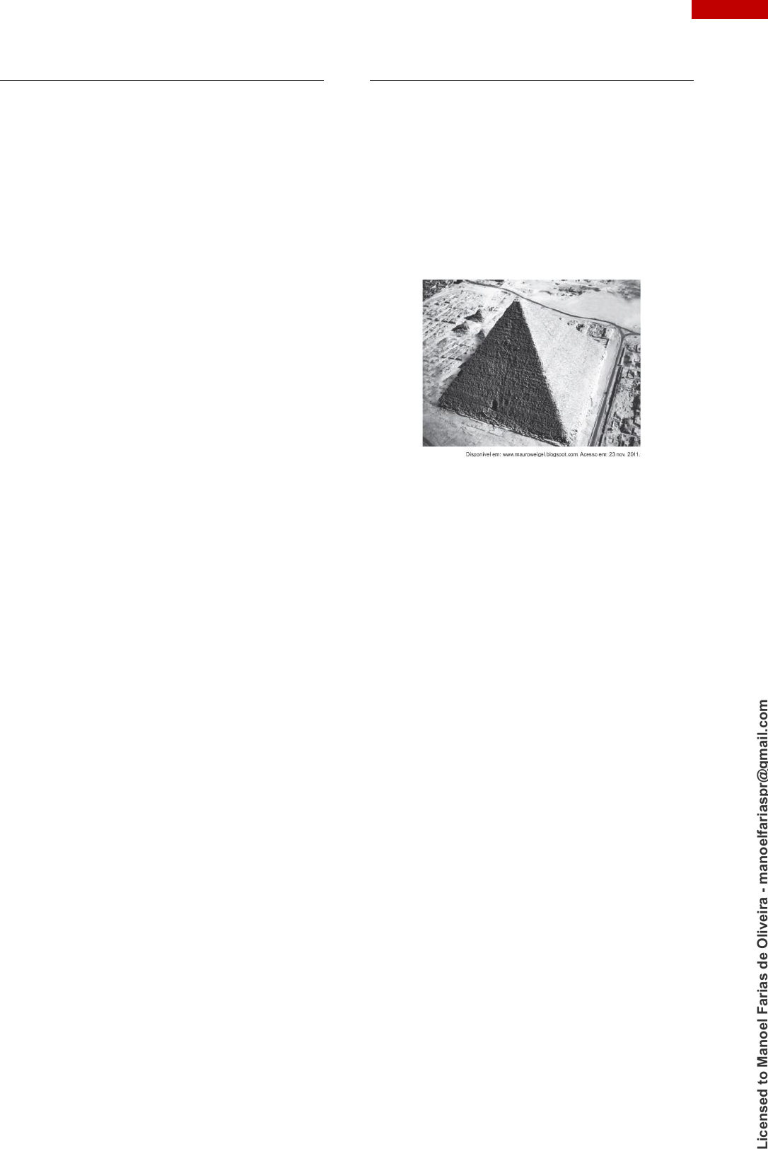 170 GEOMETRIA ESPACIAL 1 – PRISMAS E PIRÂMIDES QUESTÃO 27 (ENEM 2021) O projeto de um contêiner, em forma de paralelepípedo reto retangular, previa a pintura dos dois lados (interno e externo) de cada uma das quatro paredes com tinta acrílica e a pintura do piso interno com tinta epóxi. O construtor havia pedido, a cinco fornecedores diferentes, orçamentos das tintas necessárias, mas, antes de iniciar a obra, resolveu mudar o projeto original, alterando o comprimento e a largura para o dobro do originalmente previsto, mantendo inalterada a altura. Ao pedir novos orçamentos aos fornecedores, para as novas dimensões, cada um deu uma resposta diferente sobre as novas quantidades de tinta necessárias. Em relação ao previsto para o projeto original, as novas quantidades de tinta necessárias informadas pelos fornecedores foram as seguintes: – Fornecedor I: “O dobro, tanto para as paredes quanto para o piso”. – Fornecedor II: “O dobro para as paredes e quatro vezes para o piso”. – Fornecedor III: “Quatro vezes, tanto para as paredes quanto para o piso.” – Fornecedor IV: “Quatro vezes para as paredes e o dobro para o piso.” – Fornecedor V: “Oito vezes para as paredes e quatro vezes para o piso.” Analisando as informações dos fornecedores, o construtor providenciará a quantidade adequada de material. Considere a porta de acesso do contêiner como parte de uma das paredes. Qual dos fornecedores prestou as informações adequadas, devendo ser o escolhido pelo construtor para aquisição do material? A) I B) II C) III D) IV E) V QUESTÃO 28 (ENEM 2016 PPL) A figura mostra a pirâmide de Quéops, também conhecida como a Grande Pirâmide. Esse é o monumento mais pesado que já foi construído pelo homem da Antiguidade. Possui aproximadamente 2,3 milhões de blocos de rocha, cada um pesando em média 2,5 toneladas. Considere que a pirâmide de Quéops seja regular, sua base seja um quadrado com lados medindo 214 m, as faces laterais sejam triângulos isósceles congruentes e suas arestas laterais meçam 204 m. O valor mais aproximado para a altura da pirâmide de Quéops, em metro, é A) 97,0. B) 136,8. C) 173,7. D) 189,3. E) 240,0. L ic en se d t o M an o el F ar ia s d e O liv ei ra - m an o el fa ri as p r@ g m ai l.c o m