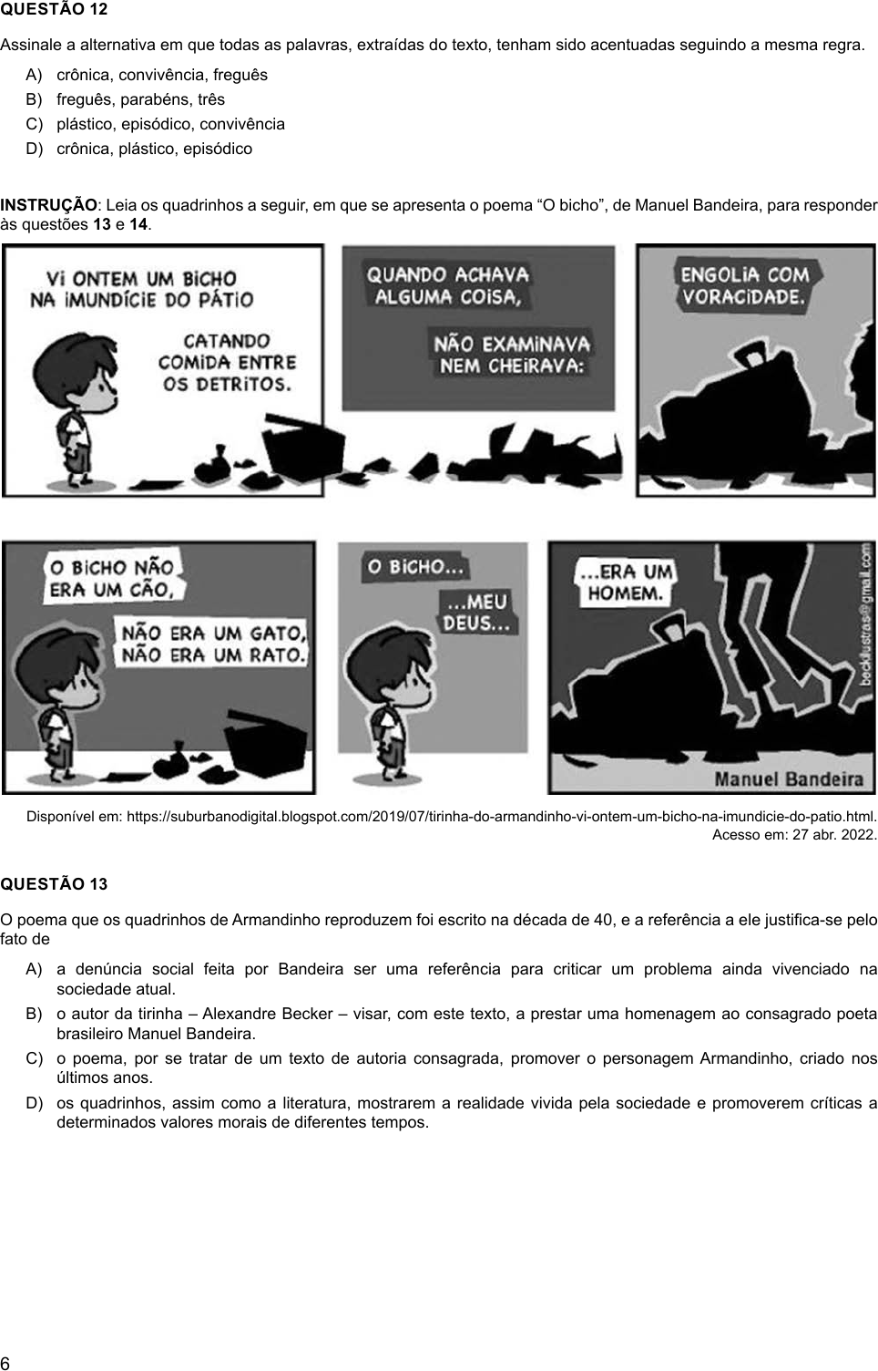 6 QUESTÃO 12 Assinale a alternativa em que todas as palavras, extraídas do texto, tenham sido acentuadas seguindo a mesma regra. A) crônica, convivência, freguês B) freguês, parabéns, três C) plástico, episódico, convivência D) crônica, plástico, episódico INSTRUÇÃO: Leia os quadrinhos a seguir, em que se apresenta o poema “O bicho”, de Manuel Bandeira, para responder às questões 13 e 14. Disponível em: https://suburbanodigital.blogspot.com/2019/07/tirinha-do-armandinho-vi-ontem-um-bicho-na-imundicie-do-patio.html. Acesso em: 27 abr. 2022. QUESTÃO 13 O poema que os quadrinhos de Armandinho reproduzem foi escrito na década de 40, e a referência a ele justifica-se pelo fato de A) a denúncia social feita por Bandeira ser uma referência para criticar um problema ainda vivenciado na sociedade atual. B) o autor da tirinha – Alexandre Becker – visar, com este texto, a prestar uma homenagem ao consagrado poeta brasileiro Manuel Bandeira. C) o poema, por se tratar de um texto de autoria consagrada, promover o personagem Armandinho, criado nos últimos anos. D) os quadrinhos, assim como a literatura, mostrarem a realidade vivida pela sociedade e promoverem críticas a determinados valores morais de diferentes tempos.