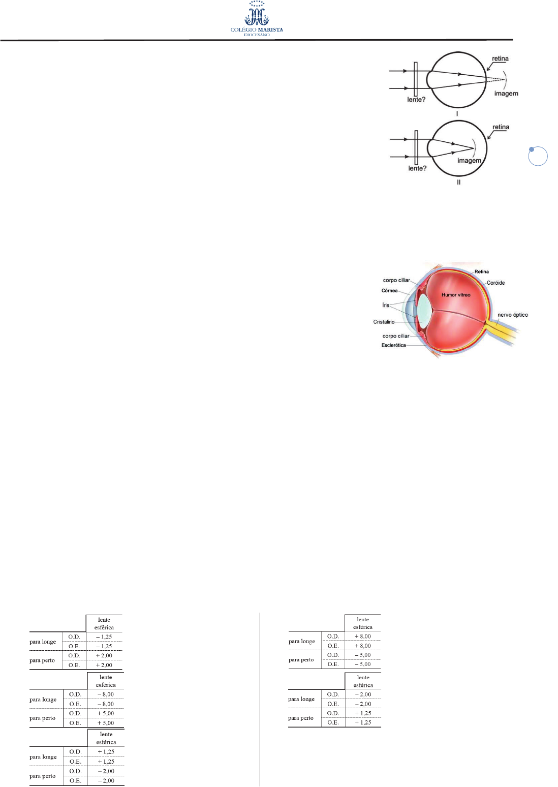 CADERNO DE ATIVIDADES 2º ANO – E.M. 2015 187 35 - (ACAFE SC) A figura ao lado mostra esquematicamente o olho humano, enfatizando nos casos I e II os dois defeitos de visão mais comuns. Nessa situação, assinale a alternativa correta que completa, em sequência, as lacunas da frase a seguir. No caso I trata-se da ___________, que pode ser corrigida com uma lente __________ ; já no caso II trata-se de ____________, que pode ser corrigida com uma lente ___________. a) hipermetropia - convergente - miopia - divergente b) hipermetropia - divergente - miopia - convergente c) miopia - divergente - hipermetropia - convergente d) miopia - convergente - hipermetropia - divergente 36 - (PUC SP) O globo ocular humano, com cerca de 25 milímetros de diâmetro, é o responsável pela captação da luz refletida pelos objetos à nossa volta. O olho humano é um órgão da visão, no qual uma imagem óptica do mundo externo é produzida, transformada em impulsos nervosos e conduzida ao cérebro pelo nervo óptico. O olho humano basicamente se restringe a duas lentes convergentes de alto poder refrativo: a córnea, com aproximadamente 2,3cm de distância focal, e o cristalino, com aproximadamente 7,1cm de distância focal. Considerando esses valores como médios, uma vez que podem variar de pessoa para pessoa, podemos calcular que a córnea e o cristalino, respectivamente, possuem aproximadamente a) +0,43 dioptrias e +0,14 dioptrias. b) +4,3 dioptrias e 1,4 dioptrias. c) +43 dioptrias e +14 dioptrias. d) –4,3 dioptrias e –1,4 dioptrias. e) –43 dioptrias e –14 dioptrias. 37 - (Fac. Santa Marcelina SP) O Sr. João C. Gueira sempre teve miopia. Agora, com idade avançada, começou a apresentar também presbiopia. Em sua última consulta com o oftalmologista, o Sr. C. Gueira verificou que só conseguia enxergar com nitidez de 50 cm a 80 cm de seus olhos. Para corrigir suas ametropias, o oftalmologista prescreveu uma receita de óculos para serem confeccionados a partir de lentes esféricas com distâncias focais adequadas ao seu problema. Considerando que a distância mínima que um olho emetrope pode enxergar com nitidez é de 25 cm, das prescrições abaixo, que trazem valores de vergência, a mais adequada ao Sr. C. Gueira é a) b) c) d) e)
