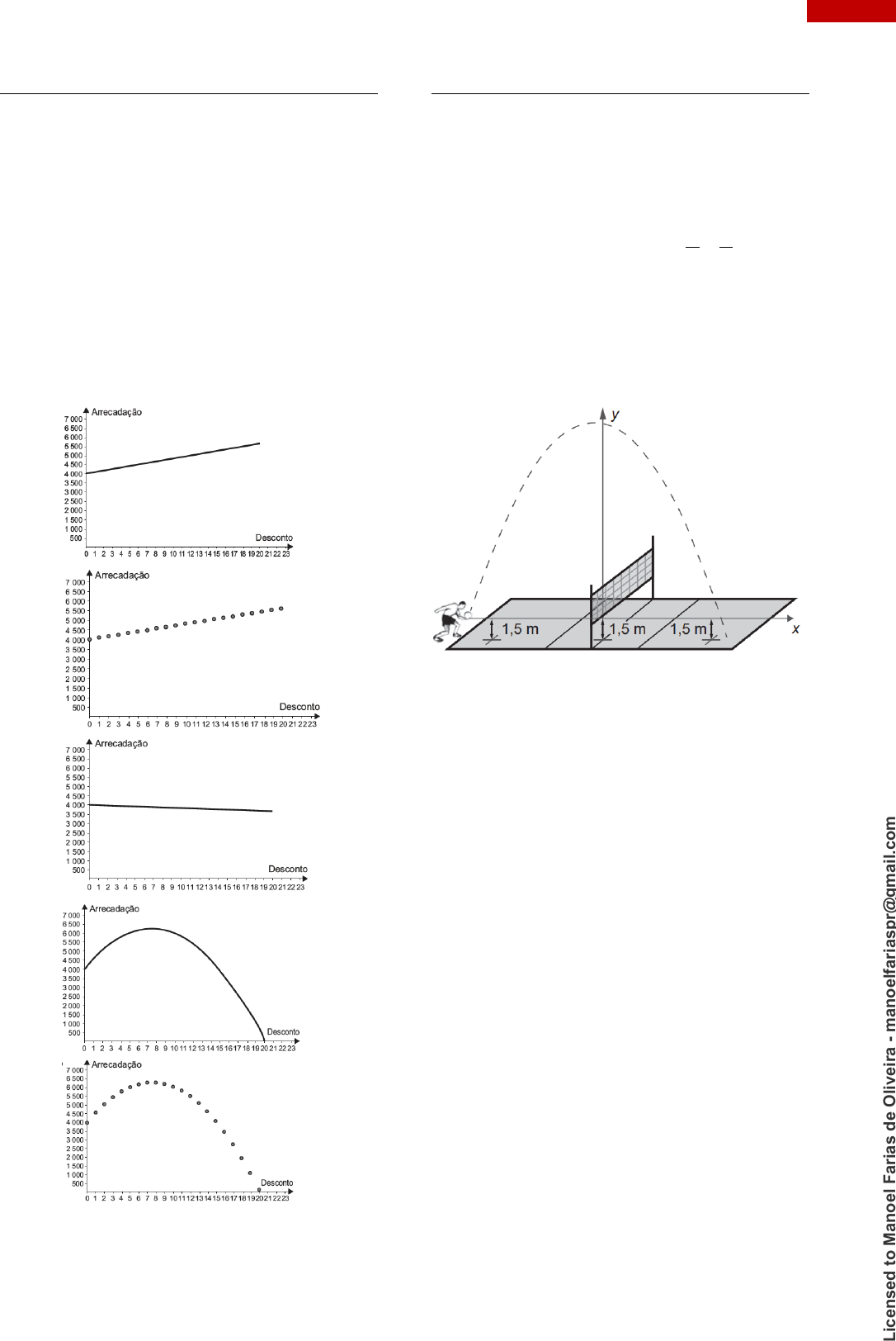 130 FUNÇÃO DE 2º GRAU QUESTÃO 14 (ENEM 2021) O administrador de um teatro percebeu que, com o ingresso do evento a R$20,00, um show conseguia atrair 200 pessoas e que, a cada R$1,00 de redução no preço do ingresso, o número de pessoas aumentava em 40. Ele sabe que os donos do teatro só admitem trabalhar com valores inteiros para os ingressos, pela dificuldade de disponibilizar troco, e pretende convencê-los a diminuir o preço do ingresso. Assim, apresentará um gráfico da arrecadação em função do valor do desconto no preço atual do ingresso. O gráfico que mais se assemelha ao que deve ser elaborado pelo administrador é A) B) C) D) E) QUESTÃO 15 (ENEM 2022) Em jogos de voleibol, um saque é invalidado se a bola atingir o teto do ginásio onde ocorre o jogo. Um jogador de uma equipe tem um saque que atinge uma grande altura. Seu recorde foi quando a batida do saque se iniciou a uma altura de 1,5 m do piso da quadra, e a trajetória da bola foi descrita pela parábola 𝑦 = − 𝑥2 6 − 7𝑥 3 + 12, em que y representa a altura da bola em relação ao eixo x (das abscissas) que está localizado a 1,5 m do piso da quadra, como representado na figura. Suponha que em todas as partidas algum saque desse jogador atinja a mesma altura do seu recorde. A equipe desse jogador participou de um torneio de voleibol no qual jogou cinco partidas, cada uma delas em um ginásio diferente. As alturas dos tetos desses ginásios, em relação aos pisos das quadras, são: ginásio I: 17 m; ginásio II: 18 m; ginásio III: 19 m; ginásio IV: 21 m; ginásio V: 40 m. O saque desse atleta foi invalidado A) apenas no ginásio I. B) apenas nos ginásios I e II. C) apenas nos ginásios I, II e III. D) apenas nos ginásios I, II, III e IV. E) em todos os ginásios. L ic en se d t o M an o el F ar ia s d e O liv ei ra - m an o el fa ri as p r@ g m ai l.c o m