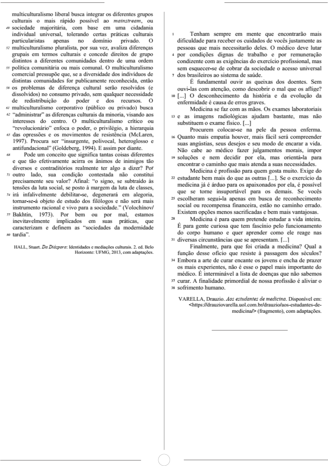 CADERNO DE QUESTÕES 7 Considerando os aspectos linguísticos e estilísticos do texto, julgue o item a seguir. Como estratégia argumentativa, Stuart Hall questiona, ao final, a relevância da própria discussão apresentada no texto, desenvolvida a partir do conceito do adjetivo “multicultural” (linha 2), costumeiramente empregado no plural, e do subs- tantivo “multiculturalismo” (linha 2), singular por natureza, ao apresentar-lhes como diferentes e, ao mesmo tempo, in- terdependentes. ( ) Certo ( ) Errado 21-IADES - 2018 - SES-DF - Médico - Cardiologista No período “Quanto mais empatia houver, mais fácil será compreender suas angústias, seus desejos e seu modo de encarar a vida.” (linhas 16 e 17), a oração sublinhada é su- bordinada A) dverbial temporal. B) adjetiva explicativa. C) adverbial conformativa. D) substantiva completiva nominal. E) adverbial proporcional.