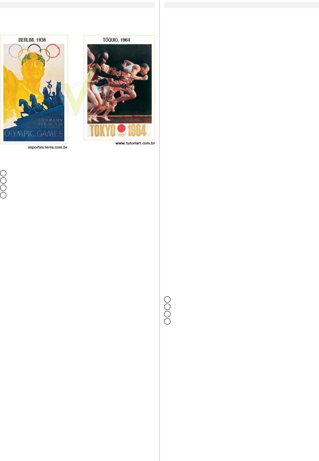 (UERJ) d a b c (UERJ) d a b c Questão 13 Os jogos olímpicos mundiais, desde sua criação em finais do século XIX, revelam particularidades tanto nacionais quanto internacionais relacionadas aos locais onde ocorrem. Observe os cartazes de divulgação abaixo. A partir da análise desses cartazes, pode-se concluir que as olimpíadas de Berlim, em 1936, e de Tóquio, em 1964, enfatizaram, respectivamente, as seguintes ideias: defesa do militarismo – hierarquização dos povos culto do arianismo – valorização das diferenças raciais hegemonia da cultura ocidental – unificação dos países exaltação do patriotismo – evidência da igualdade social Questão 14 Era um garoto que como eu amava os Beatles e os Rolling Stones (1967) Era um garoto Que como eu Amava os Beatles E os Rolling Stones Girava o mundo Sempre a cantar As coisas lindas Da América Cantava viva à liberdade Mas uma carta sem esperar Da sua guitarra o separou Fora chamado na América Stop! Com Rolling Stones Stop! Com Beatles songs Mandado foi ao Vietnã Lutar com vietcongs Eu te amo, meu Brasil (1970) As praias do Brasil ensolaradas O chão onde o país se elevou A mão de Deus abençoou Mulher que nasce aqui tem muito mais amor O céu do meu Brasil tem mais estrelas O sol do meu país mais esplendor A mão de Deus abençoou Em terras brasileiras vou plantar amor Eu te amo, meu Brasil, eu te amo Meu coração é verde, amarelo, branco, azul anil Eu te amo, meu Brasil, eu te amo Ninguém segura a juventude do Brasil A banda brasileira Os Incríveis marcou época ao cantar acontecimentos e ideias que afetavam especialmente a vida dos mais jovens no final da década de 1960, como ilustram as letras citadas. Essas letras estão relacionadas, respectivamente, aos seguintes contextos internacional e brasileiro daquele momento: declínio do liberalismo − patriotismo militarista apogeu do imperialismo − naturalismo romântico bipolaridade da Guerra Fria − nacionalismo ufanista política da coexistência pacífica − conservadorismo ambiental