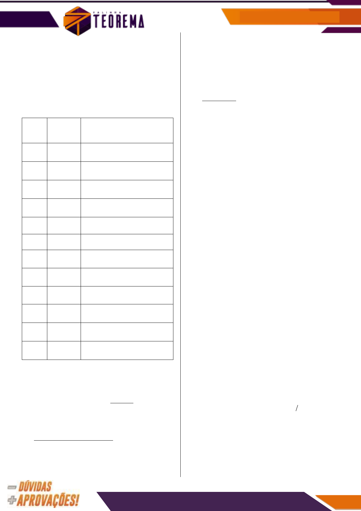 ÁLGEBRA BÁSICA 21. A tabela seguinte permite exprimir os valores de certas grandezas em relação a um valor determinado da mesma grandeza tomado como referência. Os múltiplos e submúltiplos decimais das unidades do Sistema Internacional de Unidades (SI) podem ser obtidos direta ou indiretamente dos valores apresentados e têm seus nomes formados pelo emprego dos prefixos indicados. NOME SÌMBOLO FATOR PELO QUAL A UNIDADE É MULTIPLICADA tera T 1210 1000 000 000 000= giga G 910 1000 000 000= mega M 610 1000 000= quilo K 310 1000= hecto h 210 100= deca da 10 10= deci d 110 0,1− = centi c 210 0,01− = mili m 310 0,001− = micro μ 610 0,000 001− = nano n 910 0,000 000 001− = pico p 1210 0,000 000 000 001− = Por exemplo, se a unidade de referência fosse o ampère (A), teríamos: 3 6 6 152 10 152 000 A 152 000 10 A A 0,152 A 10 μ − = = = Se o grama (g) for a unidade de referência e 9(12 500 10 Gg) (0,0006 ng) X , 0,000 012 Tg = então o valor de X, em gramas, é tal que: a) X 500 b) 500 X 1000 c) 1000 X 1500 d) X 1500 e) x = 2200 22. Sejam x 1,333...,= y 0,25,= z 0,1,= t 0,1= − e 1 2 1 3 (x y )z h . t − −− = O valor de h é a) 411 5 .− b) 53 2 .− c) 22 3 . d) 312 3 . e) 16 . 2³ 23. Computadores utilizam, por padrão, dados em formato binário, em que cada dígito, denominado de bit, pode assumir dois valores (0 ou 1). Para representação de caracteres e outras informações, é necessário fazer uso de uma sequência de bits, o byte. No passado, um byte era composto de 6 bits em alguns computadores, mas atualmente tem-se a padronização que o byte é um octeto, ou seja, uma sequência de 8 bits. Esse padrão permite representar apenas 82 informações distintas. Se um novo padrão for proposto, de modo que um byte seja capaz de representar pelo menos 2.560 informações distintas, o número de bits em um byte deve passar de 8 para a) 10. b) 12. c) 13. d) 18. e) 20. 24. Se um ano-luz corresponde ą distância percorrida pela luz em um ano, qual é a ordem de grandeza, em metros, da distância percorrida pela luz em 2 anos, levando-se em consideração um ano tendo 365 dias e a velocidade da luz igual a 300.000 km s? a) 810 b) 1010 c) 1310 d) 1510 e) 1610