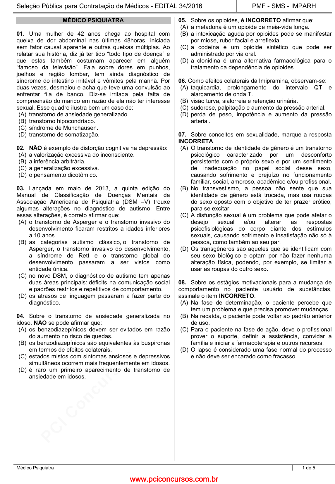 pcimarkpci MDAwMDowMDAwOjAwMDA6MDAwMDowMDAwOmZmZmY6YjEzMzo0YTBj:U3VuLCAyNyBPY3QgMjAyNCAxNDozNDoyNCAtMDMwMA== www.pciconcursos.com.br Seleção Pública para Contratação de Médicos - EDITAL 34/2016 PMF - SMS - IMPARH Médico Psiquiatra 1 de 5 MÉDICO PSIQUIATRA 01. Uma mulher de 42 anos chega ao hospital com queixa de dor abdominal nas últimas 48horas, iniciada sem fator causal aparente e outras queixas múltiplas. Ao relatar sua história, diz já ter tido “todo tipo de doença” e que estas também costumam aparecer em alguém “famoso da televisão”. Fala sobre dores em punhos, joelhos e região lombar, tem ainda diagnóstico de síndrome do intestino irritável e vômitos pela manhã. Por duas vezes, desmaiou e acha que teve uma convulsão ao enfrentar fila de banco. Diz-se irritada pela falta de compreensão do marido em razão de ela não ter interesse sexual. Esse quadro ilustra bem um caso de: (A) transtorno de ansiedade generalizado. (B) transtorno hipocondríaco. (C) síndrome de Munchausen. (D) transtorno de somatização. 02. NÃO é exemplo de distorção cognitiva na depressão: (A) a valorização excessiva do inconsciente. (B) a inferência arbitrária. (C) a generalização excessiva. (D) o pensamento dicotômico. 03. Lançada em maio de 2013, a quinta edição do Manual de Classificação de Doenças Mentais da Associação Americana de Psiquiatria (DSM –V) trouxe algumas alterações no diagnóstico de autismo. Entre essas alterações, é correto afirmar que: (A) o transtorno de Asperger e o transtorno invasivo do desenvolvimento ficaram restritos a idades inferiores a 10 anos. (B) as categorias autismo clássico, o transtorno de Asperger, o transtorno invasivo do desenvolvimento, a síndrome de Rett e o transtorno global do desenvolvimento passaram a ser vistos como entidade única. (C) no novo DSM, o diagnóstico de autismo tem apenas duas áreas principais: déficits na comunicação social e padrões restritos e repetitivos de comportamento. (D) os atrasos de linguagem passaram a fazer parte do diagnóstico. 04. Sobre o transtorno de ansiedade generalizada no idoso, NÃO se pode afirmar que: (A) os benzodiazepínicos devem ser evitados em razão do aumento no risco de quedas. (B) os benzodiazepínicos são equivalentes às buspironas em termos de efeitos colaterais. (C) estados mistos com sintomas ansiosos e depressivos simultâneos ocorrem mais frequentemente em idosos. (D) é raro um primeiro aparecimento de transtorno de ansiedade em idosos. 05. Sobre os opioides, é INCORRETO afirmar que: (A) a metadona é um opioide de meia-vida longa. (B) a intoxicação aguda por opioides pode se manifestar por miose, rubor facial e arreflexia. (C) a codeína é um opioide sintético que pode ser administrado por via oral. (D) a clonidina é uma alternativa farmacológica para o tratamento da dependência de opioides. 06. Como efeitos colaterais da Imipramina, observam-se: (A) taquicardia, prolongamento do intervalo QT e alargamento de onda T. (B) visão turva, sialorreia e retenção urinária. (C) sudorese, palpitação e aumento da pressão arterial. (D) perda de peso, impotência e aumento da pressão arterial. 07. Sobre conceitos em sexualidade, marque a resposta INCORRETA. (A) O transtorno de identidade de gênero é um transtorno psicológico caracterizado por um desconforto persistente com o próprio sexo e por um sentimento de inadequação no papel social desse sexo, causando sofrimento e prejuízo no funcionamento familiar, social, amoroso, acadêmico e/ou profissional. (B) No transvestismo, a pessoa não sente que sua identidade de gênero está trocada, mas usa roupas do sexo oposto com o objetivo de ter prazer erótico, para se excitar. (C) A disfunção sexual é um problema que pode afetar o desejo sexual e/ou alterar as respostas psicofisiológicas do corpo diante dos estímulos sexuais, causando sofrimento e insatisfação não só à pessoa, como também ao seu par. (D) Os transgêneros são aqueles que se identificam com seu sexo biológico e optam por não fazer nenhuma alteração física, podendo, por exemplo, se limitar a usar as roupas do outro sexo. 08. Sobre os estágios motivacionais para a mudança de comportamento no paciente usuário de substâncias, assinale o item INCORRETO. (A) Na fase de determinação, o paciente percebe que tem um problema e que precisa promover mudanças. (B) Na recaída, o paciente pode voltar ao padrão anterior de uso. (C) Para o paciente na fase de ação, deve o profissional prover o suporte, definir a assistência, convidar a família e iniciar a farmacoterapia e outros recursos. (D) O lapso é considerado uma fase normal do processo e não deve ser encarado como fracasso. www.pciconcursos.com.br pcimarkpci MDAwMDowMDAwOjAwMDA6MDAwMDowMDAwOmZmZmY6YjEzMzo0YTBj:U3VuLCAyNyBPY3QgMjAyNCAxNDozNDoyNCAtMDMwMA== www.pciconcursos.com.br Seleção Pública para Contratação de Médicos - EDITAL 34/2016 PMF - SMS - IMPARH Médico Psiquiatra 2 de 5 09. Uma paciente, em primeiro episódio depressivo, reaparece um ano após o início do tratamento com citalopram para a consulta de manutenção, preocupada com o fato de ter de “tomar a medicação para o resto da vida”. Qual é o risco de recorrência, caso interrompa o tratamento com o antidepressivo? (A) De 0% a 10%. (B) De 10% a 25%. (C) De 25% a 50%. (D) De 50% a 85%. 10. São indicações para o uso da eletroconvulsoterapia: (A) esquizofrenia, mania, síndrome neuroléptica maligna. (B) depressão, transtorno dissociativo, síndrome catatônica. (C) esquizofrenia, depressão, transtorno do pânico. (D) mania, transtorno do pânico, transtorno dissociativo. 11. Um paciente morador de rua, 54 anos, é levado à emergência por populares que queriam agredi-lo por comportamento agressivo e conduta inadequada. Relata história de alcoolismo, uso de substâncias e tratamento irregular de diabetes e hipertensão. Qual dos seguintes sintomas é mais específico para 