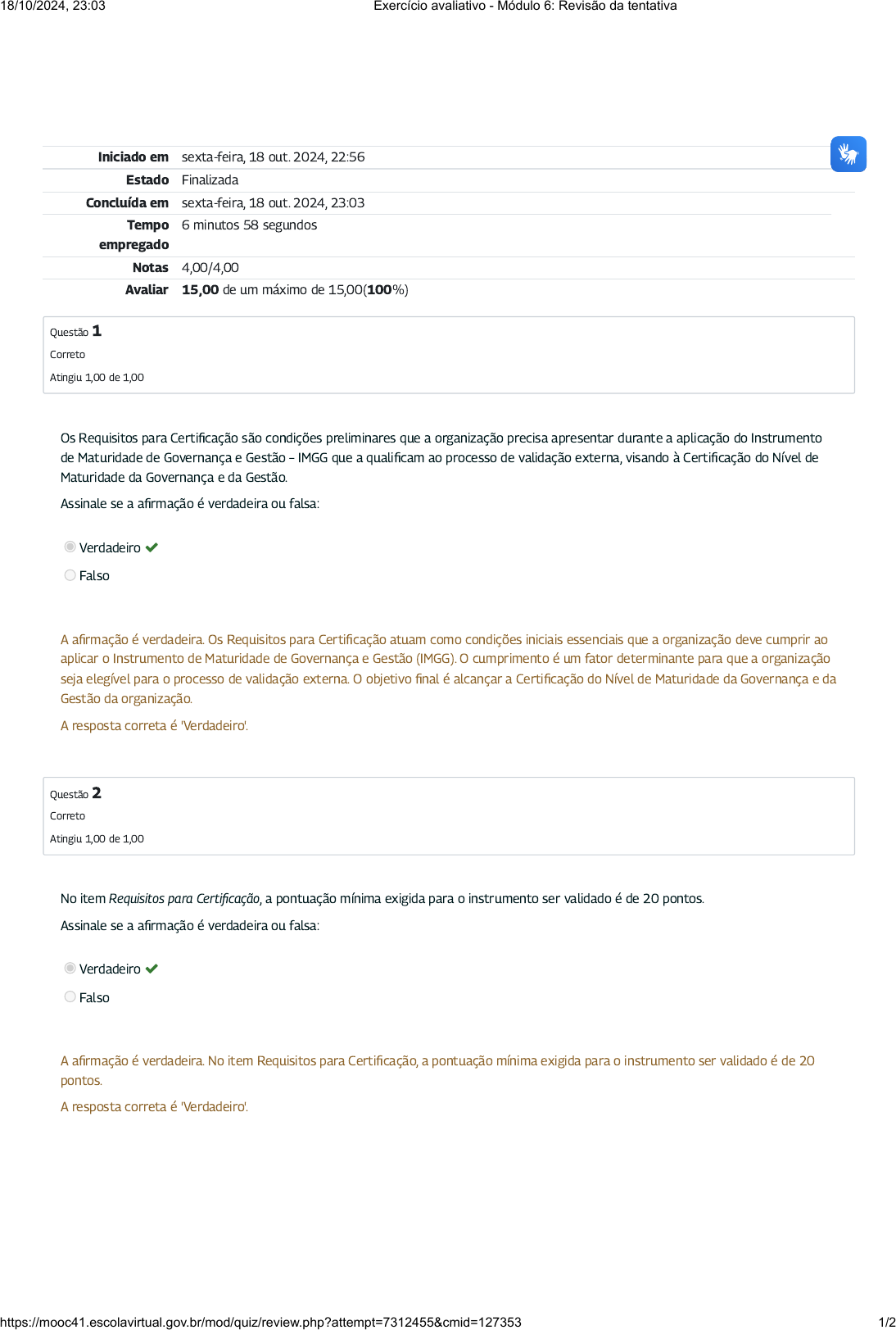 Iniciado em sexta-feira, 18 out. 2024, 22:56 Estado Finalizada Concluída em sexta-feira, 18 out. 2024, 23:03 Tempo empregado 6 minutos 58 segundos Notas 4,00/4,00 Avaliar 15,00 de um máximo de 15,00(100%) Questão 1 Correto Atingiu 1,00 de 1,00 Questão 2 Correto Atingiu 1,00 de 1,00 Os Requisitos para Certi�cação são condições preliminares que a organização precisa apresentar durante a aplicação do Instrumento de Maturidade de Governança e Gestão – IMGG que a quali�cam ao processo de validação externa, visando à Certi�cação do Nível de Maturidade da Governança e da Gestão. Assinale se a a�rmação é verdadeira ou falsa: Verdadeiro Falso A a�rmação é verdadeira. Os Requisitos para Certi�cação atuam como condições iniciais essenciais que a organização deve cumprir ao aplicar o Instrumento de Maturidade de Governança e Gestão (IMGG). O cumprimento é um fator determinante para que a organização seja elegível para o processo de validação externa. O objetivo �nal é alcançar a Certi�cação do Nível de Maturidade da Governança e da Gestão da organização. A resposta correta é 'Verdadeiro'. No item Requisitos para Certi�cação, a pontuação mínima exigida para o instrumento ser validado é de 20 pontos. Assinale se a a�rmação é verdadeira ou falsa: Verdadeiro Falso A a�rmação é verdadeira. No item Requisitos para Certi�cação, a pontuação mínima exigida para o instrumento ser validado é de 20 pontos. A resposta correta é 'Verdadeiro'. 18/10/2024, 23:03 Exercício avaliativo - Módulo 6: Revisão da tentativa https://mooc41.escolavirtual.gov.br/mod/quiz/review.php?attempt=7312455&cmid=127353 1/2 Questão 3 Correto Atingiu 1,00 de 1,00 Questão 4 Correto Atingiu 1,00 de 1,00 O sistema do Gestaopublicagov.br ativará, ao �nal do Relatório Preliminar de Melhoria de Governança e Gestão, somente no per�l do Presidente do Comitê de Aplicação, o botão de emissão da --------------------- e o botão para encaminhamento para a validação externa, conforme os resultados da aplicação do IMGG. Assinale a alternativa que completa corretamente a lacuna: a. Plano de Melhoria de Governança e Gestão. b. Instrumento de Melhoria da Gestão. c. Certi�cado do Nível de Maturidade de Governança e Gestão. d. Declaração de Aplicação. Sua resposta está correta. O sistema do Gestaopublicagov.br ativará, ao �nal do Relatório Preliminar de Melhoria de Governança e Gestão, somente no per�l do Presidente do Comitê de Aplicação, o botão de emissão da Declaração de Aplicação e o botão para encaminhamento para a validação externa, conforme os resultados da aplicação do IMGG. A resposta correta é: Declaração de Aplicação. Somente os órgãos e entidades que nas aplicações do IMGG obtiverem uma pontuação inferior a 51 pontos receberão uma declaração de sua aplicação, automaticamente, sem necessidade de validação externa. Julgue o enunciado como verdadeiro ou falso. Verdadeiro Falso Para todas as aplicações, o sistema do Gestaopublicagov.br ativará, ao �nal do Relatório Preliminar de Melhoria de Governança e Gestão, somente no per�l do Presidente do Comitê de Aplicação, o botão de emissão da Declaração de Aplicação. A resposta correta é 'Falso'. 18/10/2024, 23:03 Exercício avaliativo - Módulo 6: Revisão da tentativa https://mooc41.escolavirtual.gov.br/mod/quiz/review.php?attempt=7312455&cmid=127353 2/2